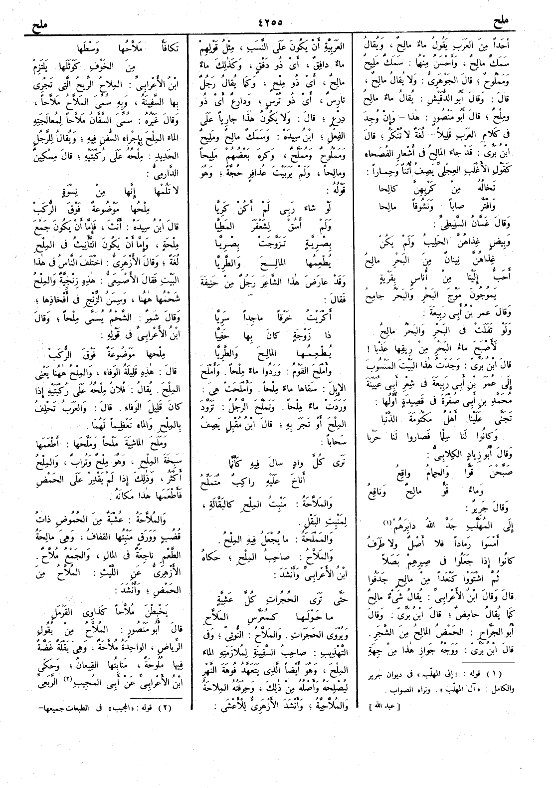 أَحداً من العرب يقول ماء مالح ويقال سَمك مالح وأَحسن منهما سَمك مَلِيح ومَمْلوح قال الجوهري ولا يقال مالح قال وقال أَبو الدُّقَيْش يقال ماء مالِح ومِلْحٌ قال أَبو منصور هذا وإِن وُجد في كلام العرب قليلاً لغة لا تنكر قال ابن بري قد جاء المالِح في أَشعار الفصحاء كقول الأَغْلَبِ العِجْلِيِّ يصف أُتُناً وحماراً تخالُه من كَرْبِهِنَّ كالِحا وافْتَرَّ صاباً ونَشُوقاً مالِحا وقال غَسَّان السَّلِيطيّ وبِيضٍ غِذاهُنَّ الحَليبُ ولم يكنْ غِذاهُنَّ نِينانٌ من البحر مالِحُ أَحَبُّ إِلينا من أُناسٍ بقَرْيةٍ يَموجُونَ مَوْجَ البحرِ والبحرُ جامحُ وقال عمر بن أَبي ربيعة ولو تَفلتْ في البحرِ والبحرُ مالحٌ لأَصْبَحَ ماءُ البحرِ من رِيقها عَذْبا قال ابن بري وجدت هذا البيت المنسوب إِلى عمر ابن أَبي ربيعة في شعر أَبي عُيَيْنَةَ محمد بن أَبي صُفْرة في قصيدة أَوّلها تَجَنَّى علينا أَهلُ مَكتومةَ الذَّنْبا وكانوا لنا سِلْماً فصاروا لنا حَرْبا وقال أَبو زِياد الكلابي صَبَّحْنَ قَوًّا والحِمامُ واقِعُ وماءُ قَوٍّ مالِحٌ وناقِعُ وقال جرير إِلى المُهَلَّبِ جَدَّ اللهُ دابِرَهُمْ أَمْسَوا رَماداً فلا أَصلٌ ولا طَرَفُ كانوا إِذا جَعَلوا في صِيرِهِمْ بِصَلاً ثم اشْتَوَوا كَنْعَداً من مالحٍ جَدَفوا قال وقال ابن الأَعرابي يقال شيء مالح كما يقال حامض قال ابن بري وقال أَبو الجَرَّاحِ الحَمْضُ المالح من الشجر قال ابن بري ووجه جواز هذا من جهة العربية أَن يكون على النسب مثل قولهم ماء دافق أَي ذو دَفْق وكذلك ماء مالح أَي ذو مِلْح وكما يقال رجل تارِسٌ أَي ذو تُرْس ودارِع أَي ذو دِرْع قال ولا يكون هذا جارياً على الفعل ابن سيده وسَمك مالح ومَليح ومَمْلوح ومُمَلَّح وكره بعضهم مَليحاً ومالحاً ولم يَرَ بيتَ عُذافِرٍ حُجَّةً وهو قوله لو شاءَ رَبي لم أَكُنْ كَرِيَّا ولم أَسُقْ لِشَعْفَرَ المَطِيَّا بِصْرِيَّةٍ تزوَّجت بِصْرِيَّا يُطْعِمُها المالحَ والطَّرِيَّا وقد عارض هذا الشاعرَ رجلٌ من حنيفة فقال أَكْرَيْتُ خَرْقاً ماجداً سَرِيَّا ذا زوجةٍ كان بها حَفِيَّا يُطْعِمُها المالِحَ والطَّرِيَّا وأَمْلَح القومُ وَرَدُوا ماء مِلْحاً وأَملَحَ الإِبلَ سقاها ماء مِلْحاً وأَمْلَحَتْ هي وردت ماء مِلْحاً وتَمَلَّحَ الرجلُ تَزَوَّدَ المِلْحَ أَو تَجَرَ به قال ابن مقبل يصف سحاباً تَرَى كلَّ وادٍ سال فيه كأَنما أَناخَ عليه راكبٌ مُتَمَلِّحُ والمَلاَّحَةُ مَنْبِتُ المِلْح كالبَقَّالة لمنبت البَقْل والمَمْلَحةُ ما يجعل فيه الملح والمَلاَّح صاحب المِلْح حكاه ابن الأَعرابي وأَنشد حتى تَرَى الحُجُراتِ كلَّ عَشِيَّةٍ ما حَوْلَها كمُعَرَّسِ المَلاَّحِ ويروى الحَجَرات والمَلاَّحُ النُّوتيّ وفي التهذيب صاحب السفينة لملازمته الماءَ المِلْح وهو أَيضاً الذي يتعهد فُوهَةَ النهر ليُصْلحه وأَصله من ذلك وحِرْفَتُه المِلاحَةُ والمُلاَّحِيَّةُ وأَنشد الأَزهري للأَعشى تَكافَأَ مَلاَّحُها وَسْطَها من الخَوْفِ كَوْثَلَها يَلتَزِمْ ابن الأَعرابي المِلاحُ الريح التي تجري بها السفينة وبه سمي المَلاَّحُ مَلاَّحاً وقال غيره سمي السَّفَّانُ مَلاَّحاً لمعالجته الماءَ المِلْحَ بإِجراء السفن فيه ويقال للرجل الحديد مِلْحُه على رُكْبتيه قال مِسكينٌ الدَّارِميّ لا تَلُمْها إِنها من نِسْوَةٍ مِلحُها مَوْضوعةٌ فوق الرُّكَبْ قال ابن سيده أَنث فإِما أَن يكون جمعَ مِلْحة وإِما أَن يكون التأْنيث في المِلْح لغة وقال الأَزهري اختلف الناس في هذا البيت فقال الأَصمعي هذه زِنجِيَّة والمِلْح شحمها ههنا وسِمَنُ الزِّنْج في أَفخاذها وقال شمر الشحم يسمى مِلْحاً وقال ابن الأَعرابي في قوله ملحُها موضوعة فوق الرُّكَبْ قال هذه قليلة الوفاء والمِلْحُ ههنا يعني المِلْحَ يقال فلان مِلْحُه على ركبتيه إِذا كان قليل الوفاء قال والعرب تحلف بالمِلْح والماء تعظيماً لهما ومَلَحَ الماشيةَ مَلْحاً ومَلَّحها أَطعمها سَبِ
