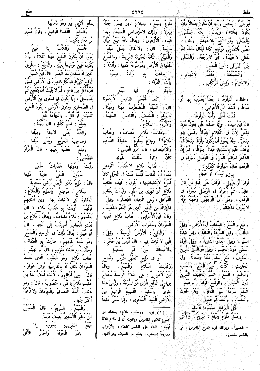 أَبو علي يحتمل وزْنُها أَن يكون مِفْعالاً وأَن يكون فِعْلاء ويقال بعتُه المَلَسَى والمَلَطَى وهو البيع بلا عُهْدَةٍ ويقال مضى فلان إِلى موضع كذا فيقال جعله اللّه مَلَطَى لا عُهْدَة أَي لا رجعة والمَلَطَى مثل المَرَطَى من العَدْوِ والمُتَمَلِّطَةُ مَقْعَد الاشْتِيامِ والاشْتِيامُ رَئيسُ الرُّكّابِ ( ملظ ) المِلْوَظُ عصا يضرب بها أَو سوط أَنشد ابن الأَعرابي ثُمَّتَ أَعْلى رأْسَه المِلْوَظَّا قال ابن سيده وإِنما حملته على فِعْوَلّ دون مِفعلّ لأَن في الكلام فِعْوَلأً وليس فيه مِفْعلّ وقد يجوز أَن يكون مِلْوَظٌ مِفْعلاً ثم يُوقَف عليه بالتشديد فيقال مِلوظّ ثم إِن الشاعر احتاج فأَجراه في الوصل مُجراه في الوقف فقال المِلوظّا كقوله ببازِلٍ وَجْناه أَو عَيْهَلِّ أَراد أَو عَيْهلٍ فوقف على لغة من قال خالدّ ثم أَجراه في الوصل مجراه في الوقف وعل أَيّ الوجهين وجَّهتَه فإِنه لا يُعرف اشتقاقه ( ملع ) المَلْعُ الذَّهابُ في الأَرض وقيل الطلَبُ وقيل السُّرْعةُ والخِفَّةُ وقيل شدة السير وقيل العَدْوُ الشديد وقيل فوق المشي دون الخَبَبِ وقيل هو السير السريع الخفيف مَلَعَ يَمْلَعُ مَلْعاً ومَلَعاناً وفي الحديث كنتُ أَسِيرُ المَلْعَ والخَبَبَ والوَضْعَ المَلْع السيْرُ الخفِيفُ السرِيعُ دون الخَبَبِ والوَضْعُ فوقه أَبو عبيد المَلْعُ سرعة سير الناقة وقد مَلَعَتْ وانْمَلَعَتْ وأَنشد أَبو عمرو فُتْلُ المَرافِقِ تَحْدُوها فَتَنْمَلِعُ وجمل مَلُوعٌ ومَيْلَعٌ سرِيعٌ والأُنثى مَلُوعٌ ومَيْلَعٌ ومِيلاعٌ نادر فيمن جعله فِيعالاً وذلك لاختصاص المصدر بهذا البناء الأَزهري ويقال ناقة مَيْلَعٌ مَيْلَقٌ سريعةٌ قال ولا يقال جمل مَيْلَعٌ والمَيْلَعُ الناقةُ الخفيفة السريعة وما أَسْرَع مَلْعَها في الأَرض وهو سُرْعَةُ عَنَقِها وأَنشد جاءَتْ به مَيْلَعةٌ طِمِرَّهْ وأَنشد الفراء وتَهْفُو بِهادٍ لَها مَيلَعٍ كما أَقْحَمَ القادِسَ الأَرْدَمُونا قال المَيْلَعُ المُضْطَرِبُ ههنا وههنا والمَيْلَعُ الخفيفُ والقادِسُ السفينةُ والأَرْدَمُ المَلاَّحُ وعُقابُ مَلاعٍ مضافٌ وعقابٌ مَلاعٌ