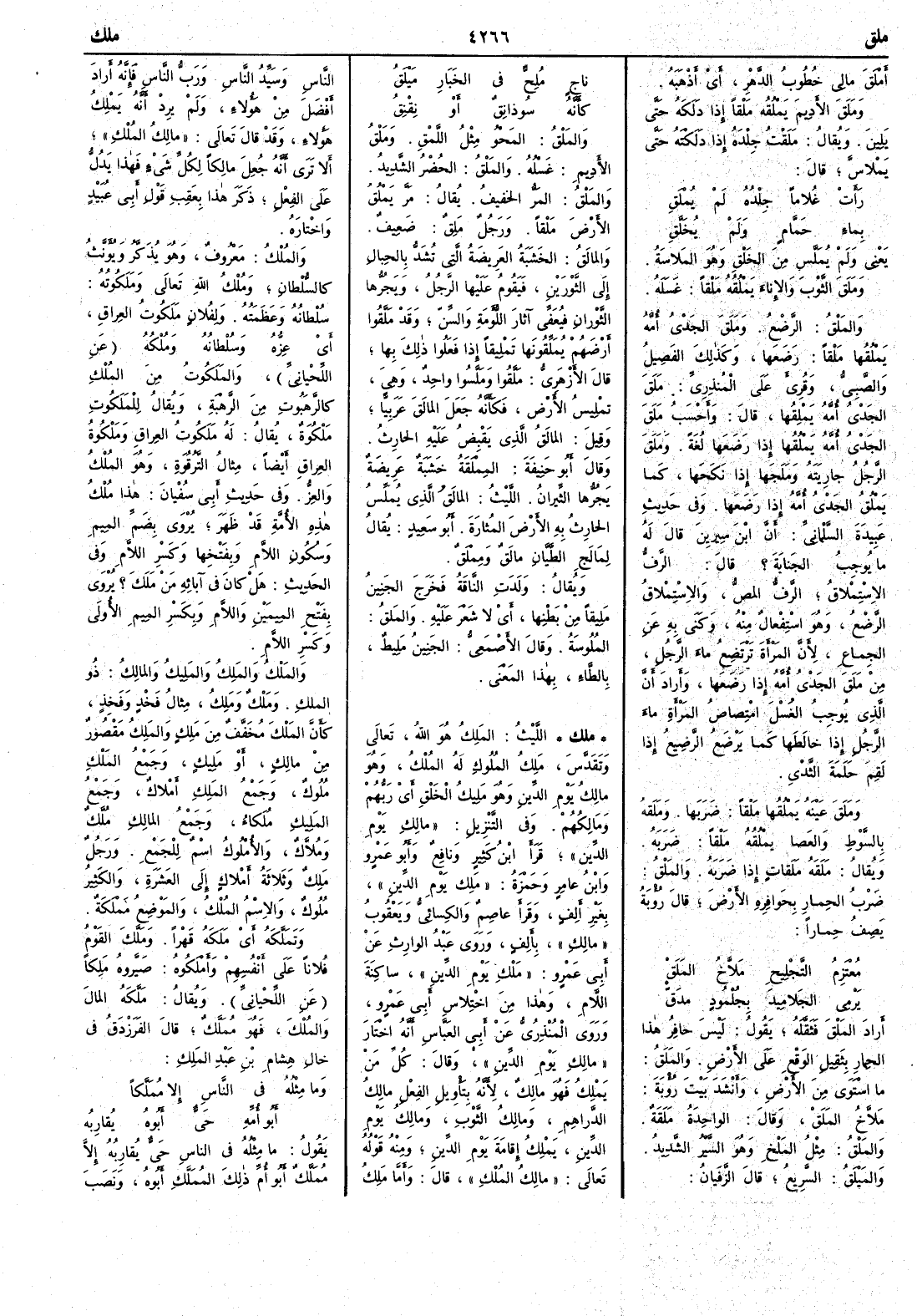 أَمْلَقَ مالي خُطُوبُ الدهر أَي أَذهبه ومَلَقَ الأَديمَ يَمْلُقه مَلْقاً إذاً دلكه حتى يلين ويقال مَلَقْتُ جلده إذا دلكته حتى يَمْلاسّ قال رأَت غلاماً جِلْدهُ لم يُمْلَقِ بماءٍ حَمَّامٍ ولم يُخَلَّقِ يعني ولم يُمَلَّس من الخَلْق وهو الملاسة ومَلَقَ الثوبَ والإناء يَمْلُقه مَلْقاً غسله والمَلْقُ الرضع ومَلَقَ الجَدْي أُمه يَمْلُقُها مَلْقاً رضعها وكذلك الفَصِيل والصبيّ وقرئ على المنذري مَلَقَ الجدي أُمه يَمْلِقُها قال وأَحسب مَلَقَ الجدي أُمه يَمْلُقها إذا رضعها لغة ومَلَقَ الرجل جاريته ومَلَجَها إذا نكحها كما يَمْلُق الجدي أُمه إذا رضعها وفي حديث عَبِيدَةَ السَّلْمانِيّ أَن ابن سيرين قال له ما يوجب الجنابة ؟ قال الرَّفّ والاسْتِمْلاقُ الرَّفّ المص والاسْتِملاق الرضع وهو اسْتِفْعال منه وكنى به عن الجماع لأن المرأة ترتضع ماء الرجل من مَلَق الجدي أُمه إذا رضعها وأَراد أَن الذي يوجب الغسل امتصاص المرأة ماء الرجل إذا خالطها كما يرضع الرضيع إذا لقم حَلَمة الثَّدْي ومَلَقَ عينه يَمْلُقُها مَلْقاً ضربها ومَلَقهُ بالسوط والعصا يَمْلُقه مَلْقاً ضربه ويقال مَلَقهُ مَلَقاتٍ إذا ضربه والمَلْقُ ضرب الحمار بحوافره الأرض قال رؤبة يصف حماراً مُعْتَزِم التَّجْليح مَلاَّخ المَلَقْ يَرْمي الجَلامِيدَ بجُلْمُودٍ مِدَقْ أَراد المَلْقَ فثقَّله يقول ليس حافر هذا الحمار بثقيل الوَقْع على الأرض والمَلَقُ ما استوى من الأرض وأَنشد بيت رؤبة مَلاَّخ المَلَقْ وقال الواحدة مَلَقَة والمَلْقُ مثل المَلْخِ وهو السير الشديد والمَيْلَقُ السريع قال الزفيان ناجٍ مُلحّ في الخَبَارِ مَيْلَقُ كأَنه سُوذانِقٌ أَو نِقْنِقُ والمَلْقُ المحو مثل اللَّمْقِ ومَلْقُ الأَدِيم غسله والمَلْقُ الحُضْر الشديد والمَلْقُ المَرّ الخفيف يقال مَرّ يَمْلُقُ الأَرض مَلْقاً ورجل مَلِقٌ ضعيف والمالَقُ الخشبة العريضة التي تشدّ بالحبال إلى الثَّوْرين فيقوم عليها الرجل ويجرها الثوران فيُعَفِّي آثار اللُّؤَمَةِ والسِّنّ وقد مَلَّقُوا أَرضهم يُمَلِّقُونها تَمْلِيقاً إذا فعلوا ذلك بها قال الأزهري مَلَّقوا ومَلَّسوا واحد وهي تملِّسُ الأرض فكأنه جعل المالَقَ عربيّاً وقيل المالَقُ الذي يقبض عليه الحارث وقال أَبو حنيفة المِمْلَقة خشبة عريضة يجرها الثيران الليث المالَقُ الذي يملّس الحارث به الأرض المُثارة أَبو سعيد يقال لمالَج الطَّيّان مالَقُ ومِمْلَقٌ ويقال ولدت الناقة فخرج الجنين مَلِيقاً من بطنها أَي لا شعر عليه والمَلقُ المِلوسة وقال الأَصمعي الجنين مَلِيطٌ بالطاء بهذا المعنى ( ملك ) الليث المَلِكُ هو الله تعالى ونقدّس مَلِكُ المُلُوك له المُلْكُ وهو مالك يوم الدين وهو مَلِيكُ الخلق أي ربهم ومالكهم وفي التنزيل مالك يوم الدين قرأ ابن كثير ونافع وأَبو عمرو وابن عامر وحمزة مَلِك يوم الدين بغير أَلف وقرأَ عاصم والكسائي ويعقوب مالك بأَلف وروى عبد الوارث عن أَبي عمرو مَلْكِ يوم الدين ساكنة اللام وهذا من اختلاس أبي عَمرو وروى المنذر عن أَبي العباس أَنه اختار مالك يوم الدين وقال كل من يَمْلِك فهو مالك لأنه بتأْويل الفعل مالك الدراهم ومال الثوب ومالكُ يوم الدين يَمْلِكُ إقامة يوم الدين ومنه قوله تعالى مالِكُ المُلْكِ قال وأما مَلِكُ الناس وسيد الناس ورب الناس فإنه أَراد أَفضل من هؤلاء ولم يريد أَنه يملك هؤلاء وقد قال تعالى مالِكُ المُلْك أَلا ترى أنه جعل مالكاً لكل شيءٍ فهذا يدل على الفعل ذكر هذا بعقب قول أَبي عبيد واختاره والمُلْكُ معروف وهو يذكر ويؤنث كالسُّلْطان ومُلْكُ الله تعالى ومَلَكُوته سلطانه وعظمته ولفلان مَلَكُوتُ العراق أي عزه وسلطانه ومُلْكه عن اللحياني والمَلَكُوت من المُلْكِ كالرَّهَبُوتِ من الرَّهْبَةِ ويقال للمَلَكُوت مَلْكُوَةٌ يقال له مَلَكُوت العراق ومَلْكُوةُ العراق أَيضاً مثال التَّرْقُوَةِ وهو المُلْكُ والعِزُّ وفي حديث أَبي سفيان هذا مُلْكُ هذه الأُمة ق
