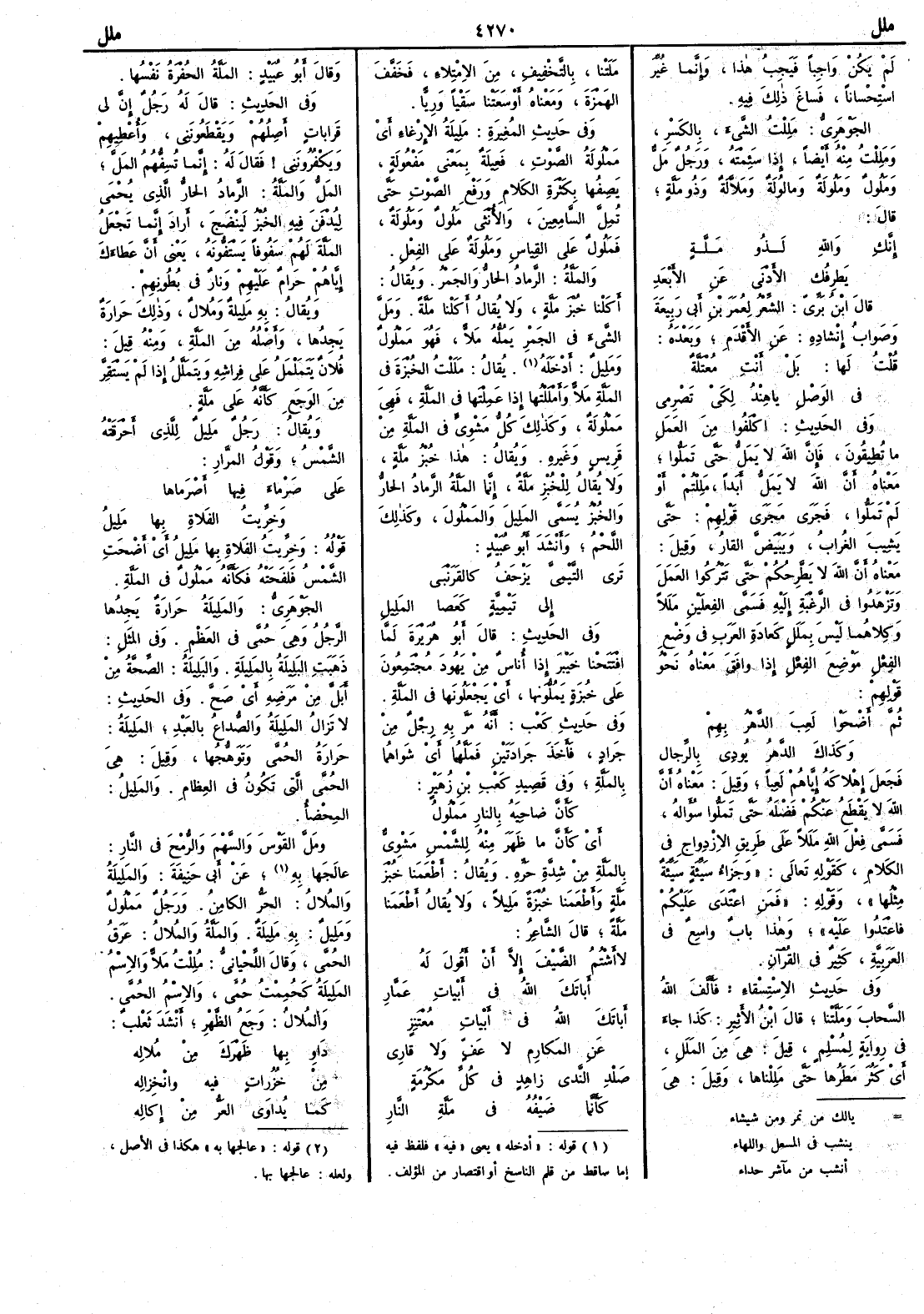 ( * قوله « ادخله » يعني فيه فلفظ فيه إما ساقط من قلم الناسخ او اقتصاراً من المؤلف ) يقال مَلَلْت الخُبرةَ في المَلَّة مَلاًّ وأَمْلَلْتها إِذا عمِلتها في المَلَّة فهي مَمْلولة وكذلك كل مَشْوِيّ في المَلَّة من قَريس وغيره ويقال هذا خُبز مَلَّةٍ ولا يقال للخبز مَلَّة إِنما المَلة الرَّماد الحارّ والخبز يسمى المَلِيل والمَمْلول وكذلك اللحمُ وأَنشد أَبو عبيد ترى التَّيْمِيَّ يَزْحَفُ كالقَرَنْبى إِلى تَيْمِيَّةٍ كعَصا المَلِيل وفي الحديث قال أَبو هريرة لما افتتَحْنا خَيبرَ إِذا أُناس من يَهُود مجتمعون على خُبزة يَمُلُّونها أَي يجعلونها في المَلَّة وفي حديث كعب أَنه مرَّ به رِجْل من جَراد فأَخذ جَرادَتين فمَلَّهما أَي شَواهما بالمَلَّة وفي قصيد كعب بن زهير كأَنَّ ضاحِيَهُ بالنار مَمْلولُ أَي كأَنَّ ما ظهر منه للشمس مَشْويّ بالمَلَّة من شدّة حرّه ويقال أَطعَمَنا خبز مَلَّةٍ وأَطعمَنا خبزة مَلِيلاً ولا يقال أَطعَمنا مَلَّة قال الشاعر لا أَشْتُم الضَّيْفَ إِلاّ أَنْ أَقولَ له أَباتَكَ الله في أَبيات عَمَّارِ أَباتَك الله في أَبيات مُعْتَنِزٍ عن المَكارِم لا عَفٍّ ولا قارِي صَلْدِ النَّدى زاهِدٍ في كل مَكْرُمة كأَنَّما ضَيْفُهُ في مَلَّة النارِ وقال أَبو عبيد المَلَّة الحُفْرة نفسها وفي الحديث قال له رجل إِنَّ لي قَراباتٍ أَصِلُهم ويَقْطَعُونَني وأُعْطِيهم ويَكْفُرونني فقال له إِنما تُسِفُّهم المَلَّ المَلُّ والمَلَّة الرّماد الحارّ الذي يُحْمى ليُدْفَن فيه الخبز ليَنْضَج أَراد إِنما تجعل المَلَّة لهم سَفُوفاً يَسْتَفُّونه يعني أَن عَطاءَك إِياهم حرام عليهم ونارٌ في بطونهم ويقال به مَلِيلة ومُلالٌ وذلك حَرارة يجدها وأَصله من المَلَّة ومنه قيل فلان يتململ على فِراشه ويتَمَلَّلُ إِذا لم يستقرّ من الوجع كأَنه على مَلَّة ويقال رجل مَلِيل للذي أَحرقته الشمس وقول المرار على صَرْماءَ فيها أَصْرَماها وخِرِّيتُ الفَلاة بِها مَلِيلُ قوله وخِرِّيتُ الفَلاةِ بها مَلِيلُ أَي أَضْحَت الشمس فلَفَحَتْه فكأَنه مَمْلول في المَلَّة الجوهري والمَلِيلة حَرارة يجدها الرجل وهي حُمَّى في العظم وفي المثَل ذهبت البَلِيلة بالمَلِيلة والبَلِيلة الصِّحَّة من أَبَلَّ من مَرَضه أَي صح وفي الحديث لا تَزال المَلِيلةُ والصُّداعُ بالعبد المَلِيلة حرارة الحُمَّى وتوهُّجُها وقيل هي الحُمَّى التي تكون في العظام والمَلِيلُ المِحْضَأْ ومَلَّ القَوْسَ والسهمَ والرمح في النار عالجها به