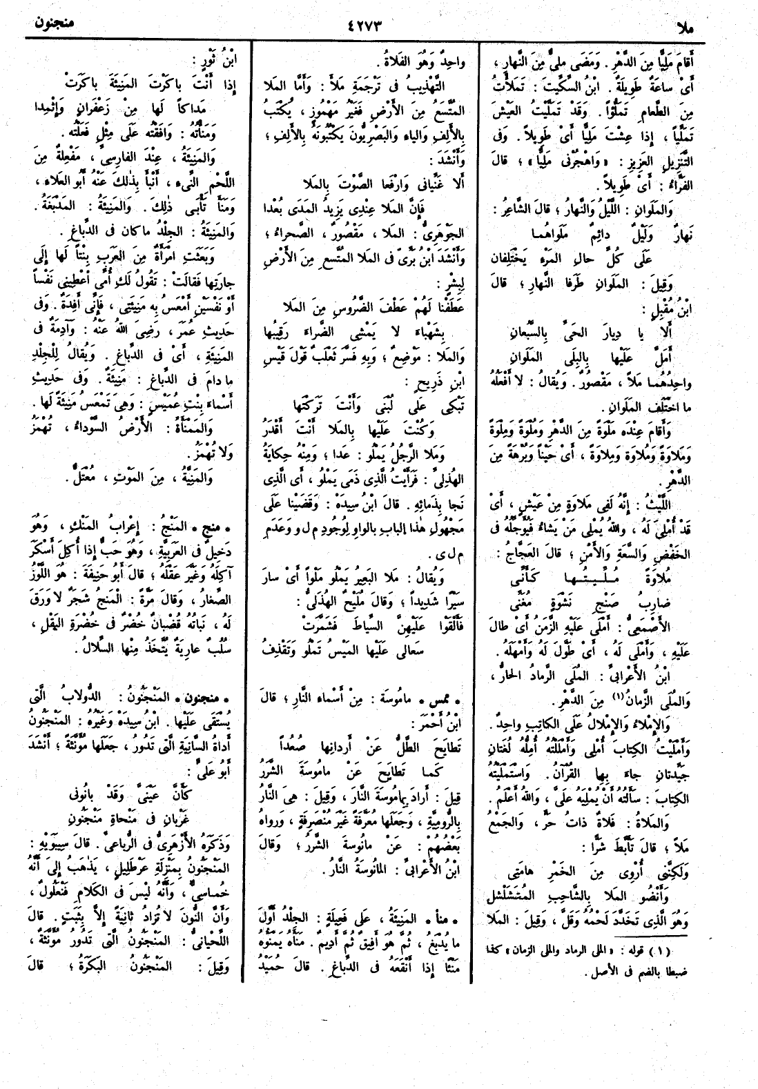 ( * وقوله « الملى الرماد والملى الزمان » كذا ضبطا بالضم في الأصل ) من الدهر والإِمْلاء والإِمْلالُ على الكاتب واحد وأَمْلَيْتُ الكتاب أُمْلي وأَمْلَلْتُه أُمِلُّه لغتان جَيِّدتان جاءَ بهما القرآن واستمليته الكتاب سأَلته أَن يُمْلِيَه عليَّ والله أَعلم والمَلاةُ فَلاة ذات حر ولجمع مَلاً قال تأَبَّط شرّاً ولَكِنَّني أُرْوي مِنَ الخَمْرِ هامَتي وأَنْضُو المَلا بالشَّاحِبِ المُتشَلْشِل وهو الذي تَخَدَّدَ لحمه وقلَّ وقي المَلا واحد وهو الفَلاةُ التهذيب في ترجمة ملأَ وأَما المَلا المُتَّسَعُ من الأَرض فغير مهموز يكتب بالأَلف والياء والبصريون يكتبونه بالأَلف وأَنشد أَلا غَنِّياني وارْفَعا الصَّوْتَ بالمَلا فإِنَّ المَلا عِنْدي يَزيدُ المَدى بُعْدا الجوهري المَلا مقصور الصَّحراء وأَنشد ابن بري في المَلا المُتَّسعِ من الأَرض لبشر عَطَفْنا لهم عَطْفَ الضَّرُوسِ مِنَ المَلا بِشَهْباء لا يَمْشِي الضَّراءَ رَقِيبُها والمَلا موضع وبه فسر ثعلب قول قيس بن ذَريح تبكِي على لُبْنى وأَنْتَ تَرَكْتَها وكُنْتَ عَلَيْها بالمَلا أَنْتَ أَقْدَرُ ومَلا الرجلُ يَمْلُو عَدا ومنه حكاية الهذلي فرأَيتُ الذي ذَمى يَمْلو أَي الذي نَجا بذَمائه قال ابن سيده وقضينا على مجهول هذا الباب بالواو لوجود م ل و وعدم م ل ي ويقال مَلا البعيرُ يَمْلُو مَلْواً أَي سارَ سيراً شديداً وقال مُلَيْح الهذلي فأَلْقَوْا عَلَيْهِنَّ السِّياطَ فَشَمَّرَتْ سَعالى عَليْها المَيْسُ تَمْلُو وتَقْذِفُ