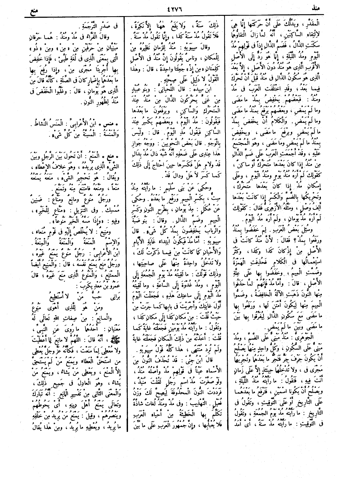 المقدّر ويدلك على أن حركتها إِنما هي لالتقاء الساكنين أَنه لما زال التقاؤهما سكنت الذال فضمُّ الذال إِذاً في قولهم مذ اليوم ومذ الليلة إِنما هو رد إِلى الأَصل الأَقرب الذي هو منذ دون الأَصل إِلى بعد الذي هو سكون الذال في منذ قبل أَن تحرك فيما بعد وقد اختلفت العرب في مذ ومنذ فبعضهم يخفض بمذ ما مضى وما لم يمض وبعضهم يرفع بمنذ ما مضى وما لم يمض والكلام أَن يخفض بمذ ما لم يمض ويرفع ما مضى ويخفض بمنذ ما لم يمض وما مضى وهو المجتمع عليه وقد أَجمعت العرب على ضم الذال من منذ إِذا كان بعدها متحرك أَو ساكن كقولك لم أَره منذ يوم ومنذ اليوم وعلى اسكان مذ إِذا كانت بعدها أَلف وصل ومثله الأَزهري فقال كقولك لم أَره مذ يومان ولم أَره مذ اليوم وسئل بعض العرب لم خفضوا بمنذ ورفعوا بمذ فقال لأَن منذ كانت في الأَصل من إِذ كان كذا وكذا وكثر استعمالها في الكلام فحذفت الهمزة وضمت الميم وخفضوا بها على علة الأَصل قال وأَما مذ فإِنهم لما حذفوا منها النون ذهبت الآلة الخافضة وضموا الميم منها ليكون أَمتن لها ورفعوا بها ما مضى مع سكون الذال ليفرقوا بها بين ما مضى وبين ما لم يمض الجوهري منذ مبني على الضم ومذ مبني على السكون وكل واحد منهما يصلح أَن يكون حرف جر فتجر ما بعدهما وتجريهما مجرى في ولا تدخلهما حينئذ إِلا على زمان أَنت فيه فتقول ما رأَيته منذ الليلة ويصلح أَن يكونا اسمين فترفع ما بعدهما على التاريخ أَو على التوقيت وتقول في التاريخ ما رأَيته مذ يومُ الجمعة وتقول في التوقيت ما رأَيته مذ سنةٌ أَي أَمد ذلك سنة ولا يقع ههنا إِلا نكرة فلا تقول مذ سنةُ كذا وإِنما تقول مذ سنةٌ وقال سيبويه منذ للزمان نظيره من للمكان وناس يقولون إِن منذ في الأَصل كلمتان « من إِذ » جعلتا واحدة قال وهذا القول لا دليل على صحته ابن سيده قال اللحياني وبنو عبيد من غنيّ يحركون الذال من منذ عند المتحرك والساكن ويرفعون ما بعدها فيقولون مذُ اليومُ وبعضهم يكسر عند الساكن فيقول مذِ اليومُ قال وليس بالوجه قال بعض النحويين ووجه جواز هذا عندي على ضعفه أَنه شبَّه ذال مذ بدال قد ولام هل فكسرها حين احتاج إِلى ذلك كما كسر لام هل ودال قد وحكي عن بني سليم ما رأَيته مِنذ سِتٌّ بكسر الميم ورفع ما بعده وحكي عن عكل مِذُ يومان بطرح النون وكسر الميم وضم الذال وقال بنو ضبة والرباب يخفضون بمذ كل شيء قال سيبويه أَما مذ فيكون ابتداء غاية الأَيام والأَحيان كما كانت من فيما ذكرت لك ولا تدخل واحدة منهما على صاحبتها وذلك قولك ما لقيته مذ يوم الجمعة إِلى اليوم ومذ غدوةَ إِلى الساعة وما لقيته مذ اليومِ إِلى ساعتك هذه فجعلت اليوم أَول غايتك وأَجْرَيْتَ في بابها كما جرت من حيث قلت من مكان كذا إِلى مكان كذا وتقول ما رأَيته مذ يومين فجعلته غاية كما قلت أَخذته من ذلك المكان فجعلته غاية ولم ترد منتهى هذا كله قول سيبويه قال ابن جني قد تحذف النون من الأَسماء عيناً في قولهم مذ وأَصله منذ ولو صغرت مذ اسم رجل لقلت مُنَيْذ فرددت النون المحذوفة ليصح لك وزن فُعَيْل التهذيب وفي مذ ومنذ لغات شاذة تكلم بها الخَطِيئَة من أَحياء العرب فلا يعبأُ بها وإِن جمهور العرب على ما بين في صدر الترجمة وقال الفراء في مذ ومنذ هما حرفان مبنيان من حرفين من من ومن ذو التي بمعنى الذي في لغة طيء فإِذا خفض بهما أُجريتا مُجْرى من وإِذا رفع بهما ما بعدهما بإِضمارٍ كان في الصلة كأَنه قال من الذي هو يومان قال وغلَّبوا الخفض في منذ لظهور النون