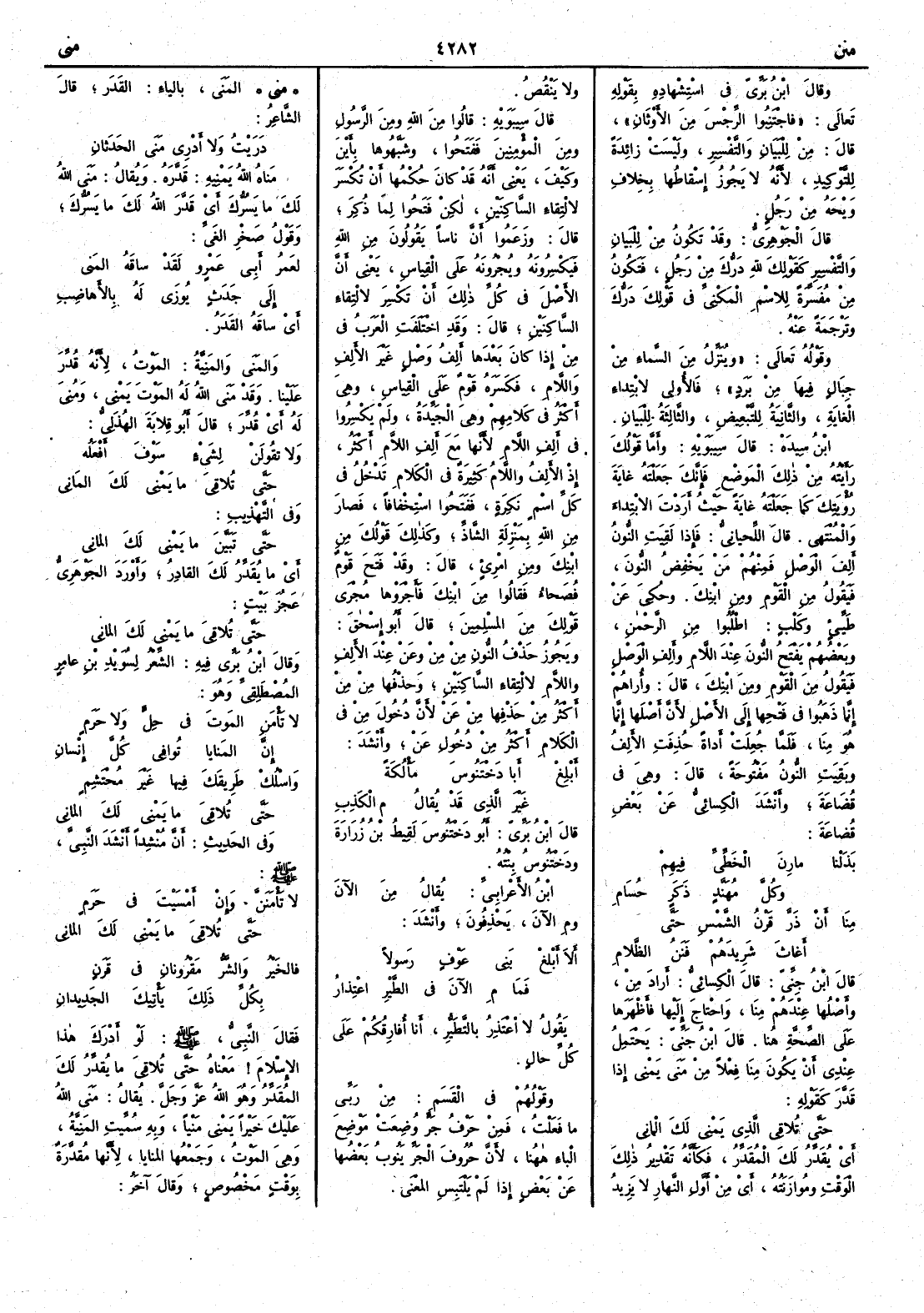 ( مني ) المَنى بالياءِ القَدَر قال الشاعر دَرَيْتُ ولا أَدْري مَنى الحَدَثانِ مَناهُ الله يَمْنِيه قدَّره ويقال مَنى اللهُ لك ما يسُرُّك أَي قَدَّر الله لك ما يَسُرُّك وقول صخر الغيّ لعَمرُ أَبي عمرو لقَدْ ساقَه المَنى إِلى جَدَثٍ يُوزَى لهُ بالأَهاضِبِ أَي ساقَه القَدَرُ والمَنى والمَنِيَّةُ الموت لأَنه قُدِّر علينا وقد مَنى الله له الموت يَمْني ومُنِي له أَي قُدِّر قال أَبو قِلابة الهذلي ولا تَقُولَنْ لشيءٍ سَوْفَ أَفْعَلُه حتى تُلاقِيَ ما يَمْني لك المَاني وفي التهذيب حتى تبَيّنَ ما يَمْني لك الماني أَي ما يُقَدِّر لك القادر وأَورد الجوهري عجز بيت حتى تُلاقَي ما يَمْني لك الماني وقال ابن بري فيه الشعر لسُوَيْد بن عامرٍ المُصْطلِقي وهو لا تَأْمَنِ المَوتَ في حَلٍّ ولا حَرَمٍ إِنَّ المَنايا تُوافي كلَّ إِنْسانِ واسْلُكْ طَريقَكَ فِيها غَيْرَ مُحْتَشِمٍ حتَّى تُلاقَي ما يَمْني لك الماني وفي الحديث أَن منشداً أَنشد النبي صلى الله عليه وسلم لا تَأْمَنَنَّ وإِنْ أَمْسَيْتَ في حَرَمٍ حتى تلاقَي ما يمني لك الماني فالخَيْرُ والشَّرُّ مَقْرونانِ في قَرَنٍ بكُلِّ ذلِكَ يأْتِيكَ الجَدِيدانِ فقال النبي صلى الله عليه وسلم لو أَدرك هذا الإِسلام معناه حتى تُلاقَي ما يُقدِّر لكَ المُقَدِّرُ وهو الله عز وجل يقال مَنى الله عليك خيراً يَمْني مَنْياً وبه سميت المَنِيَّةُ وهي الموت وجمعها المَنايا لأَنها مُقدَّرة بوقت مخصوص وقال آخر