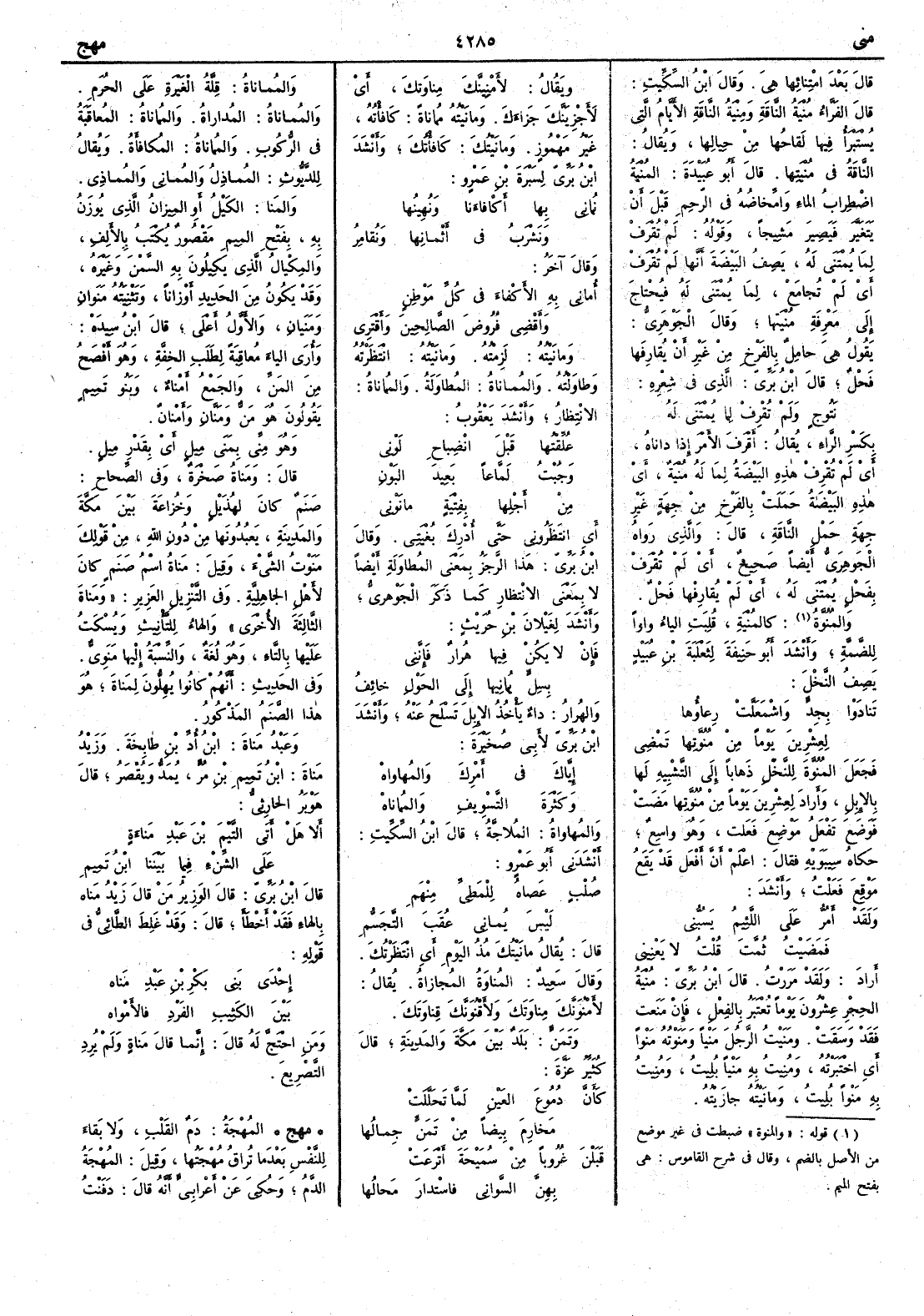 ( * قوله « والمنوة » ضبطت في غير موضع من الأصل بالضم وقال في شرح القاموس هي بفتح الميم ) كالمُنْية قلبت الياء واواً للضمة وأَنشد أَبو حنيفة لثعلبة بن عبيد يصف النخل تَنادَوْا بِجِدٍّ واشْمَعَلَّتْ رِعاؤها لِعِشْرينَ يَوماً من مُنُوَّتِها تَمْضِي فجعل المُنوَّة للنخل ذهاباً إِلى التشبيه لها بالإِبل وأَراد لعشرين يوماً من مُنوَّتها مَضَتْ فوضع تَفعل موضع فَعلت وهو واسع حكاه سيبويه فقال اعلم أَن أَفْعَلُ قد يقع موضع فَعَلْت وأَنشد ولَقَدْ أَمُرُّ على اللئيم يَسُبُّني فَمَضَيْتُ ثُمَّت قلتُ لا يَعْنِيني أَراد ولقد مَرَرْتُ قال ابن بري مُنْية الحِجْر عشرون يوماً تعتبر بالفعل فإِن مَنَعت فقد وسَقَتْ ومَنَيْت الرجل مَنْياً ومَنَوْتُه مَنْواً أَي اختبرته ومُنِيتُ به مَنْياً بُلِيت ومُنِيتُ به مَنْواً بُلِيت ومانَيْتُه جازَيْتُه ويقال لأَمْنِينَّك مِناوَتَك أَي لأَجْزِيَنَّك جزاءك ومانَيْته مُماناة كافأْته غير مهموز ومانَيْتُك كافأْتك وأَنشد ابن بري لسَبْرة بن عمرو نُماني بها أَكْفاءَنا ونُهينُها ونَشْرَبُ في أَثْمانِها ونُقامِرُ وقال آخر أُماني به الأَكْفاء في كلِّ مَوْطِنٍ وأَقْضِي فُروضَ الصَّالِحينَ وأَقْتَري ومانَيْتُه لَزِمْته ومانَيْتُه انْتَظَرْتُه وطاوَلْتُه والمُماناة المُطاولةُ والمُماناةُ الانْتِظار وأَنشد يعقوب عُلِّقْتُها قَبْلَ انْضِباحِ لَوْني وجُبْتُ لَمَّاعاً بَعِيدَ البَوْنِ مِنْ أَجْلِها بفِتْيةٍ مانَوْني أَي انتَظَرُوني حتى أُدْرِك بُغْيَتي وقال ابن بري هذا الرجز بمعنى المُطاولة أَيضاً لا بمعنى الانتظار كما ذكر الجوهري وأَنشد لغَيْلان بن حُريث فإِنْ لا يَكُنْ فيها هُرارٌ فإِنَّني بسِلٍّ يُمانِيها إِلى الحَوْلِ خائفُ والهُرار داءٌ يأْخذ الإِبل تَسْلَح عنه وأَنشد ابن بري لأَبي صُخَيْرة إِيَّاكَ في أَمْركَ والمُهاواةْ وكَثْرةَ التَّسْويفِ والمُماناهْ والمُهاواةُ المُلاجَّةُ قال ابن السكيت أَنشدني أَبو عمرو صُلْبٍ عَصاه للمَطِيِّ مِنْهَمِ ليسَ يُماني عُقَبَ التَّجَسُّمِ قال يقال مانَيْتُك مُذُ اليومِ أَي انتظرتك وقال سعيد المُناوة المُجازاة يقال لأَمْنُوَنَّكَ مِناوَتَك ولأَقْنُوَنَّك قِناوَتَكَ وتَمَنٍّ بلد بين مكة والمدينة قال كثير عزة كأَنَّ دُموعَ العَيْنِ لما تَحَلَّلَتْ مَخارِمَ بِيضاً مِنْ تَمَنٍّ جِمالُها قَبَلْنَ غُروباً مِنْ سُمَيْحَةَ أَتْرَعَتْ بِهِنَّ السَّواني فاسْتدارَ مَحالُها والمُماناةُ قِلَّة الغَيرةِ على الحُرَمِ والمُماناةُ المُداراةُ والمُماناةُ المُعاقَبةُ في الرُّكوب والمُماناةُ المكافأَةُ ويقال للدَّيُّوث المُماذِلُ والمُماني والمُماذِي والمَنا الكَيْلُ أَو المِيزانُ الذي يُوزَنُ به بفتح الميم مقصور يكتب بالأَلف والمِكيال الذي يَكِيلون به السَّمْن وغيره وقد يكون من الحديد أَوزاناً وتثنيته مَنَوانِ ومَنَيانِ والأَوَّل أَعلى قال ابن سيده وأُرى الياء معاقبة لطلب الخفة وهو أَفصح من المَنِّ والجمع أَمْناء وبنو تميم يقولون هو مَنٌّ ومَنَّانِ وأَمْنانٌ وهو مِنِّي بِمَنَى مِيلٍ أَي بقَدْرِ مِيلٍ قال ومَناةُ صخرة وفي الصحاح صنم كان لهُذَيْل وخُزاعَة بين مكة والمدينة يَعْبُدونها من دون الله من قولك مَنَوتُ الشيء وقيل مَناةُ اسم صَنَم كان لأَهل الجاهلية وفي التنزيل العزيز ومَناةَ الثَّالِثَةَ الأُخرى والهاء للتأْنيث ويُسكت عليها بالتاءِ وهو لغة والنسبة إِليها مَنَوِيٌّ وفي الحديث أَنهم كانوا يُهِلُّون لمَناة هو هذا الصنم المذكور وعبدُ مناةَ ابن أُدِّ بن طابِخَة وزيدُ مَناةَ ابن تَميم بن مُرٍّ يمد ويقصر قال هَوْبَر الحارِثي أَلا هل أَتَى التَّيْمَ بنَ عَبْدِ مَناءَةٍ على الشِّنْءِ فيما بَيْنَنا ابنُ تَمِيمِ قال ابن بري قال الوزير من قال زيدُ مَناه بالهاء فقد أَخطأَ قال وقد غلط الطائي في قوله إِحْدَى بَني بَكْرِ بنِ عَبْدِ مَناه بَينَ الكئيبِ الفَرْدِ فالأَمْو