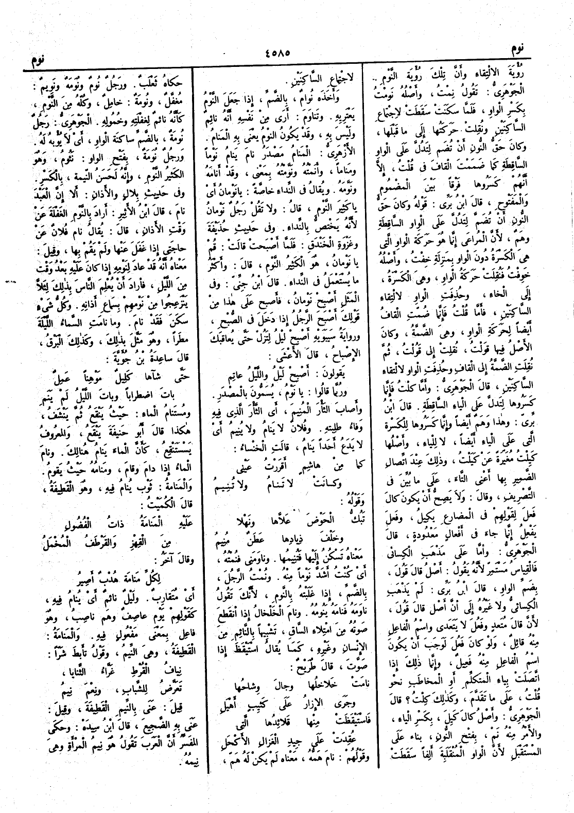 رؤْية الالتقاء وأَن تلك رؤْية النَّوْم الجوهري تقول نِمْت وأََصله نَوِمْت بكسر الواو فلما سكنت سقطت لاجتماع الساكنين ونُقِلتْ حركتُها إِلى ما قبلها وكان حقُّ النون أَن تُضَمَّ لتَدُلَّ على الواو الساقطة كما ضَمَمْت القاف في قلت إِلا أَنهم كسروها فَرْقاً بين المضموم والمفتوح قال ابن بري قوله وكانَ حَقُّ النون أَن تُضَمَّ لتدلَّ على الواو الساقطة وهَمٌ لأَن المُراعى إِنما هو حركة الواو التي هي الكسرةُ دون الواو بمنزلة خِفْت وأَصله خَوِفْت فنُقِلت حركة الواو وهي الكسرة إِلى الخاء وحُذفت الواو لالتقاء الساكنين فأَما قُلت فإِنما ضُمَّت القاف أَيضاً لحركة الواو وهي الضمة وكان الأَصل فيها قَوَلْت نُقِلتْ إِلى قوُلت ثم نقِلت الضمة إلى القاف وحُذِفَت الواو لالتقاء الساكنين قال الجوهري وأَما كِلْتُ فإِنما كسروها لتدل على الياء الساقطة قال ابن بري وهذا وَهَمٌ أَىضاً وإِنما كسروها للكسرة التي على الياء أَيضاً لا للياء وأَصلها كَيِلْت مُغَيَّرة عن كَيَلْتُ وذلك عند اتصال الضمير بها أَعني التاء على ما بُيِّن في التصريف وقال ولا يصح أَن يكون كالَ فَعِل لقولهم في المضارع يَكيلُ وفَعِلَ يَفْعِلُ إِنما جاء في أَفعال معدودة قال الجوهري وأَما على مذهب الكسائي فالقياسُ مستمرٌّ لأَنه يقول أَصلُ قال قَوُلَ بضم الواو قال ابن بري لم يذهب الكسائي ولا غيرهُ إِلى أَنَّ أَصلَ قال قَوُل لأَن قال مُتَعدٍّ وفَعُل لا يَتعدَّى واسم الفاعل منه قائلٌ ولو كان فَعُل لوجب أَن يكون اسم الفاعل منه فَعيل وإِنما ذلك إِذا اتصلت بياء المتكلم أَو المخاطب نحو قُلْت على ما تقدم وكذلك كِلْت قال الجوهري وأَصل كالَ كَيِلَ بكسر الياء والأَمر منه نَمْ بفتح النون بِناءً على المستقبل لأَن الواو المنقلبة أَلفاً سقطت لاجتماع الساكنين وأَخَذه نُوامٌ بالضم إِذا جعَل النَّوْمُ يَعْترِيه وتَناوَمَ أَرى من نفْسه أَنه نائمٌ وليس به وقد يكون النَّوْم يُعْنى به المَنامُ الأَزهري المَنامُ مصدر نامَ يَنامُ نَوْماً ومَناماً وأَنَمْتُه ونَوَّمْتُه بمعنىً وقد أَنامَه ونَوَّمه ويقال في النداء خاصة يا نَوْمانُ أَي يا كثير النَّوْم قال ولا فَقُل رجل نَوْمانُ لأَنه يختص بالنداء وفي حديث حنيفة وغزوة الخَنْدق فلما أَصْبَحتْ قالت قُمْ يا نَوْمانُ هو الكثير النَّوْم قال وأَكثر ما يستعمل في النداء قال ابن جني وفي المثَل أَصْبِحْ نَوْمانُ فأَصْبحْ على هذا من قولك أَصبَح الرجلُ إِذا دخل في الصُّبح ورواية سيبويه أَصْبِحْ ليْلُ لِتَزُلْ حتى يُعاقِبَك الإِصباح قال الأَعشى يقولون أَصْبِحْ ليْلُ والليلُ عاتِم وربما قالوا يا نَوْمُ يُسَمُّون بالمصدر وأَصابَ الثَّأْرَ المُنِيم أَي الثأْر الذي فيه وَفاءُ طِلْبتِه وفلان لا يَنامُ ولا يُنيمُ أَي لا يَدَعُ أَحداً يَنام قالت الخنساء كما مِنْ هاشمٍ أَقرَرْت عَيْني وكانَتْ لا تَنامُ ولا تُنِيمُ وقوله تَبُكُّ الحَوْضَ عَلاَّها ونَهْلا وخَلْفَ ذِيادِها عَطَنٌ مُنيمُ معناه تسكُن إِليها فتُنيمُها وناوَمَني فنُمْتُه أَي كنتُ أَشدَّ نَوْماً منه ونُمْتُ الرجلَ بالضم إِذا غَلَبْتَه بالنَّوْم لأَنك تقول ناوَمَه فنامَه يَنُومُه ونامَ الخَلخالُ إِذا انقَطعَ صوتُه من امتلاء الساق تشبيهاً بالنائم من الإِنسان وغيره كما يقال اسْتَيْقَظَ إِذا صَوَّت قال طُرَيح نامَتْ خَلاخِلُها وجالَ وشاحُها وجَرى الإِزارُ على كثِيبٍ أَهْيَلِ فاسْتَيْقَظَتْ منها قَلائدُها التي عُقِدَت على جِيدِ الغَزالِ الأَكْحَلِ وقولهم نامَ هَمُّه معناه لم يكن له هَمٌّ حكاه ثعلب ورجل نُوَمٌ ونُوَمةٌ ونَوِيمٌ مُغفَّل ونُومةٌ خاملٌ وكله من النَّوْم كأَنه نائمٌ لغَفْلَتِه وخُموله الجوهري رجل نُومة بالضم ساكنة الواو أَي لا يُؤْبَه له ورجل نُوَمةٌ بفتح الواو نَؤُوم وهو الكثير النَّوْم إِنه لَحَسنُ النِّيمة بالكسر وفي حديث بِلالٍ والأَذان أَلا إِن العبدَ نام قال ابن الأَثير أَراد بالنَّوْمِ الغفلةَ ع