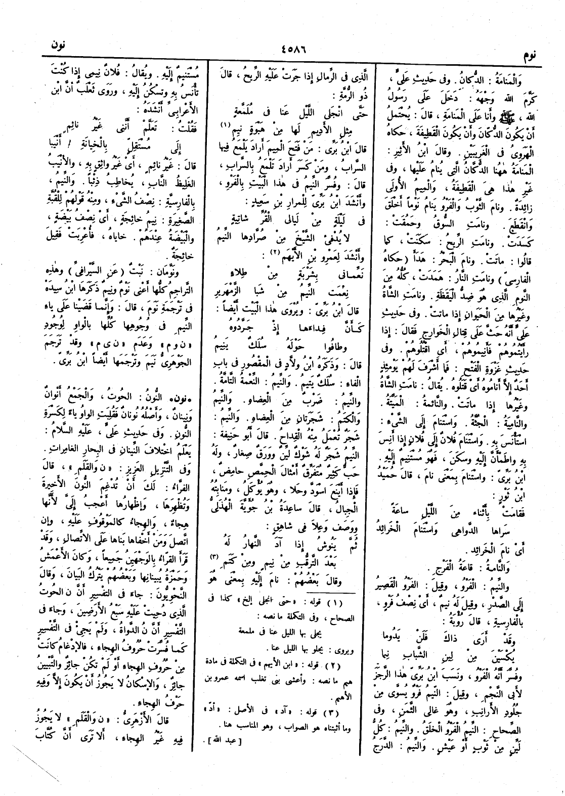 نَعِّماني بشَرْبةٍ من طِلاءٍ نِعْمَت النِّيمُ من شَبا الزَّمْهَريرِ قال ابن بري ويروى هذا البيت أَيضاً كأَنَّ فِداءَها إِذ جَرَّدوه وطافوا حَوْلَه سُلَكٌ ينِيمُ قال وذكره ابن وَلاَّدٍ في المقصور في باب الفاء سُلَكَ يَتيمُ والنِّيمُ النِّعْمةُ التامّةُ والنِّيم ضربٌ من العِضاهِ والنِّيمُ والكتَمُ شجرتان من العِضاه والنِّيمُ شجر تُعْمَل منه القِداحُ قال أَبو حنيفة النِّيمُ شجرٌ له شوك ليِّنٌ وورَقٌ صِغارٌ وله حبٌّ كثير متفرق أَمثال الحِمَّص حامِضٌ فإِذا أَيْنَع اسْوَدَّ وحَلا وهو يؤكل ومَنابِتُه الجبالُِ قال ساعدة بن جُؤيّة الهذلي ووَصَف وَعِلاً في شاهق ثم يَنُوش إِذا آدَ النهارُ له بعدَ التَّرَقُّبِ من نِيمٍ ومن كَتَم وقال بعضهم نامَ إِليه بمعنى هو مُستْنيِم إِليه ويقال فلانٌ نِىمِي إِذا كنات تأْنَسُ به وتسْكُن إِليه وروى ثعلب أَن ابن الأَعرابي أَنشده فقلتُ تَعَلَّمْ أَنَّني غيرُ نائِم إِلى مُستَقِلٍّ بالخِيانةِ أَنْيَبا قال غير نائم أَي غيرُ واثقٍ به والأَنْيبُ الغليظُ الناب يخاطب ذئباً والنِّيمُ بالفارسية نِصْفُ الشيء ومنه قولُهم للقُبَّة الصغيرة نِيمُ خائجة أَي نصفُ بَيْضةٍ والبيضة عندهم خاياه فأُعربت فقيل خائجة ونَوَّمان نَبْتٌ عن السيرافي وهذه التراجِمُ كلّها أَعني نوم ونيم ذكرها ابن سيده في ترجمة نوم قال وإِِنما قضينا على ياء النِّيم في وجوهها كلها بالواو لوجود « ن و م » وعدم « ن ي م » وقد ترجم الجوهري نيم وترجمها أَيضاً ابن بري( نون ) : النُّونُ : الحوت والجمع أَنْوانٌ و نِينانٌ وأَصله نُونانٌ فقلبت الواو ياء لكسرة النون . وفي حديث علي عليه السلام : يعلم اختِلافَ النِّينانِ في البحار الغامِراتِ . وفي التنزيل العزيز : { ن والقلم } قال الفراء : لك أَن تدغم النون الأَخيرة وتظهرها وإِظهارها أَعجب إِليَّ لأَنها هجاء والهجاء كالموقوف عليه وإِن اتصل ومن أَخفاها بناها على الاتصال وقد قرأَ الفراء بالوجهين جميعاً وكان الأَعمش وحمزة يبينانها وبعضهم يترك البيان وقال النحويون : جاء في التفسير أَنَّ ن الحوتُ الذي دُحِيَت عليه سبعُ الأَرضين وجاء في التفسير أَنَّ ن الدَّواةُ ولم يجىء في التفسير كما فسرت حروف الهجاء فالإِدغام كانت من حروف الهجاء أَو لم تكن جائز والتبيين جائز والإِسكان لا يجوز أَن يكون إِلا وفيه حرف الهجاء قال الأَزهري : ن والقلم لا يجوز فيه غير الهجاء أَلا ترى أَن كُتَّاب