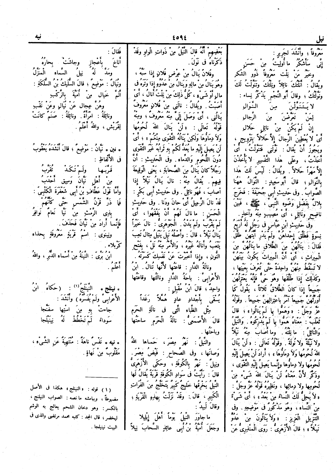 معروفاً وأَنشد لجرير إِني سأَشكُر ما أُوليت من حَسَن وخيرُ مَنْ نِلْت معروفاً ذَوو الشكر ويقال أَنَلْتُك نائلاً ونِلْتكَ وتَنَوَّلْتُ لك ونَوَّلْتك وقال أَبو النجم يذكر نساء لا يَتَنَوَّلْنَ من النَّوَالِ لِمَنْ تعرَّضْنَ من الرِّجالِ إِنْ لم يكن من نائلٍ حَلالِ أَي لا يُعْطِين الرجال إِلا حلالاً بتزويج ويجوز أَن يقال نَوَّلَني فَتَوَّلْت أَي أَخذْت وعلى هذا التفسير لا يأْخُذْن إِلاَّ مهراً حلالاً ويقال ليس لك هذا بالنَّوَال قال أَبو سعيد النَّوَال ههنا الصواب وفي حديث أَبي جُحيفة فحرج بلالٌ بفَضْل وَضوء النبي صلى الله عليه وسلم فَبَيْن ناضِحٍ ونائلٍ أَي مصيبٍ منه وآخِذٍ وفي حديث ابن عباس في رَجُل له أَربعُ نِسوةٍ فطلَّق إِحداهنّ ولم يَدْر أَيَّتَهُنَّ طلَّق فقال يَنالُهُن من الطلاق ما يَنالهنّ من الميراث أَي أَن المِيراث يكون بينهن لا تسقط منهن واحدة حتى تُعرَف بعينها وكذلك إِذا طلَّقها وهو حيٌّ فإِنه يعتزلهنّ جميعاً إِذا كان الطلاق ثلاثاً يقول كما أُورِّثُهنَّ جميعاً آمرُ باعتزالهنَّ جميعاً وقوله عزَّ وجل وهَمُّوا بما لم يَنالوا قال ثعلب معناه هَمُّوا بما لم يُدْرِكوه والنَّيْل والنائِل ما نِلْته وما أَصاب منه نَيْلاً ولا نَيْلةً ولا نُولة وقوله تعالى لَن ينَالَ اللهَ لُحومُها ولا دِماؤها أَراد لن يَصِل إِليه لحومُها ولا دماؤها وإِنما يصِل إِليه التَّقْوَى وذكَّر لأَن معناه لن ينال الله شيءٌ من لُحومِها ولا دِمائِها ونظيره قوله عز وجل لا يَحِلُّ لك النساءُ من بعدُ أَي شيء من النساء وهو مذكور في موضعه وفي التنزيل العزيز ولا يَنالون من عدوٍّ نَيْلاً قال الأَزهري روى المنذري عن بعضهم أَنه قال النَّيْل من ذوات الواو وقد ذكرناه في نول وفلان يَنالُ من عِرْضِ فلان إِذا سَبَّه وهو يَنال من ماله ويَنال من عدوِّه إِذا وَتَرَه في مالٍ أَو شيء كل ذلك من نِلْت أَنالُ أَي أَصَبْت ويقال نالَني من فلان معروف يَنالُني أَي وَصَل إِليّ منه معروف ومنه قوله تعالى لن يَنال اللهَ لُحومُها ولا دِماؤها ولكن يَناله التَّقوَى منكم أَي لن يصِل إِليه ما يُعدُّ لكم به ثَوابه غير التقوَى دون اللُّحوم والدِّماء وفي الحديث أَن رجُلاً كان يَنال من الصحابة يعني الوقيعة فيهم يقال منه نال يَنال نَيْلاً إِذا أَصاب فهو نائل وفي حديث أَبي بكر قد نالَ الرحيلُ أَي حانَ ودَنا وفي حديث الحسن ما نالَ لهم أَن يَفْقَهوا أَي لم يقرُبْ ولم يَدْن الجوهري نالَ خيراً يَنال نَيْلاً قال وأَصله نَيِل يَنْيَل مثال تعِب يتعَب وأَناله غيره والأَمرُ منه نَلْ بفتح النون وإِذا أَخبرت عن نفسك كسرته ونالةُ الدار قاعَتُها لأَنها تُنال ابن الأَعرابي باحةُ الدار ونالَتُها وقاعَتُها واحد قال ابن مقبل يُسقَى بأَجْدادِ عادٍ هُمَّلاً رَغَداً مثل الظِّباء التي في نالَةِ الحَرَم قال الأَصمعي نالةُ الحرَم ساحتها وباحتُها والنِّيل نهر مصر حماها الله وصانها وفي الصحاح فيض مصر ونِيل نهر بالكوفة وحكى الأَزهري قال رأَيت في سواد الكوفة قرية يقال لها النِّيل يَخْرِقُها خَلِيج كبير يَتَخَلَّج من الفُرَات الكبير قال وقد نزلت بهذه القرية وقال لبيد ما جاوَزَ النِّيلُ يوماً أَهل إِبْلِيلاً وجعل أُمية بن أَبي عائذ السَّحاب نِيلاً فقال أَناخُ بأَعْجازٍ وجاشَتْ بِحارُه ومَدَّ له نِيلُ السماء المنزَّلُ ونُيَال موضع قال السُّلَيك بن السُّلَكة أَلَمَّ خَيالٌ من أُميَّة بالرَّكْبِ وهُنَّ عِجالٌ من نُيَالٍ وعن نَقْبِ ونائِلةُ امرأَة ونائلةُ صنم كانت لقريش والله أَعلم ( نين ) : نَيَّانُ : موضع قال أَنشده يعقوب في الأَلفاظ : قَرَّبَها ولم تَكَدْ تُقَرَّبُ من أَهلِ نَيَّانَ وَسِيقُ أَحْدَبُ وأَما قول عَطَّاف بن أَبي شَعْفَرة الكلبي : فما ذَرَّ قَرْنُ الشمسِ حتى كأَنهم بذي الرِّمْثِ من نَيَّا نَعامٌ نَوافِرُ فإِنما أَراد من نَيّانَ فحذف . و نِينَوَى : اسم قرية معروفة بِحذاء كَرْبلاء . ابن بري : النِّينَةُ من أَسماء ال