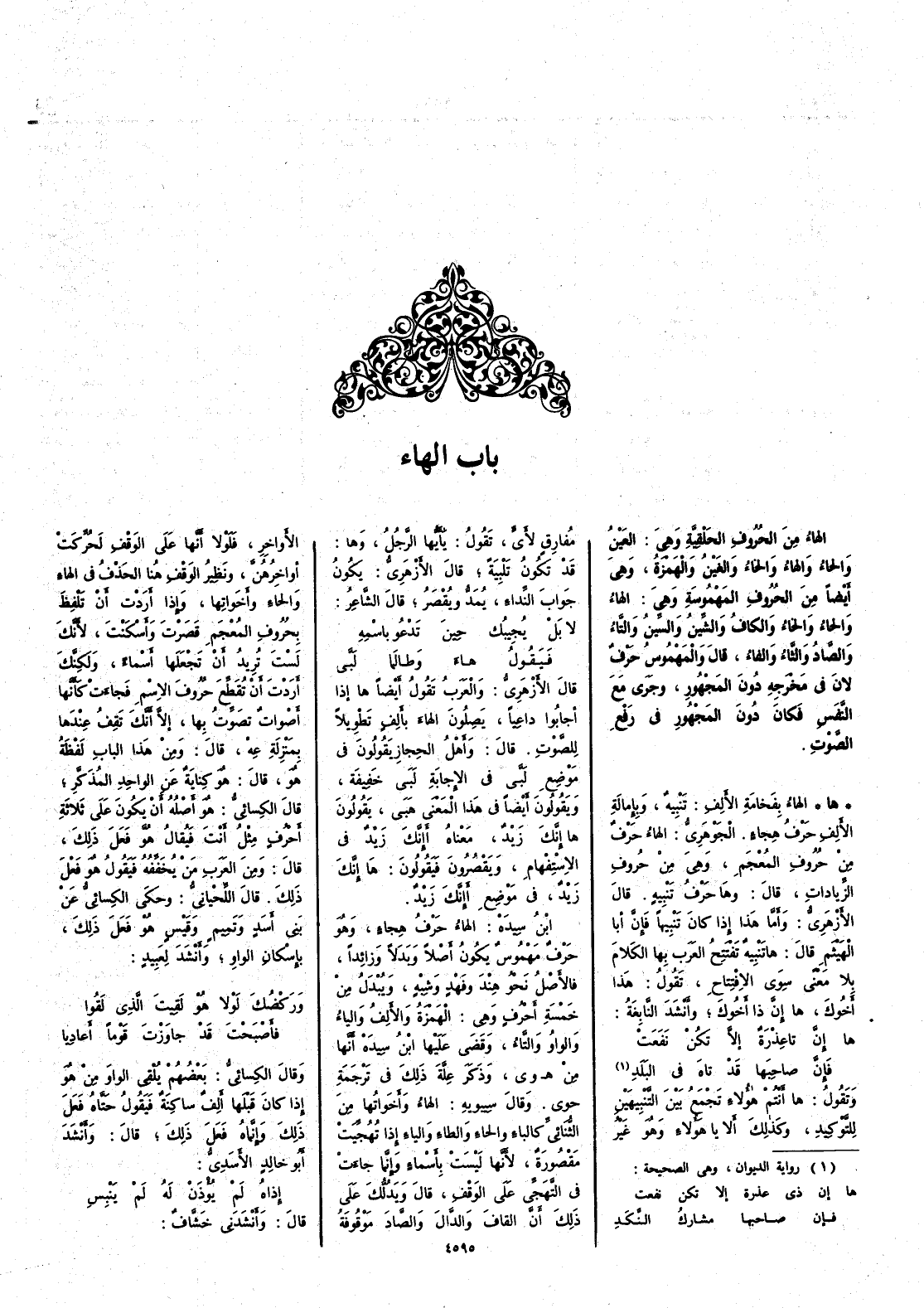 الهاء من الحروف الحلقية وهي العين والحاء والهاء والخاء والغين والهمزة وهي أَيضاًمن الحروف المهموسة وهي الهاء والحاء والخاء والكاف والشين والسين والتاء والصاد والثاء والفاء قال والمهموس حرف لانَ في مَخْرجه دون المَجْهور وجرى مع النَّفَس فكان دون المجهور في رفع الصوت (ها) الهاء بفخامة الأَلف تنبيهٌ وبإمالة الأَلف حرفُ هِجاء الجوهري الهاء حرف من حروف المُعْجَمِ وهي من حُروف الزِّيادات قال وها حرفُ تنبيه قال الأَزهري وأَما هذا إِذا كان تنْبيهاً فإِن أَبا الهيثم قال ها تَنْبِيهٌ تَفْتَتِحُ العرب بها الكلام بلا معنى سوى الافتتاح تقولُ هذا أَخوك ها إِنَّ ذا أَخُوكَ وأَنشد النابغة ها إِنَّ تا عِذْرةٌ إِلاَّ تَكُنْ نَفَعَتْ فإِنَّ صاحِبَها قد تَاهَ في البَلَدِ