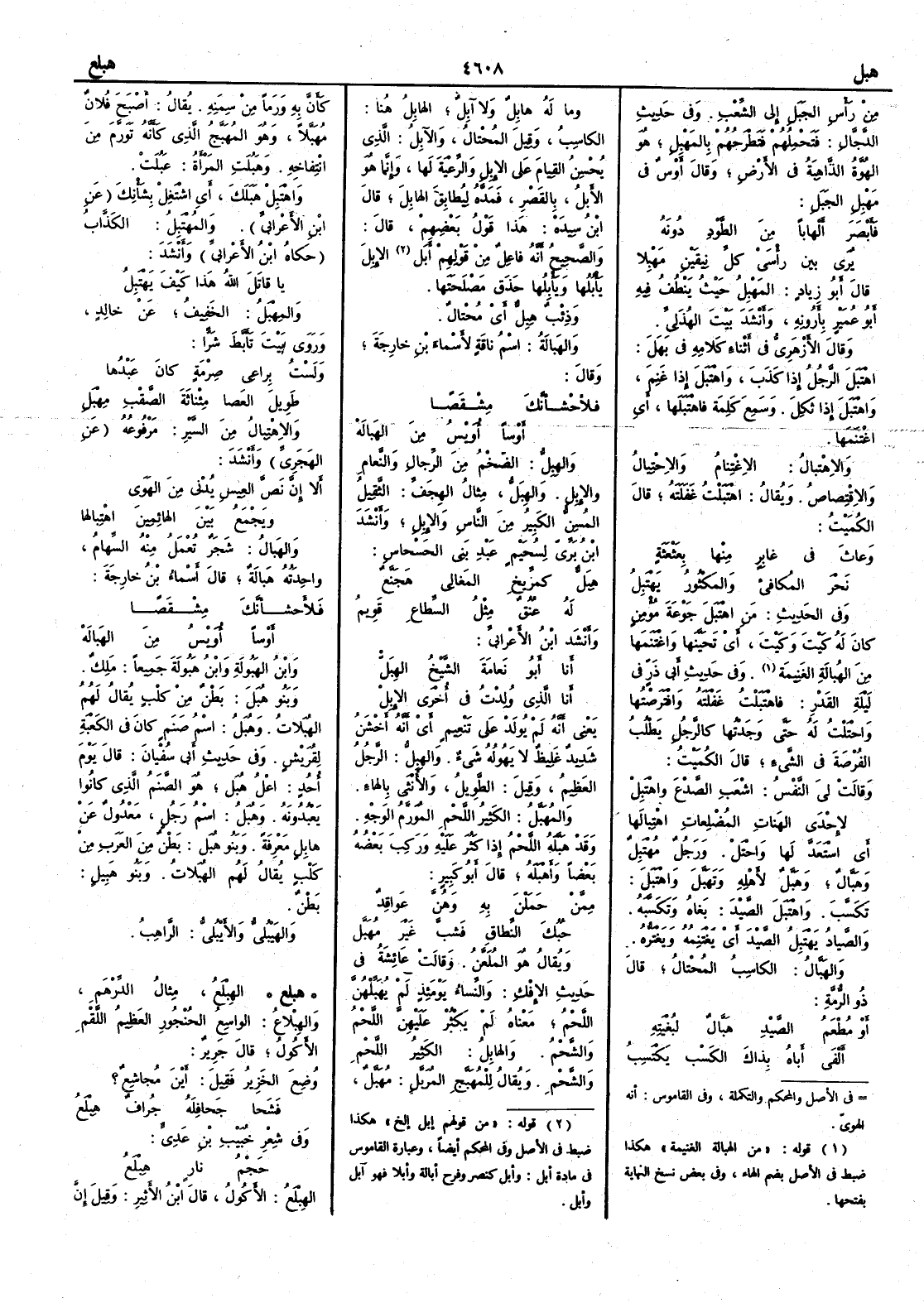 من رأْس الجبل إِلى الشِّعْب . وفي حديث الدجال : فتحمِلهم فتطْرَحهم بالمَهْبل هو الهُوَّة الذاهبةُ في الأَرض وقال أَوس في مَهْبِل الجبل : فأَبْصَرَ أَلْهاباً من الطَّوْدِ دونه يرى بين رأْسَيْ كلِّ نِيقَيْنِ مَهْبِلا قال أَبو زياد : المَهْبِل حيث يَنْطُفُ فيه أَبو عُمَيْرٍ بِأَرونِه وأَنشد بيت الهُذلي . وقال الأَزهري في أَثناء كلامه في بهل : اهتبل الرجل إِذا كذَب و اهْتَبل إِذا غَنِم و اهْتَبَل إِذا ثَكِل . وسمع كلمةً فاهْتَبَلَها أَي اغْتَنَمها . و الاهْتِبال : الاغْتِنام والاحْتيال والاقْتِصاص . ويقال : اهْتَبَلْت غَفلته قال الكُميت : وعاثَ في غابر منها بعَثْعَثةٍ نَحْرَ المُكافىء والمَكْثُورُ يَهْتَبِلُ وفي الحديث : من اهْتَبَل جَوْعةَ مؤمنٍ كان له كَيْت وكَيْت أَي تَحَيَّنَها واغْتَنَمها من الهُبالة الغَنيمة . وفي حديث أَبي ذرَ في ليلة القدر : فاهْتَبَلْت غَفْلته وافْتَرَصْتها واحتلْت له حتى وجدتها كالرجُل يطلب الفُرْصة في الشيء قال الكميت : وقالت ليَ النَّفسُ : اشعَبِ الصَّدْعَ واهْتَبِلْ لإِحْدى الهَناتِ المُضْلِعاتِ اهْتِبالَها أَي استعدَّ لها واحْتَلْ . ورجل مُهْتَبِل و هَبَّال و هَبَّل لأَهله و تَهَبَّل و اهْتَبَل : تكسَّب . و اهْتَبَل الصيد : بَغاه وتكسَّبه . والصَّياد يَهْتَبِل الصيدَ أَي يَغْتَنِمُه ويغترُّه . و الهَبَّال : الكاسِب المُخْتال قال ذو الرمة : أَو مُطْعَمُ الصَّيْدِ هَبَّالُ لبُغْيَتِه أَلفى أَباهُ بذاك الكَسْب يكتسِبُ وما له هابِلٌ ولا آبل الهابل هنا : الكاسِب وقيل المُحْتال والآبِل : الذي يُحْسِن القيامَ على الإِبل والرِّعْيةَ لها وإِنما هو الأَبِل بالقصر فمدّه ليُطابِق الهابِل قال ابن سيده : هذا قول بعضهم قال : والصحيح أَنه فاعِل من قولهم أَبَل الإِبِلَ يأْبُلها ويأْبِلُها حذَق مصلحتها : وذئب هِبِلٌّ أَي مُحْتال . و الهَبَالةُ : اسم ناقةٍ لأَسماء بن خارجة وقال : فَلأَحْشَأَنَّكَ مِشْقَصاً أَوْساً أُوَيْسُ من الهَبالَهْ و الهِبِلُّ : الضَّخْم من الرجال والنَّعام والإِبل . و الهِبَلُّ مثال الهِجَفِّ : الثقيل المُسِنُّ الكبير من الناس والإِبل وأَنشد ابن بري لسُحَيم عبد بني الحَسحاس : هِبَلُّ كمِرِّيخِ المَغالِي هَجَنَّعٌ له عُنُق مثل السِّطاعِ قَوِيمُ وأَنشد ابن الأَعرابي : أَنا أَبو نَعامة الشيخُ الهِبَلّ أَنا الذي وُلِدْت في أُخْرى الإِبِلْ يعني أَنه لم يولد على تَنْعيم أَي أَنه أَخشنُ شديد غليظ لا يَهُوله شيء . و الهِبلُّ : الرجل العظيم وقيل : الطويل والأُنثى بالهاء . و المُهَبَّل : الكثير اللحم المُوَرَّم الوجْه . وقد هَبَّله اللحم إِذا كثُر عليه وركب بعضُه بعضاً و أَهْبَله قال أَبو كبير : مِمَّن حَمَلْنَ به وهُنَّ عواقِدٌ حُبُكَ النِّطاقِ فَشبَّ غير مُهَبَّلِ ويقال هو المُلَعَّن . وقالت عائشة في حديث الإِفْك : والنِّساء يومئذ لم يُهَبِّلْهنَّ اللحمُ معناه لم يكثر عليهن اللحم والشَّحمُ . و الهابِلُ : الكثير اللحم والشحْم . ويقال للمُهَبَّج المُرَبَّل : مُهَبَّل كأَنَّ به ورَماً من سِمَنه . يقال : أَصبح فلان مُهبَّلاً وهو المُهَبَّجُ الذي كأَنه تورَّم من انْتِفاخه . و هَبُلتِ المرأَة : عَبُلت . و اهْتَبِل هَبَلَك أَي اشتغِل بشأْنِك عن ابن الأَعرابي و المُهْتَبِل : الكذاب حكاه ابن الأَعرابي وأَنشد : يا قاتَل اللَّهُ هذا كيف يَهْتَبِلُ و المِهْبَل : الخفيف عن خالد وروى بيت تأَبَّط شرّاً : ولستُ بِراعي صِرْمةٍ كان عَبْدُها طويلَ العَصا مِئْناثةَ الصَّقْبِ مِهْبَلِ و الاهْتِبال من السير : مرفوعه عن الهجري وأَنشد : أَلا إِنَّ نَصَّ العِيسِ يُدْني من الهَوَى ويَجْمَع بين الهائمينَ اهْتِبالُها و الهَبال : شجر تُعمَل منه السِّهام واحدته هَبالة قال أَسماء بن خارجة : فَلأَحْشأَنَّك مِشْقَصاً أَوساً أُوَيْسُ من الهَبالهْ و ابنُ الهَبُولة و ابن هَبُولَة جميعاً : ملِك . و بَنُو هُبَل : بَطْن من كلْب يقال لهم الهُبَلات . و هُبَل : اسم صَنَ