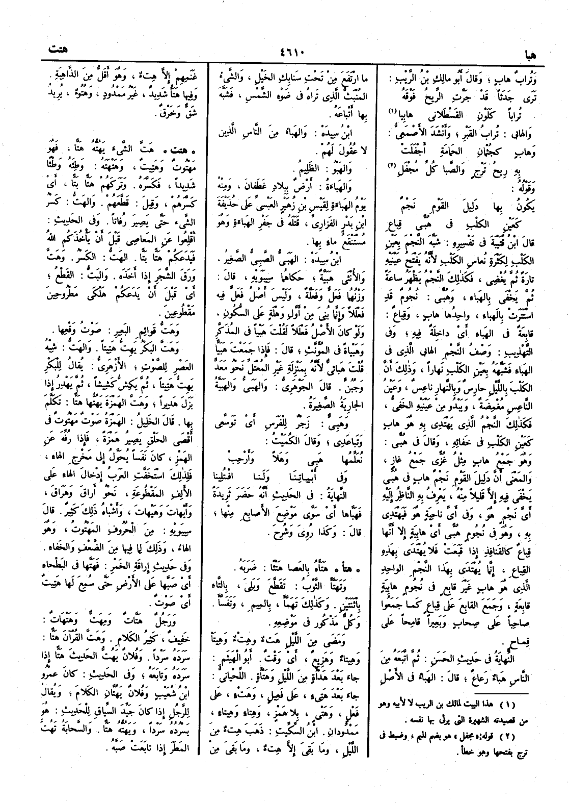وقوله يكونُ بها دَليلَ القَومِ نَجْمٌ كعَينِ الكلْبِ في هُبًّى قِباعِ قال ابن قتيبة في تفسيره شبه النجم بعين الكلب لكثرة نعاس الكلب لأَنه يفتح عينيه تارة ثم يُغْضِي فكذلك النجم يظهر ساعة ثم يَخْفَى بالهَباء وهُبًّى نُجُوم قد استترت بالهباء واحدها هابٍ وقِباعٌ قابِعةٌ في الهباء أَي داخلة فيه وفي التهذيب وصف النجم الهابي الذي في الهباء فشبهه بعين الكلب نهاراً وذلك أَنَّ الكلب بالليل حارس وبالنهار ناعس وعين الناعس مُغْمِضة ويبدو من عينيه الخَفِيُّ فكذلك النجم الذي يهتدى به هو هابٍ كعين الكلب في خَفائه وقال في هُبًّى وهو جمع هابٍ مثل غُزًّى جمع غازٍ والمعنى أَنَّ دليل القوم نجم هابٍ في هُبًّى يَخفى فيه إِلا قليلاً نه يَعرف به الناظر إِليه أَيَّ نجم هو وفي أَيِّ ناحية هو فيهتدي به وهو في نجوم هُبًّى أَي هابِيةٍ إِلا أَنها قِباعٌ كالقَنافِذ إِذا قَبَعَت فلا يُهْتَدَى بهذه القِباع إِنما يُهتدى بهذا النجم الواحد الذي هو هابٍ غير قابِعٍ في نجوم هابِيةٍ قابعة وجمع القابعَ على قِباعٍ كما جمعوا صاحباً على صِحابٍ وبعيراً قامِحاً على قِماحٍ النهاية في حديث الحسن ثم اتَّبَعه من الناس هَباءٌ رَعاعٌ قال الهَباء في الأَصل ما ارتفع من تحت سَنابك الخيل والشيءُ المُنْبَثُّ الذي تراه في ضوء الشمس فشبه بها أَتباعه ابن سيده والهَباء من الناس الذين لا عقول لهم والهَبْوُ الظليم والهَباءَةُ أَرض ببلاد غَطَفان ومنه يوم الهَباءَة لقَيس بن زُهير العبسي على حُذيفة بن بَدْر الفزاريّ قتله في جَفْر الهباءَة وهو مُسْتَنْقع ماء بها ابن سيده الهَبَيُّ الصبي الصغير والأُنثى هَبَيَّةٌ حكاهما سيبويه قال وزنهما فَعَلٌّ وفَعَلّةٌ وليس أَصل فَعلّ فيه فَعْلَلاً وإِنما بني من أَول وهلة على السكون ولو كان الأَصل فَعْلَلاً لقلت هَبْياً في المذكر وهَبْياةً في المؤنث قال فإِذا جمعت هَبَيّاً قلت هَبائيّ لأَنه بمنزلة غير المعتلّ نحو مَعدّ وجُبُنّ قال الجوهري والهَبَيُّ والهَبَيّةُ الجارية الصغيرة وهَبِي زَجْرٌ للفرس أَي تَوسَّعي وتَباعَدي وقال الكميت نُعَلِّمُها هَبي وهَلاً وأَرْحِبْ وفي أَبْياتِنا ولَنا افْتُلِينا النهاية وفي الحديث أَنه حََضَرَ ثَريدةً فهَبَّاها أَي سوّى موضع الأَصابع منها قال وكذا روي وشرح ( هتأ ) هَتَأَه بالعَصا هَتْأً ضرَبَه وتَهَتَّأَ الثوبُ تَقَطَّعَ وبَلِيَ بالتاء باثنتين وكذلك تَهَمَّأَ بالميم وتَفَسَّأَ وكلٌّ مذكور في موضعه ومَضَى من الليل هَتْءٌ وهِتْءٌ وهِيتَأٌ وهِيتَاءٌ وهَزيعٌ أَي وقت أَبو الهيثم جاء بعد هَدْأَةٍ من الليل وهَتْأَةٍ اللحياني جاء بعد هَتِيءٍ على فَعِيلٍ [ ص 180 ] وهَتْءٍ على فَعْلٍ وهَتْيٍ بلا همز وهِتاءٍ وهِيتاءٍ ممدودان ابن السكيت ذهَب هِتْءٌ من الليل وما بقيَ إِلا هِتْءٌ وما بَقيَ من غنمهم إِلا هِتْءٌ وهو أَقلُّ من الذَّاهبة وفيها هَتَأٌ شديد غير ممدود وهُتُوءٌ يريدُ شَقٌّ وخَرْقٌ