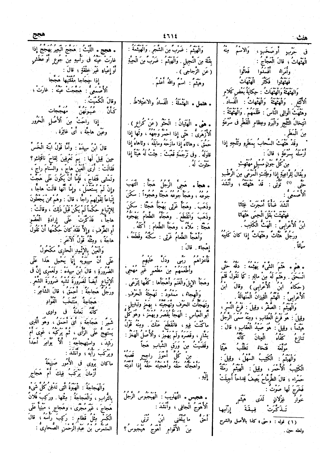 تُؤْتى قد هَثْهَثَتْهُ وأَنشد الأَصمعي أَنْشَدَ ضَأْناً أَمْجَرَتْ غِثَاثا فَهثْهَثَتْ بَقْلَ الحِمَى هَثْهَاثا ابن الأَعرابي الهَثُّ الكَذِب ورجل هَثَّاثٌ وهَثْهَاثٌ إِذا كان كذبه سُماقاً ( هثم ) هَثَمَ الشيءَ يَهْثِمه دَقَّه حتى انْسَحَقَ وهَثَم له من مالِه كما تقول قَثَم حكاه ابن الأَعرابي وقال ابن الأَعرابي الهُثُم القِيزانُ المُنْهالة والهَيْثَم الصَّقْر وقيل فَرْخ النَّسْر وقيل هو فرخ العُقاب ومنه سمي الرجل هَيْثَماً وقيل هو صيد العُقاب قال تُنازِعُ كَفَّاه العِنانَ كأَنَّه مُوَلَّعةٌ فَتْخاءُ تَطْلُب هَيْثَما والهَيْثَم الكَثيب السَّهَل وقيل الكَثيب الأَحَمر وقيل الهَيْثم رملة حمراء قال الطرماح يصف قِداحاً أُجِيلَتْ فخرج لها صوت خُوارُ غِزْلانٍ لدى هَيْثَمٍ تَذَكَّرَتْ فِيقةَ ارْآمِها والهَيْثَم ضرب من الشجر والهيْثَمة بَقْلة من النَّجيل والهَيْثَم ضرب من الحِبَّة عن الزجاجي وهَيْثَم اسم والله أَعلم ( هثمل ) الهَثْملة الفساد والاختلاط ( هثي ) الهَثَيانُ الحَثْوُ عن كراع الأَزهري هَثى إِذا احْمَرَّ وجْهُه وثَها إِذا حَمُقَ وهاثاه إِذا مازَحَه ومايَله وثاهاه إِذا قاوَلَه وفي ترجمة قعبث هِثْتُ له هَيْثاً إِذا حَثَوْتَ له