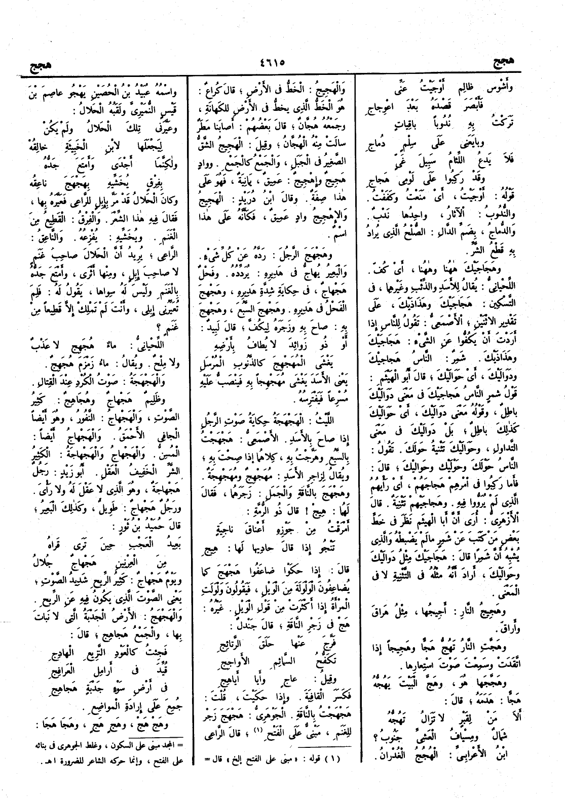( * قوله « مبني على الفتح إلخ » قال المجد مبني على السكون وغلط الجوهري في بنائه على الفتح وإِنما حركه الشاعر للضرورة اه ) قال الراعي واسمه عُبيد بن الحُصَين يهجو عاصم بن قيس النُّمَيريّ ولَقَبُه الحَلالُ وعَيَّرَني تِلكَ الحَلالُ ولم يكن ليَجعَلَها لابن الخَبيثةِ خالِقُهْ ولكنما أَجْدَى وأَمتَعَ جَدُّه بِفِرْقٍ يُخَشِّيهِ بِهَجْهَجَ ناعِقُه وكان الحَلالُ قد مَرَّ بإِبل للراعي فعَيَّره بها فقال فيه هذا الشعر والفِرْق القطيع من الغنم ويخشِّيه ُيفزِعه والناعق الراعي يريد أَن الحَلالَ صاحب غنم لا صاحب إِبل ومنها أَثْرَى وأَمتَع جَدُّه بالغنم وليس له سواها يقول له فلِمَ تُعَيِّرُني إِبلي وأَنت لم تملك إِلاَّ قطيعاً من غنم ؟ اللحياني ماء هُجَهِجٌ لا عَذْب ولا ملح ويقال ماءُ زمزم هُجَهِجٌ والهَجْهَجَةُ صوتُ الكُرْدِ عند القتال وظَلِيمٌ هَجْهاجٌ وهُجاهِجٌ كثير الصوت والهَجْهاجُ النَّفور وهو أَيضاً الجافي الأَحمق والهَجْهاجُ أَيضاً المُسِنُّ والهَجْهاجُ والهَجْهاجَةُ الكثير الشر الخفيف العقل أَبو زيد رجل هَجْهاجةٌ وهو الذي لا عقل له ولا رأْي ورجل هَجْهاج طويل وكذلك البعير قال حُمَيد بن ثور بَعِيدُ العَجْبِ حينَ تَرى قَراهُ من العِرْنِينِ هَجْهاجٌ جُلالُ ويوم هَجْهاج كثير الريح شديد الصوت يعني الصوت الذي يكون فيه عن الريح والهَجْهَجُ الأَرض الجَدْبَةُ التي لا نباتَ بها والجمع هَجاهج قال فجِئتُ كالعَوْدِ النَّزِيعِ الهادِجِ قُيِّدَ في أَرامِل العَرافِجِ في أَرضِ سَوْءٍ جَدْبَةٍ هَجاهِجِ جمع على إِرادة المواضع وهَجْ هَجْ وهَجٍ هَجٍ وهَجَا هَجَا