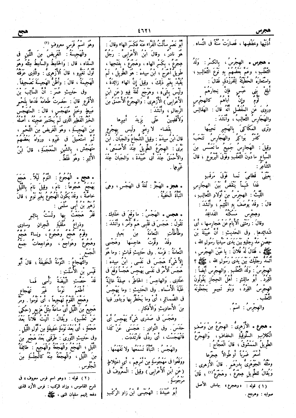 ( * قوله « وهجرع » بهامش الأصل صوابه وهرجع ) قال أَبو نصر سأَلت الفراء عنه فكسر الهاء وقال هو نادر وقال ابن الأَعرابي رجل هِجْرَعٌ بكسر الهاء وهَجْرَعٌ بفتحها طويل أَعْرَجُ ابن سيده هو الطويلُ لم يُقَيِّدْ بغير ذلك وقيل إِنَّ الهاء زائدة وليس بشيء وهَرْجَعٌ لغة فيه عن ابن الأَعرابي الأَزهري والهِجْرَعُ الأَحْمَقُ من الرِّجالِ وأَنشد ولأقْضِينَّ على يَزِيدَ أَمِيرِها بقَضاء لا رِخْوٍ ولَيْسَ بِهِجْرَعِ قال ابن سيده وقيل الشجاع والجَبانُ ابن بري الهِجْرَعُ الطَّويل عند الأَصمعي والأَحْمَقُ عند أَبي عبيدة والجَبانُ عند غيرهما ( هجز ) الهَجْزُ لغة في الهَجْسِ وهي النَّبْأَةُ الخَفِيَّة