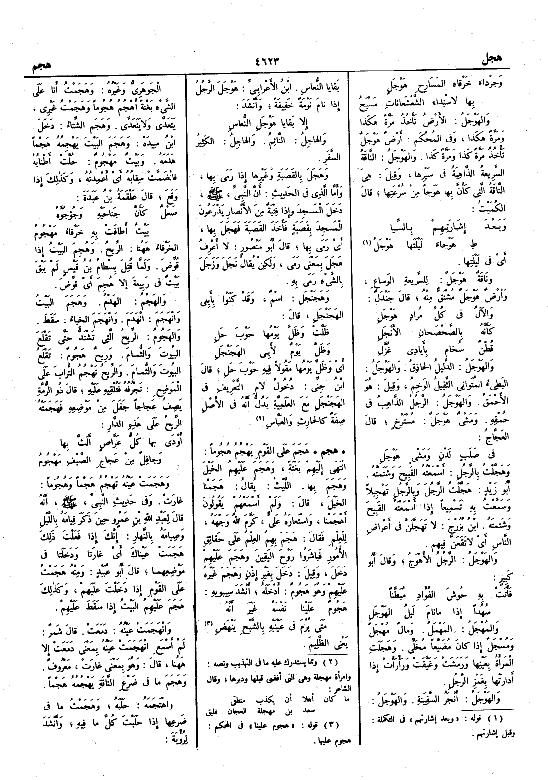 أَي في ليلتها وناقة هَوْجَل للسريعة الوَسْاع وأَرض هَوْجَل مشتق منه قال جندل والآلُ في كلِّ مُرادٍ هَوْجَلِ كأَنَّه بالصَّحْصَحان الأَنْجَلِ قُطْنٌ سُخام بأَيادِي غُزَّلِ والهَوْجَل الدليل الحاذِق والهَوْجَل البطيء المُتَواني الثقيلُ الوَخِم وقيل هو الأَحمق والهَوْجَل الرجل الذاهِب في حُمْقِه ومشيٌ هَوْجَل مُسْترخ قال العجاج في صَلَبٍ لَدْنٍ ومَشْيٍ هَوْجَلِ وهَجَّلْت بالرجل أَسمعته القبيحَ وشتَمْته أَبو زيد هَجَّلْت الرجلَ وبالرجل تَهْجِيلاً وسَمَّعْت به تسميعاً إِذا أَسمعته القبيح وشتمته ابن بُزُرْج لا تَهَجَّلنّ في أَعراض الناس أَي لا تَقَعَنّ فيهم والهَوْجَل الرجل الأَهْوَج وقال أَبو كبير فأَتَتْ به حُوشَ الفُؤادِ مُبَطَّناً سُهُداً إِذا ما نام لَيلُ الهَوجلِ والمُهْجَل المُهْمَل ومالٌ مُهْجَل ومُسْجَل إِذا كان مُضَيَّعاً مُخَلّى وهَجَلَتِ المرأَة بعينها ورَمَشَت وغَيَّقَت ورَأْرَأَتْ إِذا أَدارتها بغَمْزِ الرجل والهَوْجَل أَنْجَر السفينة والهَوْجَل بَقايا النُّعاس ابن الأَعرابي هَوْجَلَ الرجلُ إِذا نام نومة خفيفة وأَنشد إِلاَّ بقايا هَوْجَل النعاسِ والهاجِلُ النائم والهاجِلُ الكثير السفَر وهَجَل بالقَصَبَة وغيرها إِذا رمى بها وأَما الذي في الحديث أَن النبي صلى الله عليه وسلم دخل المسجد وإِذا فِتْية من الأَنصار يَذْرَعون المسجد بقصَبة فأَخذ القَصَبَة فهَجَل بها أَي رمى بها قال أَبو منصور لا أَعرف هَجَل بمعنى رمى ولكن يقال نَجَل وزَجَل بالشيء رمى به وهَجْنْجَل اسم وقد كنوا بأَبي الهَجَنْجَل قال ظلَّت وظَلَّ يومُها حَوْبَ حَلِ وظَلَّ يومٌ لأَبي الهَجَنْجَلِ أَي وظلَّ يومُها مقولاً فيه حَوْبَ حَلِ قال ابن جني دخول لام التعريف في الهَجَنْجَل مع العلمية يدل أَنه في الأَصل صفة كالحرث والعباس