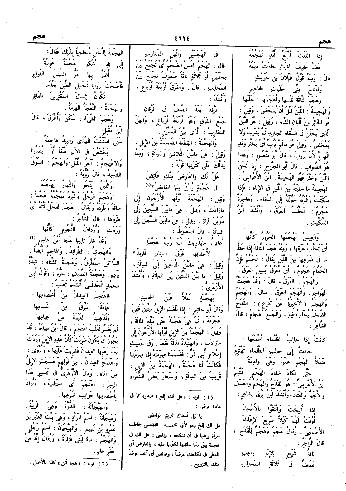 إِذا التَقَتْ أَرْبَعُ أَيْدٍ تَهْجُمُهْ حَفَّ حَفِيفَ الغيْثِ جادَتْ دِيَمُهْ قال ومنه قول غَيْلان بن حُرَيْث وامْتاح مني حَلَباتِ الهاجِمِ وهَجَمَ الناقة نَفْسَها وأَهْجَمَها حَلَبها والهَجِيمةُ اللبنُ قبل أَن يُمْخَض وقيل هو الخاثرُ من أَلبْان الشاءِ وقيل هو اللبن الذي يُحْقَنُ في السِّقاء الجديد ثم يُشْرَب ولا يُمْخَض وقيل هو ما لم يَرُبْ أَي يَخْثُر وقد الهْاجَّ لأَن يَروبَ قال أَبو منصور وهذا هو الصواب قال أَبو الجرّاح إِذا ثَخُنَ اللبنُ وخَثُر فهو الهَجِيمةُ ابن الأَعرابي الهَجِيمةُ ما حَلَبْته من اللبن في الإِناء فإِذا سكَنتْ رَغْوتُه حَوَّلْتَه إِلى السِّقاء وهاجِرةٌ هَجُومٌ تَحْلُب العرَقَ وأَنشد ابن السكيت والعِيسُ تَهْجُمُها الحَرورُ كأَنَّها أَي تَحْلُب عرَقَها ومنه هَجَمَ الناقةَ إِذا حَطَّ ما في ضرعها من اللبن يقال تَحَمَّمَ فإِنَّ الحَمَّام هَجُومٌ أَي مُعَرِّقٌ يُسِيل العَرَقَ والهَجْمُ العَرَقُ قال وقد هَجَمَتْه الهَواجِر وانْهَجَمَ العرَقُ سالَ والهَجْم والهَجَمُ الأَخيرة عن كراع القَدَحُ الضَّخْم يُحْلب فيه والجمع أَهْجامٌ قال الشاعر كانت إِذا حالِبُ الظَّلْماء أَسْمَعَها جاءت إِلى حالِبِ الظَّلْماءِ تَهْتَزِمُ فَتَمْلأُ الهَجْمَ عَفْواً وهي وادِعةٌ حتى تكادَ شِفاه الهَجْمِ تَنْثَلِمُ ابن الآَعرابي هو القدَحُ والهَجَمُ والعَسْفُ والأَجَمُّ والعَتادُ وأَنشد ابن بري لشاعر إِذا أُنِيخَتْ والْتَقَوْا بالأَهْجامْ أَوْفَت لهم كَيْلاً سَريع الإِعْذامْ الأَصمعي يقال هَجَمٌ وهَجْمٌ للقَدَحِ قال الراجز ناقةُ شيخٍ للإِلهِ راهِبِ تَصُفُّ في ثلاثةِ المَحالِبِ في الهَجَمَيْنِ والْهَنِ المُقارِبِ قال الهَجَمُ العُسُّ الضخم أَي تجمع بين مِحْلَبَيْنِ أَو ثلاثة ناقة صَفوفٌ تجمع بين المحالب قال والفَرَق أَربعةُ أَرباع وأَنشد تَرْفِد بعدَ الصَّفِّ في فُرْقانِ جمع الفَرَق وهو أَربعة أَرباعٍ والهنُ المُقارِبُ الذي بين العُسَّين والهَجْمةُ القطْعة الضَّخْمة من الإِبل وقيل هي ما بين الثلاثين والمائة ومما يَدلّك على كثرتها قوله هَلْ لكِ والعارِضُ منكِ عائِضُ في هَجْمَةٍ يُسْئِرُ منها القابِضُ ؟