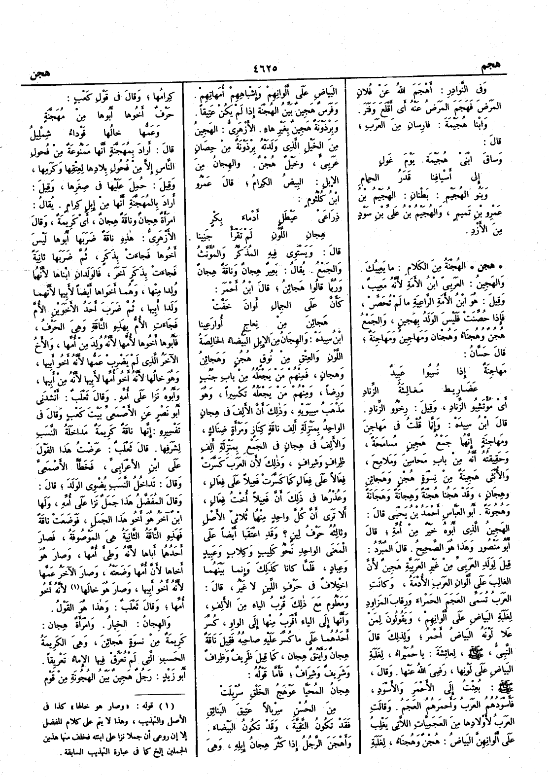 وفي النوادر أَهْجَمَ اللهُ عن فلانٍ المرضَ فهَجَمَ المرضُ عنه أَي أَقْلَعَ وفَتَر وابْنا هُجَيْمةَ فارِسان من العرب قال وساقَ ابْنَيْ هُجَيْمةَ يَوْمَ غَولٍ إِلى أَسْيافِنا قَدَرُ الحِمامِ وبَنُو الهُجَيم بَطْنانِ الهُجَيم بن عمرو بن تميم والهُجَيْم بن علي بن سودٍ من الأَزْدِ ( هجن ) الهُجْنة من الكلام ما يَعِيبُك والهَجِينُ العربيّ ابنُ الأَمة لأَنه مَعِيبٌ وقيل هو ابن الأَمة الراعية ما لم تُحَصَّنْ فإِذا حُصِّنَتْ فليس الولد بهَجينٍ والجمع هُجُنٌ وهُجَناء وهُجْنانٌ ومَهاجِينُ ومَهاجِنَةٌ قال حسان مَهاجِنةٌ إِذا نُسِبوا عَبيدٌ عَضَارِيطٌ مَغالِثةُ الزِّنادِ أَي مُؤْتَشِبُو الزناد وقيل رِخْوُو الزناد قال ابن سيده وإِنما قلت في مَهاجِن ومَهاجنة إِنهما جمع هَجِينُ مسامحةً وحقيقته أَنه من باب مَحاسِنَ ومَلامح والأُنثى هَجينة من نسوة هُجْن وهَجائنَ وهِجانٍ وقد هَجُنا هُجْنة وهَجانة وهِجانة وهُجُونة أَبو العباس أَحمد ابن يحيى قال الهَجِين الذي أَبوه خير من أُمه قال أَبو منصور وهذا هو الصحيح قال المبرد قيل لولد العربيّ من غير العَربية هَجين لأَن الغالب على أَلوان العرب الأُدْمة وكانت العرب تسمي العجمَ الحمراءَ ورقابَ المَزاوِد لغلبة البياض على أَلوانهم ويقولون لمن علا لونَه البياضُ أَحمرُ ولذلك قال النبي صلى الله عليه وسلم لعائشة يا حُمَيراء لغلبة البياض على لونها رضي الله عنه قال صلى الله عليه وسلم بُعِثْتُ إِلى الأَحمر والأَسود فأَسودهم العرب وأَحمرهم العجم وقالت العرب لأَولادها من العجميات اللاتي يغلب على أَلوانهن البياض هُجْنٌ وهُجَناء لغلبة البياض على أَلوانهم وإِشباههم أُمهاتهم وفرس هَجِين بَيّنُ الهُجْنة إِذا لم يكن عتيقاً وبِرْذَوْنَة هَجِين بغير هاء الأَزهري الهجين من الخيل الذي ولدته بِرْذَوْنة من حِصَانٍ عربي وخيل هُجْنٌ والهِجانُ من الإِبل البيضُ الكرام قال عمرو بن كُلْثوم ذِرَاعَيْ عَيْطَلٍ أَدْماءَ بِكْرٍ هِجانِ اللَّوْنِ لم تَقْرأْ جَنينا قال ويستوي فيه المذكر والمؤنث والجمع يقال بعير هِجانٌ وناقة هِجانٌ وربما قالوا هَجائِنُ قال ابن أَحمر كأَنَّ على الجِمالِ أَوانَ خَفَّتْ هَجائِنَ من نِعاجِ أُوارَعِينا ابن سيده والهِجانُ من الإِبل البيضاءُ الخالصةُ اللونِ والعِتْقِ من نوق هُجُنٍ وهَجائن وهِجانٍ فمنهم من يجعله من باب جُنُب ورِضاً ومنهم من يجعله تكسيراً وهو مذهب سيبويه وذلك أَن الأَلف في هِجانٍ الواحد بمنزلة أَلِفِ ناقةٍ كِنَازٍ ومرأَةٍ ضِنَاك والأَلفُ في هِجانٍ في الجمع بمنزلة أَلِفِ ظِرافٍ وشِرافٍ وذلك لأَن العرب كَسَّرَتْ فِعَالاً على فِعَالٍ كما كسرت فَعِيلاً على فِعَالٍ وعُذْرُها في ذلك أَن فعيلاً أُخت فِعَالٍ أَلا ترى أَن كل واحد منهما ثلاثي الأَصل وثالثه حرف لين ؟ وقد اعْتَقَبا أَيضاً على المعنى الواحد نحو كَلِيبٍ وكِلابٍ وعَبِيدٍ وعِبادٍ فلما كانا كذلك وإِنما بينهما اختلافٌ في حرف اللين لا غير قال ومعلوم ٌمع ذلك قربُ الياء من الأَلف وأَنها إِلى الياء أَقرب منها إِلى الواو كُسِّرَ أَحدهما على ما كسر عليه صاحبه فقيل ناقة هِجانٌ وأَيْنُقٌ هِجانٌ كما قيل ظريف وظِراف وشريف وشِرَاف فأَما قوله هِجانُ المُحَيَّا عَوْهَجُ الخَلْقِ سُرْبِلَتْ من الحُسْنِ سِرْبالاً عَتِيقَ البَنائِق فقد تكونُ النَّقِيَّةَ وقد تكون البيضاء وأَهْجَنَ الرجلُ إِذا كثر هِجانُ إِبله وهي كِرامها وقال في قول كعب حَرْفٌ أَخوها من مُهَجَّنةٍ وعَمُّها خالُها قَوْداءُ شِمْليلُ قال أَراد بمُهَجَّنة أَنها ممنوعة من فحول الناس إِلا من فحول بلادها لعِتْقِها وكرمها وقيل حُمِلَ عليها في صِغَرها وقيل أَراد بالمُهَجَّنةِ أَنها من إِبل كرام يقال امرأَة هِجانٌ وناقةِ هِجانٌ أَي كريمة وقال الأَزهري هذه ناقة ضربها أَبوها ليس أَخوها فجاءَت بذكر ثم ضربها ثانية فجاءت بذكر آخر فالولدان ابناها لأَنهما ولدا منها وهما أَخواها أَيضاً لأَبيها لأ