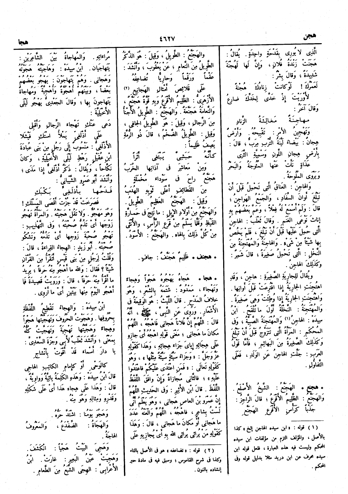 ( هجنف ) ظَليم هَجَنَّفٌ جافٍ ( هجا ) هَجاه يَهْجُوه هَجْواً وهِجاء وتَهْجاء مدود شتمه بالشِّعر وهو خلاف المَدْح قال الليث هو الوَقِيعةُ في الأَشْعار وروي عن النبي صلى الله عليه وسلم أَنه قال اللهم إِنَّ فلاناً هَجاني فاهْجُه اللهم مكانَ ما هَجاني معنى قوله اهْجُه أَي جازِه على هِجائه إِيايَ جَزاءَ هِجائه وهذا كقوله عز وجل وجَزاءُ سَيِّئَةٍ سَيِّئَةٌ مِثْلُها وهو كقوله تعالى فمَنِ اعْتَدى عليكم فاعْتَدُوا عليه فالثاني مُجازاةٌ وإِن وافَق اللفظُ اللفظَ قال ابن الأَثير وفي الحديث اللهم إِنَّ عمرو بنَ العاصِ هَجاني وهو يعلم أَني لست بشاعر فاهْجُه اللهم والْعَنْه عدَدَ ما هَجاني أَو مكان ما هَجاني قال وهذا كقوله مَن يُرائي يُرائي اللهُ به أَي يُجازِيه على مُراءَاته والمُهاجاةُ بين الشاعِرَيْنِ يَتهاجَيانِ ابن سيده وهاجَيْتُه هَجَوْتُه وهَجاني وهم يَتهاجَوْنَ يَهْجُو بعضُهم بعضاً وبينهم أُهْجُوَّةٌ وأُهْجِيّةٌ ومُهاجاةٌ يتَهاجَوْن بها وقال الجعدي يَهْجُو ليلى الأَخْيَلِيَّة دَعي عَنْكِ تَهْجاءَ الرِّجالِ وأَقْبلي على أَذْلَغِيٍّ يَمْلأُ اسْتَكِ فَيْشَلا الأَذَلَغِيُّ منسوب إِلى رجل من بني عُبادة بن عُقَيْلٍ رَهْطِ لَيْلى الأَخْيَلِيَّة وكان نَكَّاحاً ويقال ذكر أَذْلَغِيٌّ إِذا مَذى وأَنشد أَبو عمرو الشيباني فدَحَّها بأَذْلَغِيٍّ بَكْبَكِ فصَرَخَتْ قد جُزْتَ أَقْصى المَسْلَكِ وهو مَهْجُوٌّ ولا تقل هَجَيْتُه والمرأَة تَهْجُو زَوْجَها أَي تَذُمُّ صُحبته وفي التهذيب تَهْجُو صُحبة زوجها أَي تَذُمُّه وتَشْكُو صُحْبتَه أَبو زيد الهِجاءُ القِراءَة قال وقلت لرجل من بني قيس أَتَقْرَأُ من القرآن شيئاً ؟ فقال واللهِ ما أَهْجُو منه حَرفاً يريد ما أَقْرَأُ منه حَرْفاً قال ورَوَيْتُ قَصِيدةً فما أَهْجُو اليومَ منها بيتين أَي ما أَرْوي ابن سيده والهِجاء تَقْطِيعُ اللفظة بحُروفِها وهَجَوْتُ الحروف وتَهَجَّيْتُها هَجْواً وهِجاء وهَجَّيْتها تَهْجِيةً وتَهَجَّيتُ كله بمعنى وأَنشد ثعلب لأَبي وَجْزةَ السَّعْدي يا دارَ أَسْماءَ قد أَقْوَتْ بأَنْشاجِ كالوَحْيِ أَو كإِمامِ الكاتِبِ الهاجِي قال ابن سيده وهذه الكلمة يائية وواوية قال وهذا على هِجاء هذا أَي على شَكْلِه وقَدْرِهِ ومِثاله وهو منه وهَجُوَ يَوْمُنا اشتَدَّ حَرُّه والهَجاةُ الضِّفْدَعُ والمعروف الهاجةُ وهَجِيَ البيتُ هَجْياً انْكَشَفَ وهَجِيَتْ عَيْنُ البعير غارَتْ ابن الأَعرابي الهِجى الشِّبعُ من الطَّعام