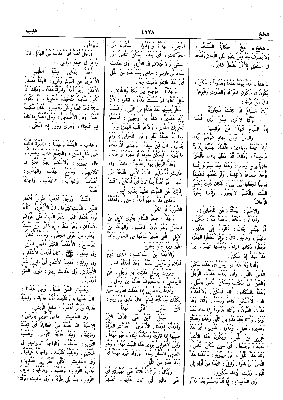 ( هخخ ) هِخْ حكاية المتَنَخِّم ولا يصرَّف منه فعل لثقله على اللسان وقبحه في المنطق إِلا أَن يضطر شاعر هيخ هَيَّخَ الهَريسَةَ أَكثَر ودَكَها عن كُراع وأَنشد محمد بن سهل للكُميتِ إِذا ابتَسَر الحربَ أَحلامُها كِشافاً وهَيَّخَت الأَفحلُ الابتسار أَن يضرب الفحل الناقة على غير ضَبَعَةٍ قال وأَحلامها أَصحابها وهَيَّخت أُنيخت وهو أَن يقال لها عند الإِناخة هخ هخ إِخ إِخ يقول ذللت هذه الحرب للفحولة فأَناختها وقيل التهييخ دعاءُ الفحل للضراب وهيخ هيخ لغة قال محمد بن سهل هَيَّخت الناقة إِذا أُنيخت ليقرعها الفحل وهَيَّخ الفحلُ إِذا أُنيخ ليبرك عليها فيضربها والهاءُ مبدلة من الهمزة في هيخت ( هدأ ) هَدَأَ يَهْدَأُ هَدْءاً وهُدُوءاً سَكَن يكون في سكون الحركة