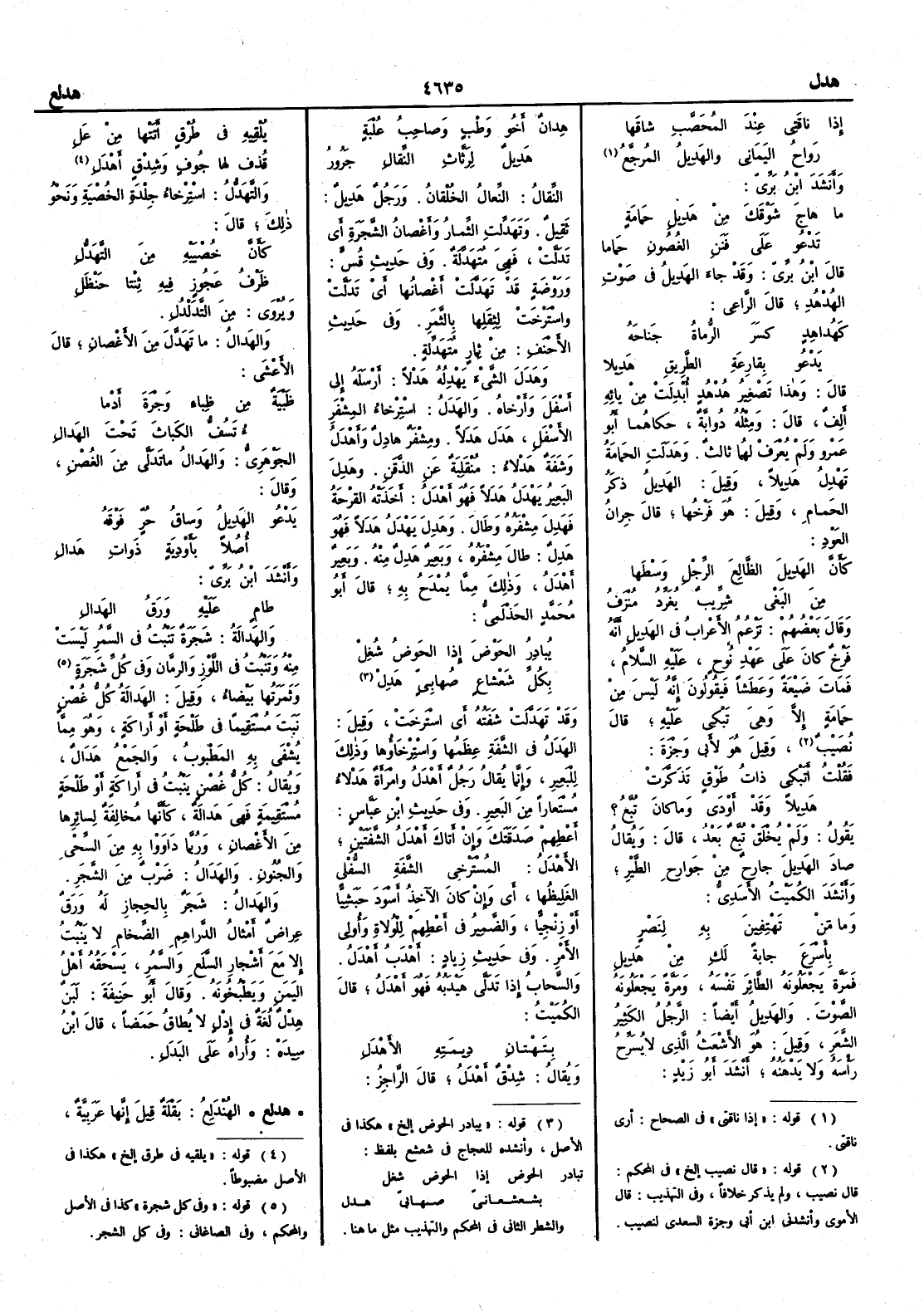 ( * قوله « قال نصيب إلخ » في المحكم قال نصيب ولم يذكر خلافاً وفي التهذيب قال الاموي وأنشدني ابن أبي وجزة السعدي لنصيب ) وقيل هو لأَبي وجزة فقلت أَتبكي ذاتُ طَوْقٍ تذكَّرتْ هَدِيلاً وقد أَوْدى وما كان تُبَّعُ ؟ يقول ولم يخلق تُبَّع بعدُ قال ويقال صادَ الهَدِيلَ جارِحٌ من جَوارِح الطير وأَنشد الكميت الأَسدي وما مَنْ تَهْتِفِينَ به لِنَصْرٍ بأَسْرَعَ جابةً لكِ من هَدِيلِ فمرّة يجعلونه الطائرَ نفسَه ومرَّة يجعلونه الصَّوْت والهَدِيلُ أَيضاً الرجل الكثير الشعَر وقيل هو الأَشْعَث الذي لا يسرِّح رأْسه ولا يدهنه أَنشد أَبو زيد هِدانٌ أَخُو وَطْبٍ وصاحِبُ عُلْبة هَدِيلٌ لِرَثَّاثِ النِّقالِ جَرُورُ النِّقال النِّعالُ الخُلْقان ورجل هَدِيل ثقيل وتَهَدَّلتِ الثِّمارُ وأَغصان الشجرة أَي تدلَّت فهي مُتَهَدِّلة وفي حديث قُسّ وروضةٍ قد تَهَدَّلت أَغصانها أَي تدلَّت واسترختْ لثِقَلها بالثمر وفي حديث الأَحْنف من ثِمارٍ مُتَهَدِّلةٍ وهَدَل الشيءَ يَهْدِله هَدْلاً أَرسله إِلى أَسفل وأَرخاه والهَدَل استرخاه المِشْفَر الأَسفل هَدِل هَدَلاً ومِشْفَر هادِلٌ وأَهْدَل وشَفة هَدْلاء مُنْقَلِبة عن الذَّقَن وهدِل البعير يَهْدَل هَدَلاً فهو أَهْدَل أَخذته القرحة فهَدِل مِشْفَره وطال وهَدِل يَهْدَل هَدلاً فهو هَدِل طال مِشْفره وبعير هَدِل منه وبعير أَهْدَل وذلك مما يمدح به قال أَبو محمد الحَذْلَمي يُبادِر الحَوْضَ إِذا الحَوْضُ شُغِلْ بكلِّ شَعشاعٍ صُهابيٍّ هَدِلْ