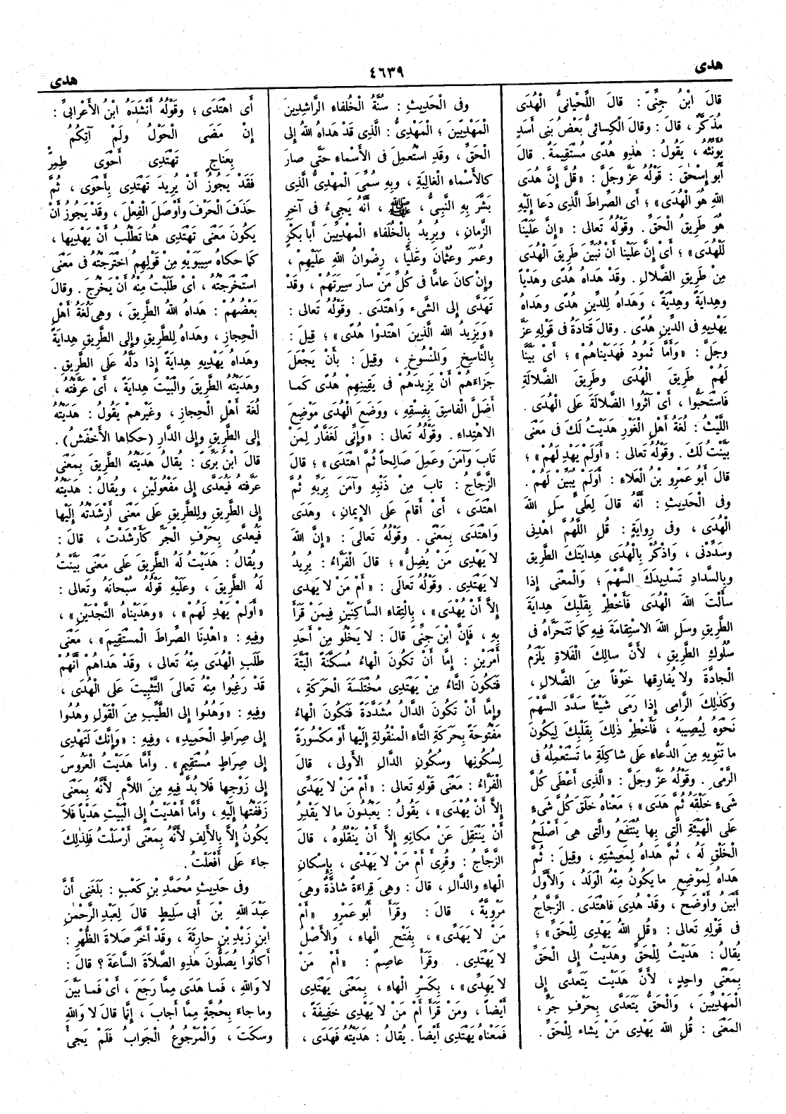 قال ابن جني قال اللحياني الهُدَى مذكر قال وقال الكسائي بعض بني أَسد يؤنثه يقول هذه هُدًى مستقيمة قال أَبو إِسحق قوله عز وجل قل إِن هُدَى الله هو الهُدَى أَي الصِّراط الذي دَعا إِليه هو طَرِيقُ الحقّ وقوله تعالى إِنَّ علينا لَلْهُدَى أَي إِنَّ علينا أَنْ نُبَيِّنَ طريقَ الهُدَى من طَرِيق الضَّلال وقد هَداه هُدًى وهَدْياً وهِدايةً وهِديةً وهَداه للدِّين هُدًى وهَداه يَهْدِيه في الدِّين هُدًى وقال قتادة في قوله عز وجل وأَما ثَمُودُ فهَدَيْناهُم أَي بَيَّنَّا لهم طَرِيقَ الهُدى وطريق الضلالة فاسْتَحَبُّوا أَي آثرُوا الضلالة على الهُدَى الليث لغة أَهل الغَوْرِ هَدَيْتُ لك في معنى بَيَّنْتُ لك وقوله تعالى أَوَلم يَهْدِ لهم قال أَبو عمرو بن العلاء أَوَلم يُبَيِّنْ لهم وفي الحديث أَنه قال لعليّ سَلِ اللهَ الهُدَى وفي رواية قل اللهم اهْدِني وسَدِّدْني واذكر بالهُدَى هِدايَتك الطريقَ وبالسَّدادِ تَسْدِيدَك السَّهْمَ والمعنى إِذا سأَلتَ الله الهُدَى فأَخْطِر بقَلْبك هِدايةَ الطَّريق وسَلِ الله الاستقامة فيه كما تتَحَرَّاه في سُلوك الطريق لأَنَّ سالكَ الفَلاة يَلزم الجادّةَ ولا يُفارِقُها خوفاً من الضلال وكذلك الرَّامِي إِذا رَمَى شيئاً سَدَّد السَّهم نحوه ليُصِيبه فأَخْطِر ذلك بقلبك ليكون ما تَنْويه مِنَ الدُّعاء على شاكلة ما تستعمله في الرمي وقوله عز وجل الذي أَعْطَى كلَّ شيء خَلْقَه ثم هَدَى معناه خَلَق كلَّ شيء على الهيئة التي بها يُنْتَفَعُ والتي هي أَصْلَحُ الخَلْقِ له ثم هداه لمَعِيشته وقيل ثم هَداه لموضعِ ما يكون منه الولد والأَوَّل أَبين وأَوضح وقد هُدِيَ فاهْتَدَى الزجاج في قوله تعالى قُلِ اللهُ يَهْدِي للحقِّ يقال هَدَيْتُ للحَقِّ وهَدَيْت إِلى الحق بمعنًى واحد لأَنَّ هَدَيْت يَتَعدَّى إِلى المَهْدِيّين والحقُّ يَتَعَدَّى بحرف جر المعنى قل الله يهدي مَن يشاء للحق وفي الحديث سُنَّة الخُلفاء الرَّاشِدِين المَهْدِيّينَ المَهْدِيُّ الذي قد هَداه الله إِلى الحق وقد اسْتُعْمِل في الأَسماء حتى صار كالأَسماء الغالبة وبه سُمي المهْدِيُّ الذي بَشَّر به النبيُّ صلى الله عليه وسلم أَنه يجيء في آخر الزمان ويريد بالخلفاء المهديين أَبا بكر وعمر وعثمان وعليّاً رضوان الله عليهم وإِن كان عامّاً في كل من سار سِيرَتَهم وقد تَهَدَّى إِلى الشيء واهْتَدَى وقوله تعالى ويَزِيدُ الله الذين اهْتَدَوْا هُدًى قيل بالناسخ والمنسوخ وقيل بأَن يَجْعَلَ جزاءهم أَن يزيدهم في يقينهم هُدًى كما أَضَلَّ الفاسِق بفسقه ووضع الهُدَى مَوْضِعَ الاهْتداء وقوله تعالى وإِني لَغَفّار لمن تابَ وآمَنَ وعَمِل صالحاً ثمَّ اهْتَدَى قال الزجاج تابَ مِنْ ذنبه وآمن برَبِّهِ ثم اهْتدى أَي أَقامَ على الإِيمان وهَدَى واهْتَدَى بمعنى وقوله تعالى إِنَّ الله لا يَهْدِي مَنْ يُضِلُّ قال الفراء يريد لا يَهْتدِي وقوله تعالى أَمْ مَنْ لا يَهَدِّي إِلاَّ أَنْ يُهْدَى بالتقاء الساكنين فيمن قرأَ به فإِن ابن جني قال لا يخلو من أَحد أَمرين إِما أَن تكون الهاء مسكنة البتة فتكون التاء من يَهْتَدِي مختلسة الحركة وإِما أَن تكون الدال مشدَّدة فتكون الهاء مفتوحة بحركة التاء المنقولة إِليها أَو مكسورة لسكونها وسكون الدال الأُولى قال الفراء معنى قوله تعالى أَمْ مَنْ لا يَهَدِّي إِلاَّ أَنْ يُهْدَى يقول يَعْبُدون ما لا يَقْدِر أَن يَنتقل عن مكانه إِلا أَن يَنْقُلُوه قال الزجاج وقرئ أَمْ مَن لا يَهْدْي بإسكان الهاء والدال قال وهي قراءة شاذة وهي مروية قال وقرأَ أَبو عمرو أَمْ مَن لا يَهَدِّي بفتح الهاء والأَصل لا يَهْتَدِي وقرأَ عاصم أم مَنْ لا يَهِدِّي بكسر الهاء بمعنى يَهْتَدِي أَيضاً ومن قرأَ أَمْ من لا يَهْدِي خفيفة فمعناه يَهْتَدِي أَيضاً يقال هَدَيْتُه فَهَدَى أَي اهْتَدَى وقوله أَنشده ابن الأَعرابي إِنْ مَضَى الحَوْلُ ولم آتِكُمُ بِعَناجٍ تَهتدِي أَحْوَى طِمِرّْ فقد يجوز أَن يريد ته