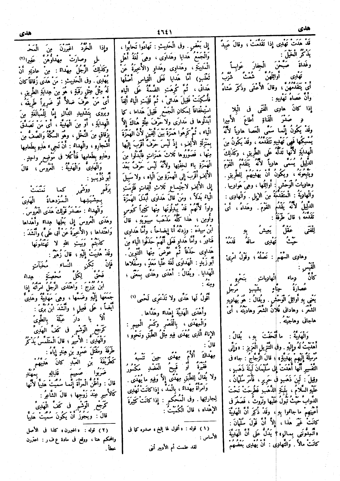 قد هَدَت تَهْدي إِذا تَقَدَّمتْ وقال عَبيد يذكر الخيل وغَداةَ صَبَّحْنَ الجِفارَ عَوابِساً تَهْدي أَوائلَهُنَّ شُعْثٌ شُزَّبُ أَي يَتَقَدَّمُهن وقال الأَعشى وذكر عَشاه وأَنَّ عَصاه تَهْدِيه إِذا كان هادي الفَتى في البلا دِ صَدْرَ القَناةِ أَطاع الأَمِيرا وقد يكون إِنما سَمَّى العَصا هادِياً لأَنه يُمْسِكها فهي تَهْديه تتقدَّمه وقد يكون من الهِدايةِ لأَنها تَدُلُّه على الطريق وكذلك الدليلُ يسمى هادِياً لأَنه يَتَقَدَّم القومَ ويتبعونه ويكون أَن يَهْدِيَهم للطريقِ وهادِياتُ الوَحْشِ أَوائلُها وهي هَوادِيها والهادِيةُ المتقدِّمة من الإِبل والهادِي الدليل لأَنه يَقْدُمُ القومَ وهَداه أَي تَقَدَّمه قال طرفة لِلْفَتَى عَقْلٌ يَعِيشُ به حيثُ تَهْدي ساقَه قَدَمُهْ وهادي السهمِ نَصْلُه وقول امرئ القيس كأَنَّ دِماء الهادِياتِ بنَحْرِه عُصارة حِنَّاءٍ بشَيْبٍ مُرَجَّلِ يعني به أَوائلَ الوَحْشِ ويقال هو يُهادِيه الشِّعرَ وهاداني فلان الشِّعرَ وهادَيْتُه أَي هاجاني وهاجَيْتُه والهَدِيَّةُ ما أَتْحَفْتَ به يقال أَهْدَيْتُ له وإِليه وفي التنزيل العزيز وإِني مُرْسِلة إِليهم بهَدِيَّةٍ قال الزجاج جاء في التفسير أَنها أَهْدَتْ إِلى سُلَيْمَانَ لَبِنة ذهب وقيل لَبِنَ ذهب في حرير فأَمر سليمان عليه السلام بلَبِنة الذهب فطُرحت تحت الدوابِّ حيث تَبولُ عليها وتَرُوت فصَغُر في أَعينهم ما جاؤُوا به وقد ذكر أَن الهدية كانت غير هذا إِلا أَن قول سليمان أَتُمِدُّونَنِي بمال ؟ يدل على أَن الهدية كانت مالاً والتَّهادِي أَن يُهْدي بعضُهم إِلى بعض وفي الحديث تَهادُوا تَحابُّوا والجمع هَدايا وهَداوَى وهي لغة أَهل المدينة وهَداوِي وهَداوٍ الأَخيرة عن ثعلب أَما هَدايا فعلى القياس أَصلها هَدائي ثم كُرهت الضمة على الياء فأُسكنت فقيل هَدائىْ ثم قلبت الياء أَلفاً استخفافاً لمكان الجمع فقيل هَداءا كما أَبدلوها في مَدارَى ولا حرف علة هناك إِلا الياء ثم كرهوا همزة بين أَلفين لأَن الهمزة بمنزلة الأَلف إِذ ليس حرف أَقرب إِليها منها فصوروها ثلاث همزات فأَبدلوا من الهمزة ياء لخفتها ولأَنه ليس حرف بعد الأَلف أَقرب إِلى الهمزة من الياء ولا سبيل إِلى الأَلف لاجتماع ثلاث أَلفات فلزمت الياء بدلاً ومن قال هَداوَى أَبدل الهمزة واواً لأَنهم قد يبدلونها منها كثيراً كبُوس وأُومِن هذا كله مذهب سيبويه قال ابن سيده وزِدْته أَنا إيضاحاً وأَما هَداوي فنادر وأَما هَداوٍ فعلى أَنهم حذفوا الياء من هَداوي حذفاً ثم عوض منها التنوين أَبو زيد الهَداوي لغة عُلْيا مَعَدٍّ وسُفْلاها الهَدايا ويقال أَهْدَى وهَدَّى بمعنًى ومنه أَقولُ لها هَدِّي ولا تَذْخَري لَحْمي