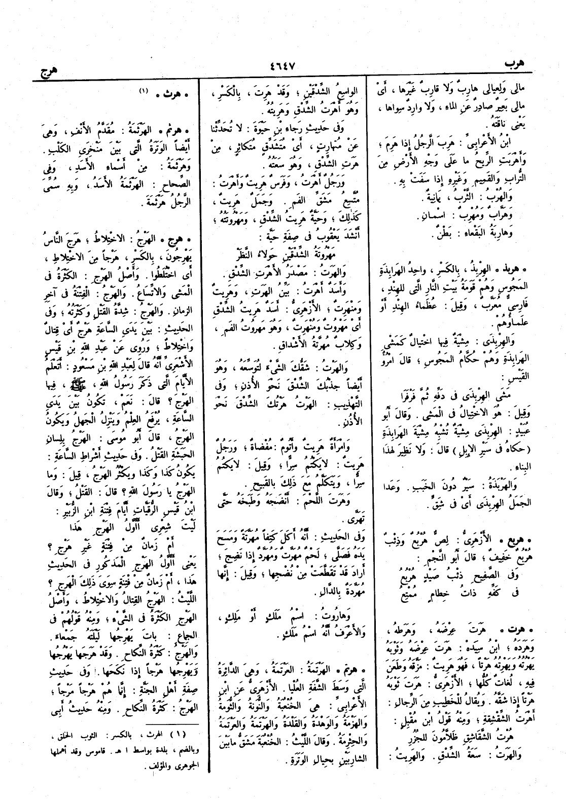( * الهرث بالكسر الثوب الخلق وبالضم بلدة بواسط اه قاموس وقد أَهملها الجوهري والمؤلف ) ( هرثم ) الهَرْثَمةُ مُقَدَّمُ الأَنف وهي أَيضاً الوترةُ التي بين مَنْخِرَي الكلبِ وهَرْثَمَةُ من أَسماء الأَسد وفي الصحاح الهَرْثَمةُ الأَسدُ وبه سمي الرجل هَرْثَمة ( هرج ) الهَرْجُ الاختلاط هَرَجَ الناس يَهْرِجُون بالكسر هَرْجاً من الاختلاط أَي اختلطوا وأَصل الهَرْج الكثرة في المشي والاتساعُ والهَرْجُ الفتنة في آخر الزمان والهَرْجُ شدَّة القتل وكثرته وفي الحديث بين يدي الساعة هَرْج أَي قتال واختلاط وروي عن عبد الله بن قيس الأَشعري أَنه قال لعبدالله بن مسعود أَتعلم الايام التي ذَكَرَ رسولُ الله صلى الله عليه وسلم فيها الهَرْجَ ؟ قال نعم تكون بين يدي الساعة يرفع العلم وينزل الجهل ويكون الهَرْجُ قال أَبو موسى الهَرْجُ بلسان الحبشة القتل وفي حديث أَشراط الساعة يكون كذا وكذا ويكثُر الهَرْجُ قيل وما الهَرْجُ يا رسول الله ؟ قال القتل وقال ابنُ قَيْس الرُّقَيَّاتِ أَيامَ فتنة ابن الزبير ليتَ شِعْري أَأَوّلُ الهَرْجِ هذا أَم زمانٌ من فتنةٍ غيرِ هَرْجِ ؟ يعني أَأَوّل الهرج المذكور في الحديث هذا أَم زمان من فتنة سوى ذلك الهرج ؟ الليث الهَرْج القتال والاختلاط وأَصلُ الهَرْج الكثرةُ في الشيء ومنه قولهم في الجماع بات يَهْرِجُها ليلتَه جَمْعاء والهَرْجُ كثرة النكاح وقد هَرَجَها يَهْرُجُها ويَهْرِجها هَرْجاً إِذا نكحها وفي حديث صفة أَهل الجنة إِنما هم هَرْجاً مَرْجاً الهَرْجُ كثرة النكاح ومنه حديث أَبي