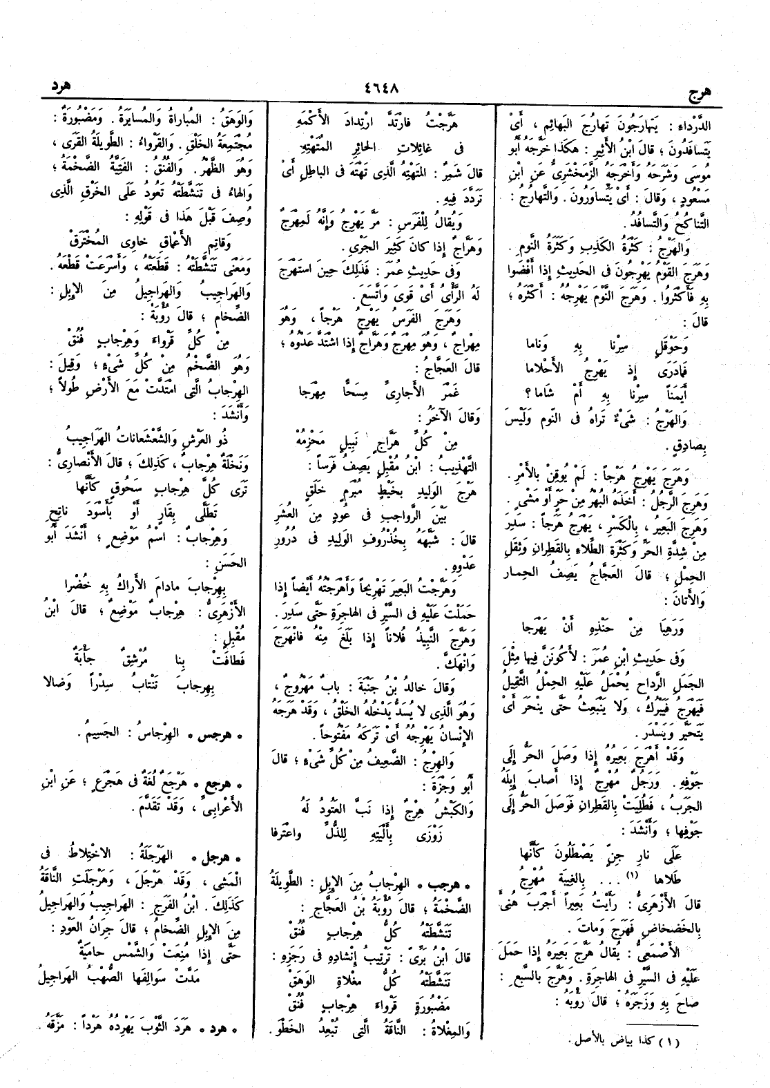 ( هرجس ) الهِرْجاسُ الجَسِيمُ ( هرجع ) هَرْجَعٌ لغة في هَجْرَعٍ عن ابن الأَعرابي وقد تقدَّم ( هرجل ) الهَرْجَلة الاختلاط في المشي وقد هَرْجَل وهَرْجَلت الناقة كذلك ابن الفرَج الهَراجِيبُ والهَراجِيلُ من الإِبل الضِّخام قال جِرَان العَوْد حتى إِذا مُنِعَتْ والشمسُ حامِيةٌ مَدَّتْ سَوالِفَها الصُّهْبُ الهَراجِيلُ ( هرد ) هَرَدَ الثوبَ يَهْرِدُه هَرْداً مَزَّقَه