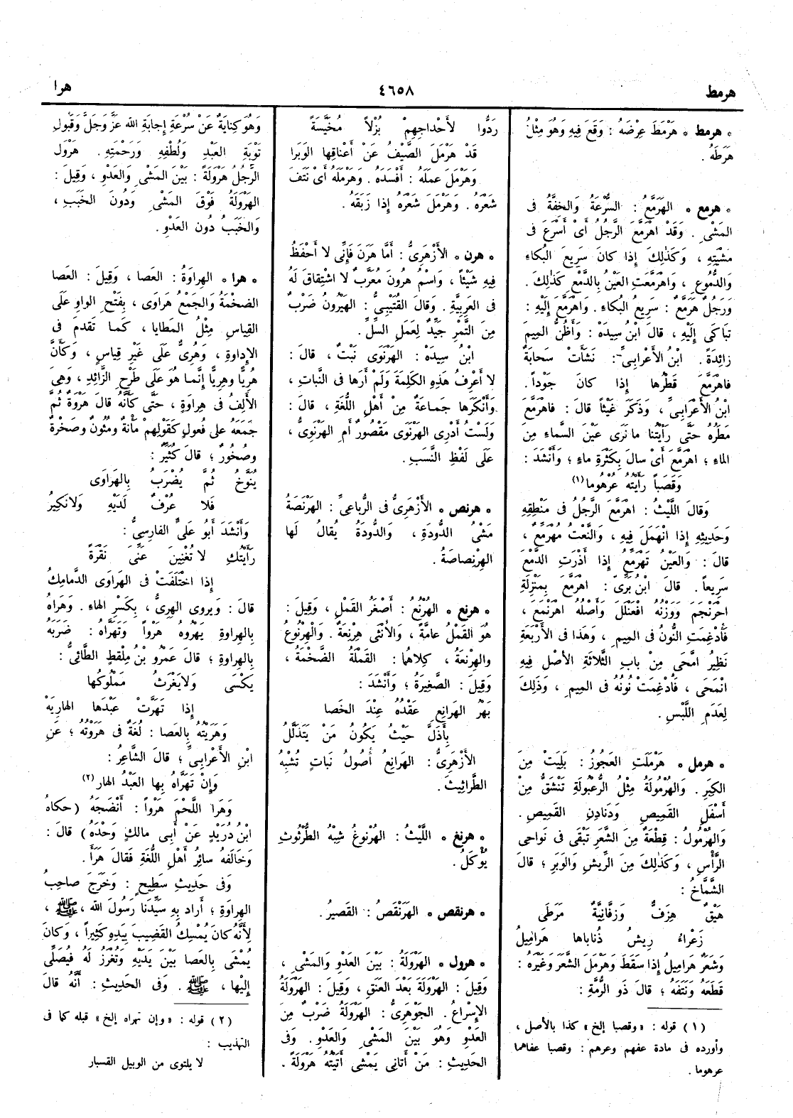 ( هرمط ) هَرْمَطَ عِرْضه وقع فيه وهو مثل هرَطه ( هرمع ) الهَرَمَّعُ السُّرْعةُ والخِفَّةُ في المَشْي وقد اهْرَمَّعَ الرجل أَي أَسْرَعَ في مَشْيَتِه وكذلك إِذا كان سَرِيعَ البُكاءِ والدُّمُوعِ واهْرَمَّعَتِ العين بالدَّمْعِ كذلك ورجل هَرَمَّعٌ سَرِيعُ البُكاء واهْرَمَّعَ إِليه تبَاكى إِليه قال ابن سيده وأَظن الميم زائدة ابن الأَعرابي نَشَأَتْ سَحابةٌ فاهْرَمَّعَ قَطْرُها إِذا كان جَوْداً ابن الأَعرابي وذكر غيثاً قال فاهْرَمَّعَ مَطَرُه حتى رأَينا ما نَرَى عين السماءِ مِن الماء اهْرَمَّعَ أَي سالَ بكثرة ماء وأَنشد وقَصَباً رأَيته عُرْهُوما