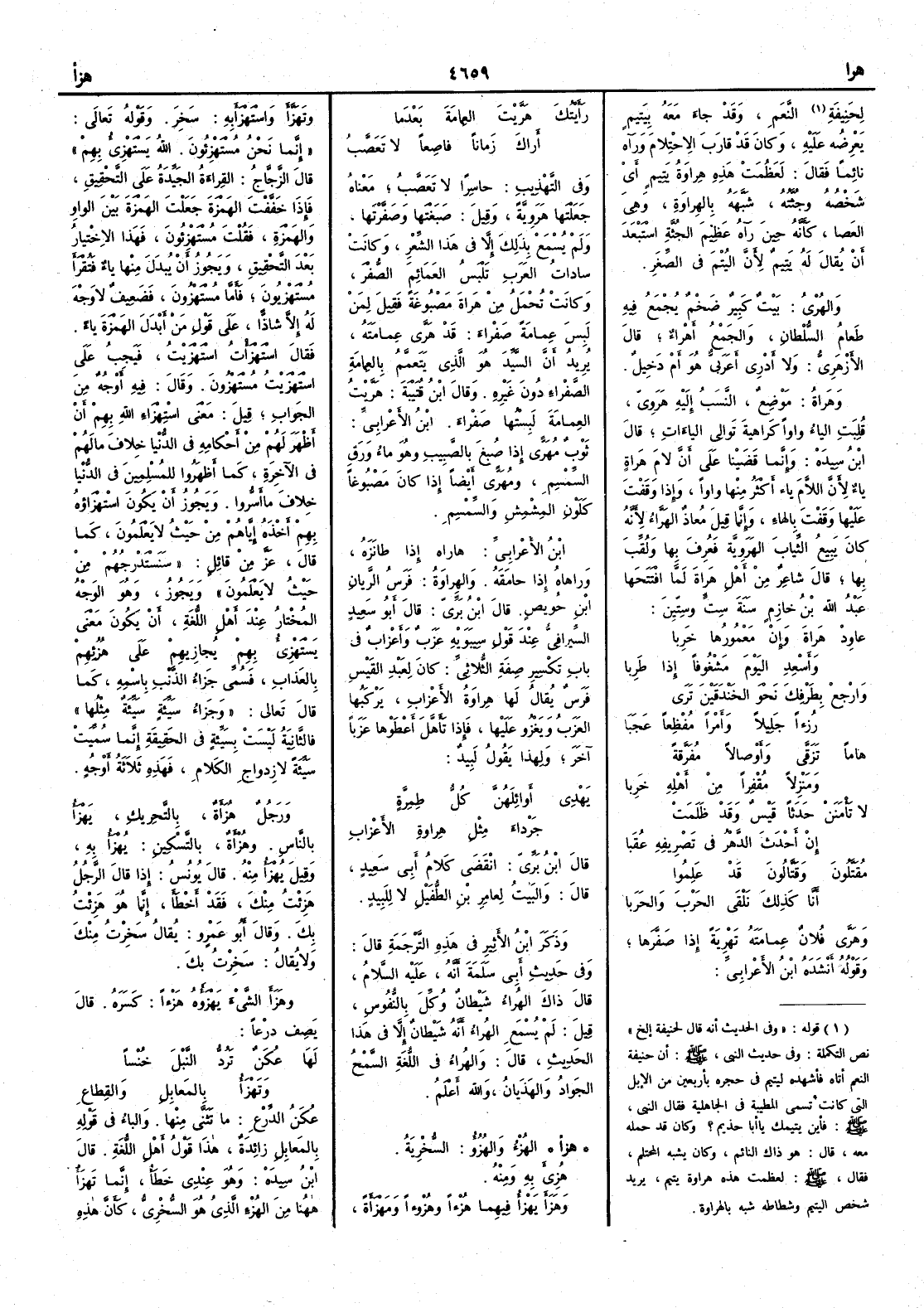 لحَنِيفةِ النَّعَمِ وقد جاء معه بيَتيمٍ يَعْرِضُه عليه وكان قد قارَبَ الاحتِلامَ ورآه نائماً فقال لعَظُمَت هذه هِراوةُ يَتيمٍ أَي شَخْصُه وجُثَّتُه شبَّهه بالهِراوة وهي العَصا كأَنه حِينَ رآه عظيم الجُثّة اسْتَبْعَدَ أَن يقال له يتيم لأَنّ اليُتْم في الصِّغَر والهُرْيُ بيت كبير ضَخْم يُجْمَع فيه طَعام السُّلْطانِ والجمع أَهْراء قال الأَزهريّ ولا أَدرِي أَعربي هو أَم دخيل وهَراةُ مَوضِعٌ النسب إِليه هَرَوِيٌّ قلبت الياء واواً كراهية توالي الياءَات قال ابن سيده وإِنما قضينا على أَنّ لام هراة ياء لأَن اللام ياء أَكثر منها واواً وإِذا وقفت عليها وقفت بالهاء وإِنما قيل مُعاذ الهَرّاء لأَنه كان يَبِيع الثيابَ الهَرَوِيّة فَعُرِفَ بها ولُقِّب بها قال شاعر من أَهل هَراةَ لما افتتحها عبد الله بن خازم سنة ؟ ؟ عاوِدْ هَراةَ وإِنْ مَعْمُورُها خَرِبا وأَسْعِدِ اليومَ مَشْغُوفاً إِذا طَرِبا وارْجِعْ بِطَرْفِكَ نَحْوَ الخَنْدَقَيْنَ تَرَى رُزءاً جَليلاً وأَمْراً مُفْظِعاً عَجَبا هاماً تَزَقَّى وأَوْصالاً مُفَرَّقةً ومَنْزِلاً مُقْفِراً مِنْ أَهْلِه خَرِبا لا تَأْمَنَنْ حَدَثاً قَيْسٌ وقد ظَلَمَتْ إِنْ أَحْدَثَ الدَّهْرُ في تَصْرِيفه عُقَبا مُقَتَّلُون وقَتّالونَ قد عَلِمُوا أَنَّا كذلِك نَلْقَى الحَرْبَ والحَرَبا وهَرَّى فلان عِمامته تَهْرِيةً إذا صَفَّرها وقوله أَنشده ابن الأَعرابي رَأَيْتُكَ هَرَّيْتَ العِمامَةَ بَعْدَما أَراك زماناً فاصِعاً لا تَعَصَّبُ وفي التهذيب حاسِراً لا تَعَصَّبُ معناه جعلتها هَرَوِية وقيل صَبَغْتَها وصفَّرتها ولم يسمع بذلك إِلا في هذا الشعر وكانت ساداتُ العرب تَلْبَسُ العمَائم الصُّفر وكانت تُحمَل من هَراةَ مَصْبوغةً فقيل لمن لَبِسَ عمامة صفراء قد هَرَّى عِمامته يريد أَن السيد هو الذي يتَعمَّم بالعِمامة الصفراء دون غيره وقال ابن قتيبة هَرَّيت العِمامة لبستها صَفْراء ابن الأَعرابي ثوب مُهَرًّى إِذا صبغ بالصَّبِيب وهو ماء ورق السمسم ومُهَرًّى أَيضاً إِذا كان مصبوغاً كلون المِشْمِش والسِّمسم ابن الأَعرابي هاراه إِذا طانَزَه وراهاه إِذا حامَقَه والهِراوةُ فَرس الرَّيان بن حُوَيْصٍ قال ابن بري قال أَبو سعيد السيرافي عند قول سيبويه عَزَبٌ وأَعْزابٌ في باب تكسير صفة الثلاثي كان لعبد القيس فرس يقال لها هِراوةُ الأَعْزاب يركبها العَزَبُ ويَغْزُو عليها فإِذا تأَهَّل أَعْطَوْها عَزَباً آخر ولهذا يقول لبيد يَهْدِي أَوائِلَهُنّ كُلُّ طِمِرَّةٍ جَرْداء مِثْلِ هِراوةِ الأَعْزابِ قال ابن بري انقضى كلام أَبي سعيد قال والبيت لعامر بن الطفيل لا للبيد وذكر ابن الأثير في هذه الترجمة قال وفي حديث أَبي سلمة أَنه عليه السلام قال ذاك الهُراء شيطان وُكِّل بالنُّفوس قيل لم يسمع الهُراء أَنه شيطان إِلا في هذا الحديث قال والهُراء في اللغة السَّمْحُ الجَوادُ والهَذَيانُ والله أَعلم