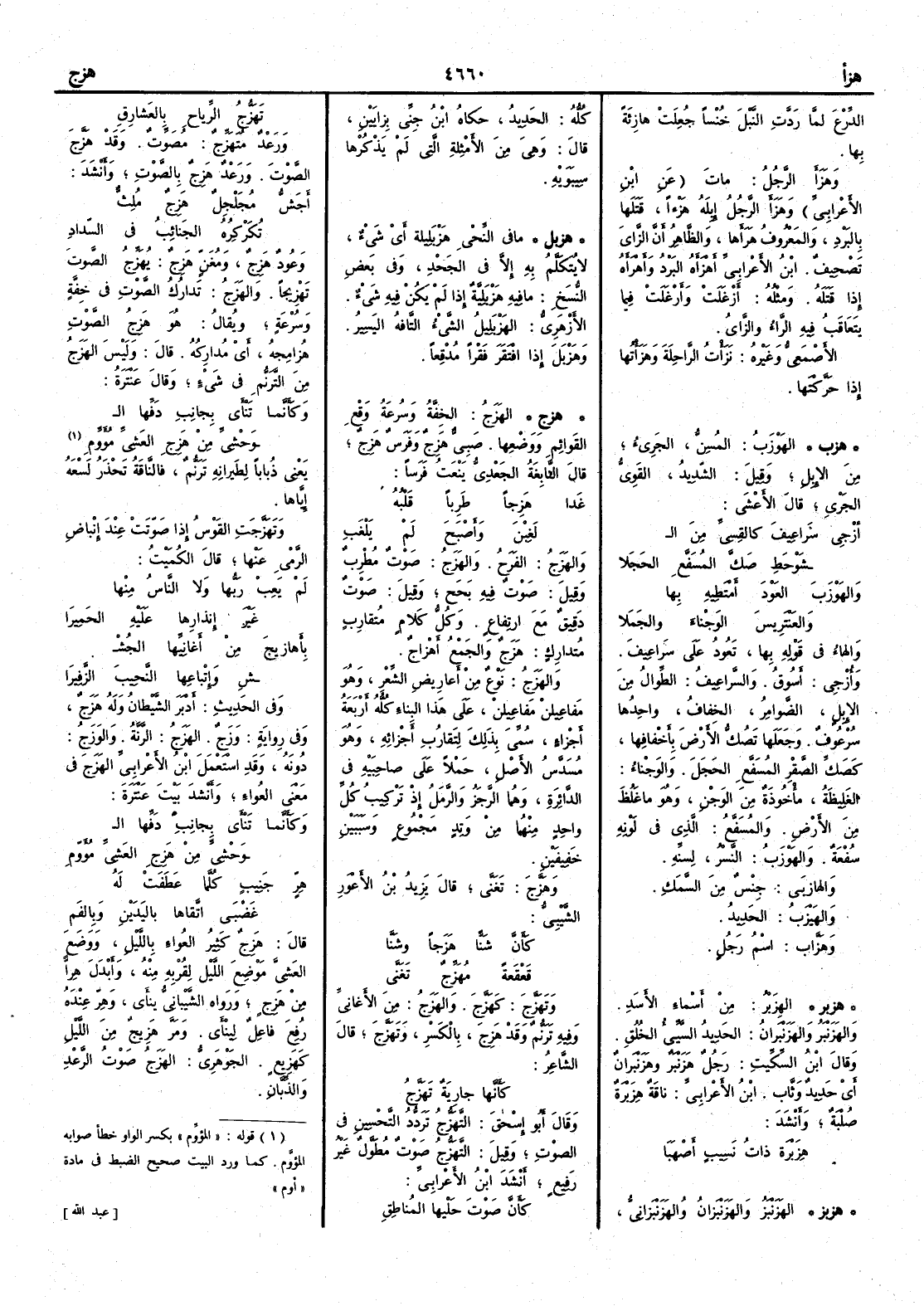 ( هزج ) الهَزَجُ الخِفَّة وسُرعةُ وَقْعِ القوائم ووضعِها صبي هَزِجٌ وفرس هَزِجٌ قال النابغة الجَعْدي يَنْعَتُ فرساً غَدا هَزِجاً طَرِباً قلبُه لَغِبْنَ وأَصْبَحَ لم يَلْغَبِ والهَزَجُ الفَرَحُ والهَزَجُ صوتٌ مُطْرِبٌ وقيل صوت فيه بَحَحٌ وقيل صوت دقيق مع ارتفاع وكلُّ كلامٍ مُتقارِبٍ مُتدارِك هَزَجٌ والجمع أَهزاج والهَزَجُ نوع من أَعاريض الشعر وهو مفاعيلن مفاعيلن على هذا البناء كله أَربعة أَجزاء سمِّي بذلك لتقارب أَجزائه وهو مُسَدَّس الأَصل حملاً على صاحبيه في الدائرة وهما الرجز والرمل إِذ تركيب كل واحد منهما من وتد مجموع وسببين خفيفين وهَزَّجَ تَغَنَّى قال يزيد بن الأَعور الشَّيْبي كأَنَّ شَنّاً هَزَجاً وشَنَّا قَعْقَعةً مُهَزِّجٌ تَغَنَّى وتَهَزَّج كهَزَّجَ والهَزَج من الأَغانيِّ وفيه تَرَنُّم وقد هَزِجَ بالكسر وتَهَزَّج قال الشاعر كأَنها جاريةٌ تَهَزَّجُ وقال أَبو إسحق التَّهَزُّج تردُّدُ التحسين في الصوت وقيل التَّهَزُّج صوت مُطَوَّل غير رفيع أَنشد ابن الأَعرابي كأَنَّ صوتَ حَلْبِها المُناطِقِ تَهَزُّجُ الرياحِ بالعَشارِقِ ورَعْدٌ مُتَهَزِّج مُصَوِّت وقد هَزَّجَ الصوتَ ورَعْدٌ هَزِجٌ بالصوت وأَنشد أَجَشُّ مُجَلْجِلٌ هَزِجٌ مُلِثٌّ تُكَرْكِرُه الجَنائِبُ في السِّدادِ وعُودٌ هَزِجٌ ومُغَنٍّ هَزِجٌ يُهَزِّجُ الصوتَ تَهْزيجاً والهَزَجُ تدارك الصوت في خِفَّة وسرعة يقال هو هَزِجُ الصوت هُزامِجُه أَي مُدارِكه قال وليس الهَزَجُ من التَّرَنُّم في شيء وقال عنترة وكأَنما تَنْأَى بجانِبِ دَفِّها ال وَحْشِيِّ من هَزِجِ العَشِيِّ مُؤَوِّمِ يعني ذباباً لطيرانه تَرَنُّمٌ فالناقة تحذر لسعه اياها وتَهَزَّجت القوس إِذا صوّتت عند إِنْباضِ الرمي عنها قال الكميت لم يَعِبْ رَبُّها ولا الناسُ منها غيرَ إِنذارها عليه الحَمِيرَا بأَهازيجَ من أَغانِيِّها الجُشْ شِ وإِتباعِها النَّحِيبَ الزَّفِيرَا وفي الحديث أَدبر الشيطان وله هَزَج وفي رواية وَزَجٌ الهَزَجُ الرَّنَّة والوَزَجُ دونه وقد استعمل ابن الأَعرابي الهَزَجَ في معنى العُواءِ وأَنشد بيت عنترة وكأَنما تنأَى بجانب دفِّها ال وحشيِّ من هَزِج العشيِّ مؤَوّمِ هِرٍّ جَنِيبٍ كلَّما عَطَفَتْ له غَضْبَى اتَّقاها باليدين وبالفَمِ قال هَزِجٌ كثير العُواء بالليل ووضع العَشِيَّ موضع الليل لقربه منه وأَبدل هِرًّا من هَزِجٍ ورواه الشيباني يَنْأَى وهِرٌّ عنده رفع فاعل لينأَى ومَرَّ هَزيجٌ من الليل كهَزيعٍ الجوهري الهَزَجُ صوتالرعل والذِّبَّانِ
