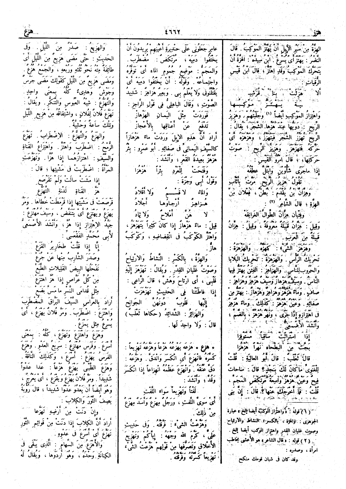 وفِتْيان هِزَّانَ الطِّوالُ الغَرانِقَهْ وقيل هِزَّانُ قبيلة معروفة وقيل هِزَّان قبيلة من العرب وهَزْهَزَ الشيءَ كَهزَّه والهَزْهَزَةُ تحريك الرأْس والهَزْهَزةُ تحريك البلايا والحروب للناس والهَزاهِزُ الفتن يَهْتَزُّ فيها الناس وسيف هَزْهازٌ وسيف هُزَهِزٌ وهُزاهِزٌ صافٍ وماء هُزْهُزٌ وهُزاهِزٌ وهَزْهازٌ يَهْتَزُّ من صفائه وعَيْنٌ هُزْهُزٌ كذلك وماء هُزَهِزٌ في اهْتِزازِه إِذا جَرى ونَهْرٌ هُزْهُزٌ بالضم وأَنشد الأَصمعي إِذا اسْتَراثَتْ ساقياً مُسْتَوْفِزا بَجَّتْ من البَطْحاءِ نَهْراً هُزْهُزا قال ثعلب قال أَبو العالية قلت للغَنَويِّ ما كان لك بنَجْدٍفقال ساحاتٌ فِيحٌ وعَيْنٌ هُزْهُزٌ واسعةُ مُرْتَكَضِ المَجَمِّ قلت فما أَخرجك عنهافقال إِن بني عامر جعلوني على حِنْدِيرَةِ أَعينهم يريدون أَن يَخْتَفُوا دَمِيَهْ مَرتكض مُضْطَرَب والمَجَمُّ موضع جُموم الماء أَي توفُّره واجتماعه وقوله أَن يختفوا دميه أَي يقتلوني ولا يُعْلَم بي وبعير هُزاهِزٌ شديد الصوت وقال الباهلي في قول الراجز فَوَرَدَتْ مِثْلَ اليَمانِ الهَزْهازْ تَدْفَعُ عن أَعْناقِها بالأَعْجازْ أَراد أَن هذه الإِبل وردت ماءً هَزْهازاً كالسيف اليماني في صفائه أَبو عمرو بئر هُزْهُزٌ بعيدة القَعر وأَنشد وفَتَحَتْ للعَرْدِ بِئْراً هُزْهُزا وقول أَبي وَجْزَةَ والماءُ لا قَسْمٌ ولا أَقْلادُ هُزاهِزٌ أَرْجاؤُها أَجْلادُ لا هُنَّ أَمْلاحٌ ولا ثِمادُ قيل ماء هَزْهازٌ إِذا كان كثيراً يَتَهَزْهَزُ واهْتَزَّ الكوكبُ يف انْقِضاضِه وكوكب هازٌّ والهِزَّةُ بالكسر النَّشاط والارتياح وصوت غليان القِدْرِ ويقال تَهَزْهَزَ إِليه قلبي أَي ارتاح وهَشَّ قال الراعي إِذا فاطَنَتْنا في الحديث تَهَزْهَزَتْ إِليها قلوبٌ دُونَهُنَّ الجَوانِحُ والهَزائِزُ الشدائد حكاها ثعلب قال ولا واحد لها ( هزع ) هَزَعَه يَهْزَعه هَزْعاً وهَزَّعه تَهْزِيعاً كَسَّرَه فانْهَزَعَ أَي انْكَسرَ وانْدَقَّ وهَزَّعَه دَقَّ عُنُقَه وانْهَزَعَ عَظْمُه انْهِزاعاً إِذا انْكَسَرَ وقُدَّ وأَنشد لَفْتاً وتَهْزِيعاً سَواءَ اللَّفْتِ أَي سَويَّ اللَّفتِ ورجل مِهْزَعٌ وأَسدٌ مِهْزَعٌ من ذلك وهَزَّعْتُ الشيءَ فَرَّقْتُهُ وفي حديث علي كرم الله وجهه إِياكم وتَهْزِيعَ الأَخْلاقِ وتَصَرُّفَها من قولهم هَزَّعْتُ الشيءَ تَهْزِيعاً كَسَّرْتُه وفَرَّقْتُه والهَزِيعُ صَدْرٌ من الليل وفي الحديث حتى مَضَى هَزِيعٌ من الليل أَي طائِفةٌ منه نحو ثلثه وربعه والجمع هُزُعٌ ومضى هَزِيعٌ من الليل كقولك مضى جَرْسٌ وَجَوْشٌ وهَدِيءٌ كله بمعنى واحد والتَّهَزُّعُ شِبْه العُبُوس والتَّنَكُّر يقال تَهَزَّعَ فلان لفلان واشْتِقاقُه من هَزيعِ الليل وتلك ساعةٌ وحْشِيَّةٌ والهَزَعُ والتَّهَزُّع الاضْطِرابُ تَهَزَّعَ الرُّمْحُ اضْطَرَبَ واهْتَزَّ واهْتِزاعُ القَناةِ والسَّيْفِ اهْتِزازُهما إِذا هُزَّا وتَهَزَّعَتِ المرأَةُ اضْطَرَبَتْ في مَشْيَتِها قال إِذا مَشَتْ سالَتْ ولم تَقَرْصَعِ هَزَّ القَناةِ لَدْنةِ التَّهَزُّعِ قَرْصَعَتْ في مَشْيَتِها إِذا قَرْمَطَتْ خُطاها ومَرَّ يَهْزَعُ ويَهْتَزِعُ أَي يَتَنَفَّضُ وسيف مُهْتَزِعٌ جيِّدُ الاهْتِزازِ إِذا هُزَّ وأَنشد الأَصمعي لأَبي محمد الفَقْعَسي إِنَّا إِذا قَلَّتْ طخَارِيرُ القَزَعْ وصَدَرَ الشَّارِبُ منها عن جُرَعْ نَفْحَلُها البِيضَ القَلِيلاتِ الطَّبَعْ من كلِّ عَرَّاصٍ إِذا هُزَّ اهْتَزَعْ مِثْلِ قُدامَى النَّسْرِ ما مَسَّ بَضَعْ أَراد بالعَرَّاصِ السيفَ البَرَّاقَ المضطَرِبَ واهْتَزَعَ اضْطَرَبَ ومَرَّ فلان يَهْزَعُ أَي يُسْرِع مثل يَمْزَع وهَزَعَ واهْتَزَعَ وتَهَزَّعَ كله بمعنى أَسْرَعَ وفرس مُهْتَزِعٌ سرِيعُ العَدْوِ وهَزَعَ الفرسُ يَهْزَعُ أَسْرَعَ وكذلك الناقة وهَزَعَ الظَّبْيُ يَهْزَعُ هَزْعاً عَدا عَدْواً شَدِيداً ومَرَّ فلان يَهْزَعُ ويَقْزَعُ 