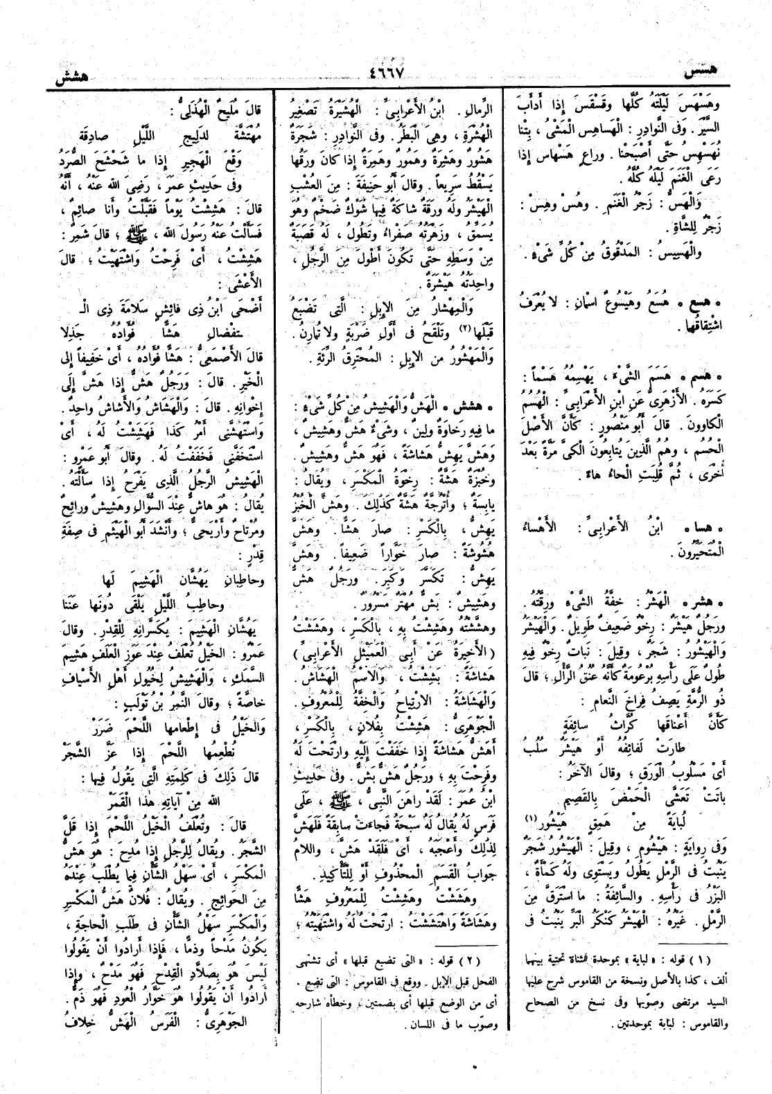 ألف كذا بالأصل ونسخة من القاموس شرح عليها السيد مرتضى وصوَّبها وفي نسخ من الصحاح والقاموس لبابة بموحدتين وفي رواية هَيْشُوم وقيل الهيشور شجر ينبت في الرمل يطول ويستوي وله كمأَة البَزْرُ في رأْسه والسائفة ما استرق من الرمل غيره الهَيْشَرُ كَنْكَرُ البَرِّ ينبت في الرمال ابن الأَعرابي الهُشَيْرَةُ تصغير الهُشْرَةِ وهي البَطَرُ وفي النوادر شجرة هَشُورٌ وهَشِرَةٌ وهَمُورٌ وهَمِرَةٌ إِذا كان ورقها يسقط سريعاً وقال أَبو حنيفة من العُشْب الهَيْشَرُ وله ورقة شاكَةٌ فيها شَوْكٌ ضخم وهو يُسَمِّقُ وزهرته صفراء وتطولُ له قصبةٌ من وسطه حتى تكون أَطول من الرجل واحدته هَيْشَرَةٌ