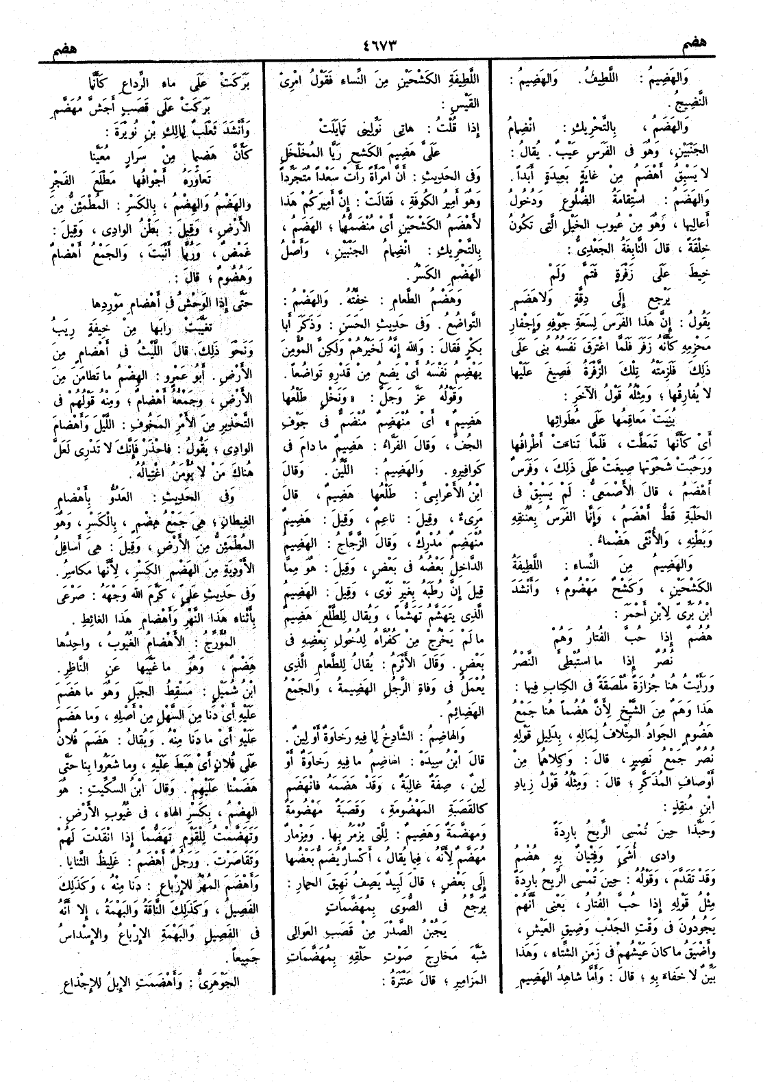 والهَضِيمُ اللَّطيف والهَضِيمُ النَّضِيجُ والهَضَمُ بالتحريك انضِمامُ الجَنْبينِ وهو في الفرس عيبٌ يقال لا يَسْبِقُ أَهْضَمُ من غاية بعيدةٍ أبداً والهَضَمُ استقامةُ الضلوع ودخولُ أَعالِيها وهو من عيوب الخيل التي تكون خِلْقةً قال النابغة الجعدي خِيطَ على زَفْرَةٍ فتَمَّ ولمْ يَرْجِع إلى دِقَّةٍ ولا هَضَمِ يقول إن هذا الفرسَ لِسَعةِ جوفهِ وإجْفارِ مَحْزِمهِ كأَنه زفَرَ فلما اغْترَقَ نفَسُه بُنِيَ على ذلك فلزِمته تلك الزَّفْرة فصِيغَ عليها لا يُفارِقُها ومثله قول الآخر بُنِيَتْ مَعاقِمُها على مُطَوائها أي كأَنها تَمَطَّت فلما تناءَت أَطرافُها ورحُبَت شَحْوَتها صِيغَت على ذلك وفرسٌ أَهْضَمُ قال الأَصمعي لم يَسْبِقْ في الحَلْبة قَطّ أَهْضَمُ وإنما الفرسُ بعُنُقهِ وبَطْنهِ والأُنثى هَضْماءُ والهَضِيمُ من النساء اللطيفةُ الكَشْحَينِ وكَشْحٌ مَهْضومٌ وأَنشد ابن بري لابن أحمر هُضُمٌ إذا حُبَّ الفُتارُ وهُمْ نُصُرٌ وإذا ما استُبْطِئَ النَّصْرُ ورأَيت هنا جُزازة مُلْصقَة في الكتاب فيها هذا وهَمٌ من الشيخ لأَن هُضُماً هنا جمعُ هَضومٍ الجَوادُ المِتْلافُ لمالهِ بدليل قوله نُصُر جمع نَصِير قال وكلاهما من أَوصاف المذكر قال ومثله قول زياد ابن مُنقِذ وحَبَّذا حين تُمْسي الريحُ بارِدةً وادي أُشَيٍّ وفِتْيانٌ به هُضُمُ وقد تقدم وقوله حين تمسي الريح باردة مثلُ قوله إذا حُبَّ الفُتارُ يعني أَنهم يَجُودون في وقت الجَدْب وضيقِ العيشِ وأَضْيَقُ ما كان عيشُهم في زمن الشتاء وهذا بيِّنٌ لا خفاء به قال وأما شاهدُ الهَضِيم اللطيفةِ الكَشحين من النساء فقول امرئ القيس إذا قلتُ هاتي نَوِّلِيني تَمايَلَتْ عليَّ هَضيم الكَشحِ رَيَّا المُخَلخَلِ وفي الحديث أن امرأَة رأَت سَعْداً مُتَجَرِّداً وهو أميرُ الكوفةِ فقالت إن أَميرَكم هذا لأَهْضَمُ الكَشْحينِ أي مُنْضَمُّهما الهَضَمُ بالتحريك انضمامُ الجنبينِ وأصلُ الهَضْمِ الكسر وهَضْمُ الطعامِ خِفَّتُه والهَضْمُ التواضُعُ وفي حديث الحسن وذكَر أَبا بكرٍ فقال والله إنه لَخَيْرُهم ولكن المؤْمِن يَهْضِم نفْسَه أي يَضعُ من قَدْرهِ تَواضُعاً وقوله عز وجل ونَخْلٍ طَلْعُها هَضِيمٌ أَي مُنْهَضِمٌ مُنْضَمٌّ في جوف الجُفِّ وقال الفراء هَضِيمٌ ما دام في كَوافيرهِ والهَضِيمُ اللَّيِّنُ وقال ابن الأَعرابي طَلْعُها هَضيم قال مَرِيءٌ وقيل ناعِمٌ وقيل هَضيمٌ مُنْهَضِم مُدْرِك وقال الزجاج الهَضِيم الداخلُ بعضُه في بعض وقيل هو مما قيل إن رُطَبَه بغير نَوىً وقيل الهَضيمُ الذي يتَهَشَّم تَهَشُّماً ويقال للطلع هَضِيم ما لم يخرج من كُفُرّاهُ لدخول بعضه في بعض وقال الأَثْرَمُ يقال للطعام الذي يُعْمَل في وَفاةِ الرجل الهَضِيمة والجمع الهَضائم والهاضِمُ الشادخُ لما فيه رخاوةٌ أو لينٌ قال ابن سيده الهاضِمُ ما فيه رخاوةٌ أو لينٌ صفة غالبة وقد هَضَمه فانْهَضَم كالقَصَبة المَهْضومة وقصبَةٌ مَهْضومةٌ ومُهَضَّمةٌ وهَضِيم للتي يُزْمَرُ بها ومِزْمارٌ مُهَضَّمٌ لأَنه فيما يقال أَكْسارٌ يُضمّ بعضها إلى بعض قال لبيد يصف نهيق الحمار يُرَجِّعُ في الصُّوَى بمُهَضَّماتٍ يَجُبْنَ الصَّدْرَ من قَصَبِ العَوالي شبَّه مخارجَ صوتِ حَلْقهِ بمُهَضَّماتِ المَزامير قال عنترة بَرَكَتْ على ماءِ الرِّداعِ كأَنما بركتْ على قَصَبٍ أَجَشَّ مُهَضَّم وأَنشد ثعلب لمالك بن نُوَيرَةَ كأَن هَضيماً من سَرارٍ مُعَيَّناً تَعاوَرَه أَجْوافُها مَطْلَع الفَجْرِ والهَضْمُ والهِضْمُ بالكسر المطمئنُّ من الأَرض وقيل بَطْنُ الوادي وقيل غَمْضٌ وربما أَنْبَتَ والجمع أَهْضامٌ وهُضومٌ قال حتى إذا الوَحْش في أَهْضامِ مَوْرِدِها تغَيَّبَتْ رابَها من خِيفةٍ رِيَبُ ونحوَ ذلك قال الليث في أَهْضامٍ من الأَرض أَبو عمرو الهِضْمُ ما تَطامَن من الأَرض وجمعه أَهْضامٌ ومنه قولهم في التحذير من الأمر المَخُوف الليلَ وأَهْضامَ الوادي يقول فاحْذَرْ فإنك لا تدري لعلَّ هناك