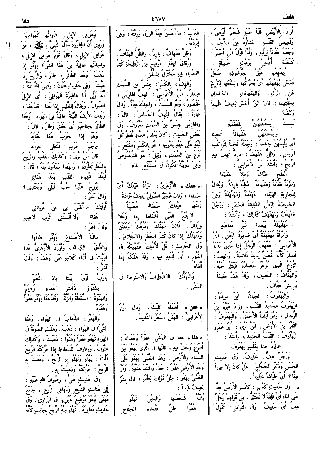 ( هفك ) الأَزهري امرأَة هَيْفَكٌ أَي حمقاء وقال عُجَيْرٌ السَّلُولُّي يصف مَزَادَةً زَمَّتهما هَيْفَكٌ حَمقْاءُ مُصْبِيَةٌ لا يتبعُ العين أَشْقاها إِذا وَغَلا ويقال فلان مِهَفَّكٌ ومُؤَفَّكٌ ومُفَنِّنٌ ومُتَهَفِّكٌ إِذا كان كثير الخطإِ والاختلاط وفي الحديث قل لأُمَّتك فلْتَهْفِكْه في القبور أَيِلِتُلْقِه فيها وقد هَفَكه إِذا أَلقاه والتَّهَفُّك الاضطراب والاسترخاء في المشي ( هفن ) أَهمله الليث وقال ابن الأَعرابي الهَفْنُ المطر الشديد( هفا ) هَفا في المشي هَفْواً وهَفَواناً أَسرع وخَفَّ فيه قالها في الذي يَهْفُو بين السماء والأَرض وهَفا الظَّبْي يَهْفُو على وجه الأَرض هَفْواً خَفَّ واشْتَدَّ عَدْوُه ومرَّ الظبيُ يَهْفُو مثل قولك يَطْفُو قال بشر يصف فرساً يُشَبِّه شَخْصُها والخَيْلُ تَهْفُو هُفُوًّا ظِلَّ فَتْخاءِ الجَناحِ وهَوافِي الإِبل ضَوالُّها كهَوامِيها وروي أَن الجارُودَ سأَل النبي صلى الله عليه وسلم عن هَوافِي الابِلِ وقال قوم هَوامِي الإِبل واحدتها هافِيةٌ من هَفا الشيءِ يَهْفُو إِذا ذَهَب وهَفا الطائرُ إِذا طارَ والرِّيحُ إِذا هَبَّتْ وفي حديث عثمان رضي الله عنه أَنه وَلَّى أَبا غاضِرةَ الهَوافِيَ أَي الإِبلَ الضَّوالَّ ويقال للظليم إِذا عَدا قد هَفا ويقال الأَلف اللينة هافِيةٌ في الهَواء وهَفا الطائرُ بجناحَيْهِ أَي خَفَقَ وطارَ قال وهْوَ إِذا الحَرْبُ هَفا عُقابُه مِرْجَمُ حَرْبٍ تَلْتَظِي حِرابُه قال ابن بري وكذلك القَلْبُ والرِّيحُ بالمطر تَطْرُدُه والهَفاء ممدود منه قال أَبَعْدَ انْتِهاء القَلْبِ بَعْدَ هَفائِه يَرُوحُ عَلَيْنا حُبُّ لَيْلَى ويَغْتَدِي ؟ وقال آخر أُولئكَ ما أَبْقَيْنَ لي مِنْ مُرُوءتي هَفاء ولا أَلْبَسْنَني ثَوبَ لاعِبِ وقال آخر سائلةُ الأَصْداغِ يَهفُو طاقُها والطاقُ الكِساء وأَورد الأَزهري هذا البيت في أثناء كلامه على وهف وقال آخر يا ربِّ فَرِّقْ بَيْنَنا يا ذا النِّعَمْ بشَتْوةٍ ذاتِ هَفاء ودِيَمْ والهَفْوَةُ السَّقْطة والزَّلَّة وقد هَفا يَهْفُو هَفْواً وهَفْوةً والهَفْوُ الذَّهاب في الهواء وهَفا الشيء في الهواء ذهب وهَفَت الصُّوفة في الهَواء تَهْفُو هَفْواً وهُفُوًّا ذهبت وكذلك الثوب ورَفارِفُ الفُسطاط إِذا حرّكته الرّيح قلت يَهْفُو وتَهْفُو به الرّيح وهَفَت به الرّيحُ حرَّكته وذَهَبت به وفي حديث علي رضوان الله عليه إِلى مَنابِتِ الشِّيحِ ومَهافِي الرِّيحِ جمع مَهْفًى وهو موضع هُبُوبها في البراري وفي حديث معاوية تَهْفُو منه الرِّيحُ بجانِبٍ كأَنه