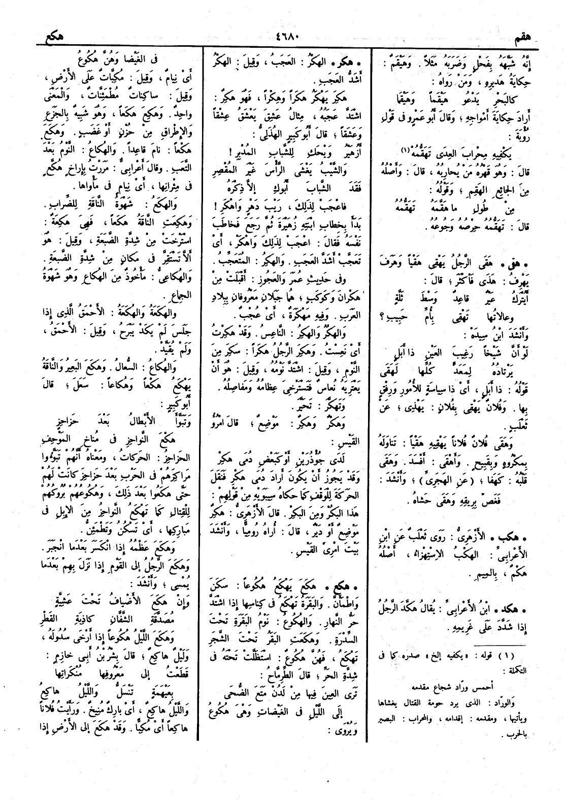 ( هقي ) هقَى الرجل يَهْقِي هَقْياً وهَرَف يَهْرِفُ هَذى فأَكثر قال أَيُتْرَكُ عَيرٌ قاعِدٌ وَسْطَ ثَلَّةٍ وِعالاتُها تَهْقِي بأُمِّ حَبِيبِ ؟ وأَنشد ابن سيده لو أَنَّ شَيْخاً رَغِيبَ العَيْنِ ذا أَبَلٍ يَرْتادُه لِمَعَدٍّ كُلِّها لَهَقَى قوله ذا أَبَلٍ أَي ذا سِياسةٍ للأُمور ورِفْق بها وفلان يَهْقِي بفلان يَهْذِي عن ثعلب وهَقَى فلان فلاناً يَهْقِيه هَقْياً تَناوَله بمكروه وبقَبيح وأَهْقَى أَفْسَدَ وهَقَى قلبُه كهَفَا عن الهجري وأَنشد فغَصَّ بِريقه وهَقَى حَشاه ( هكب ) الأَزهري روى ثعلب عن ابن الأَعرابي الهَكْبُ الاسْتِهْزاءُ أَصلُه هَكْمٌ بالميم ( هكد ) ابن الأَعرابي يقال هَكَّدَ الرجل إِذا شَدَّدَ على غريمه( هكر ) الهَكْرُ العَجَبُ وقيل الهَكْرُ أَشدُّ العجبِ هَكِرَ يَهْكَرُ هَكَراً وهِكْراً فهو هَكِرٌ اشتدَّ عَجَبُه مثال عَشِقَ يَعشَقُ عِشْقاً وعَشَقاً قال أَبو كَبِير الهذلي أَزُهَيْرُ وَيْحَكِ لِلشَّبابِ المُدْبِرِ والشَّيْبُ يَغْشَى الرأْسَ غَيْرَ المُقْصِرِ فَقَدَ الشَّبابَ أَبوكِ إِلا ذِكْرَه فاعْجَبْ لذلك رَيْبَ دَهْرٍ واهْكَرِ بدأَ بخطاب ابنته زهيرة ثم رجع فخاطب نفسه فقال اعجب لذلك واهْكَر أَي تعجب أشدّ العجب والهَكِرُ المُتَعَجِّبُ وفي حديث عمر والعجوز أَقبلت من هَكْرانَ وكَوكَبٍ هما جبلان معروفان ببلاد العرب وفيه مَهْكَرَة أَي عُجْبٌ والهَكُرُ والهَكِرُ الناعِسُ وقد هَكِرْتُ أَي نَعِسْتُ وهَكِرَ الرجلُ هَكَراً سَكِرَ من النوم وقيل اشتد نومه وقيل هو أَن يعتريه نُعاس فتسترخي عظامه ومفاصله وتَهَكَّرَ تَحَيَّرَ وهَكْرٌ وهَكِرٌ موضع قال امرؤ القيس لَدَى أَو كَبَعْضِ دُمى هَكِرْ وقد يجوز أَن يكون أَراد دُمى هَكْرِ فنقل الحركة للوقف كما حكاه سيبويه من قولهم هذا البَكُرْ ومن البَكِرْ قال الأَزهري هَكِرٌ موضع أَو دَيْرٌ قال أُراه رُومِيًّا وأَنشد بيت امرئ القيس( هكع ) هَكَعَ يَهْكَعُ هُكُوعاً سَكَنَ واطْمأَنَّ والبقرةُ تَهْكَعُ في كِناسِها إِذا اشتدّ حرّ النهار والهُكُوعُ نَوْمُ البقرة تحت السِّدْرَةِ وهَكَعَتِ البقرُ تحت الشجر تَهْكَعُ فهنّ هُكُوعٌ اسْتَظَلَّت تحته في شدَّة الحرّ قال الطرمّاحُ تَرَى العِينَ فيها مِن لَدُنْ مَتَعَ الضُّحَى إِلى اللَّيْلِ في الغَيْضاتِ وهْيَ هُكُوعُْ ويروى في الغَيْضا وهُنَّ هُكُوعُ أَي نِيامٌ وقيل مُكِبَّاتٌ على الأرض وقيل ساكِناتٌ مُطْمَئِنَّاتٌ والمعنى واحد وهَكِعَ هَكَعاً وهو شبيه بالجَزَعِ والإِطْراقِ من حُزْنٍ أَو غَضَبٍ وهَكَعَ هَكْعاً نام قاعِداً والهُكاعُ النومُ بعد التعبِ وقال أَعرابي مَرَرْتُ بِإِراخٍ هُكَّعٍ في مِئْرانِها أَي نِيامٍ مَأْواها والهَكَعُ شَهْوةُ الناقةِ للضِّرابِ وهَكِعَتِ الناقةُ هَكَعاً فهي هَكِعةٌ اسْتَرْخَتْ من شدَّةِ الضَّبَعةِ وقيل هو أَن لا تَسْتَقِرَّ في مكانٍ من شدَّة الضَّبَعة ِ والهُكاعِيُّ مأْخُوذٌ من الهُكاعِ وهو شهوةُ الجِماعِ والهَكعةُ والهُكَعَةُ الأَحْمَقُ الذي إِذا جلس لم يَكَدْ يَبْرَحُ وقيل الأَحمق ولم يُقَيَّدْ والهُكاعُ السُّعالُ وهَكَعَ البيعرُ والناقةُ يَهْكَعُ هَكْعاً وهُكاعاً سَعَلَ قال أَبو كبير وتبَوَّأ الأَبْطالُ بَعْدَ حَزاحِزٍ هَكْعَ النَّواحِزِ في مُناخِ المَوْحِفِ الحَزاحِزُ الحَركاتُ ومعناه أَنهم تَبَوَّأُوا مَراكِزَهم في الحرب بعد حَزاحِزَ كانت لهم حتى هَكَعُوا بعد ذلك وهُكوعُهم بُرُوكُهم للقتال كما تَهْكَعُ النواحِز من الإِبل في مبَارِكها أَي تسكن وتطمئن وهَكَعَ عَظْمُه إِذا انكسر بعدما انجبر وهَكَعَ الرجلُ إِلى القوْمِ إِذا نَزَل بهم بعدما يُمْسِي وأَنشد وإِنْ هَكَعَ الأَضْيافُ تَحْتَ عشِيّةٍ مُصَدّقةِ الشَّفَّانِ كاذِبةِ القَطْرِ وهَكَعَ الليلُ هُكُوعاً إِذا أَرْخَى سُدُولَه ولَيْلٌ هاكِعٌ قال بِشْرُ بن أَبي خازم قَطَعْتُ إِلى مَعْرُوفِها مُنْكَراتِها بِعَيْهَمةٍ تَنْسَلُّ والليلُ هاكِعُ 