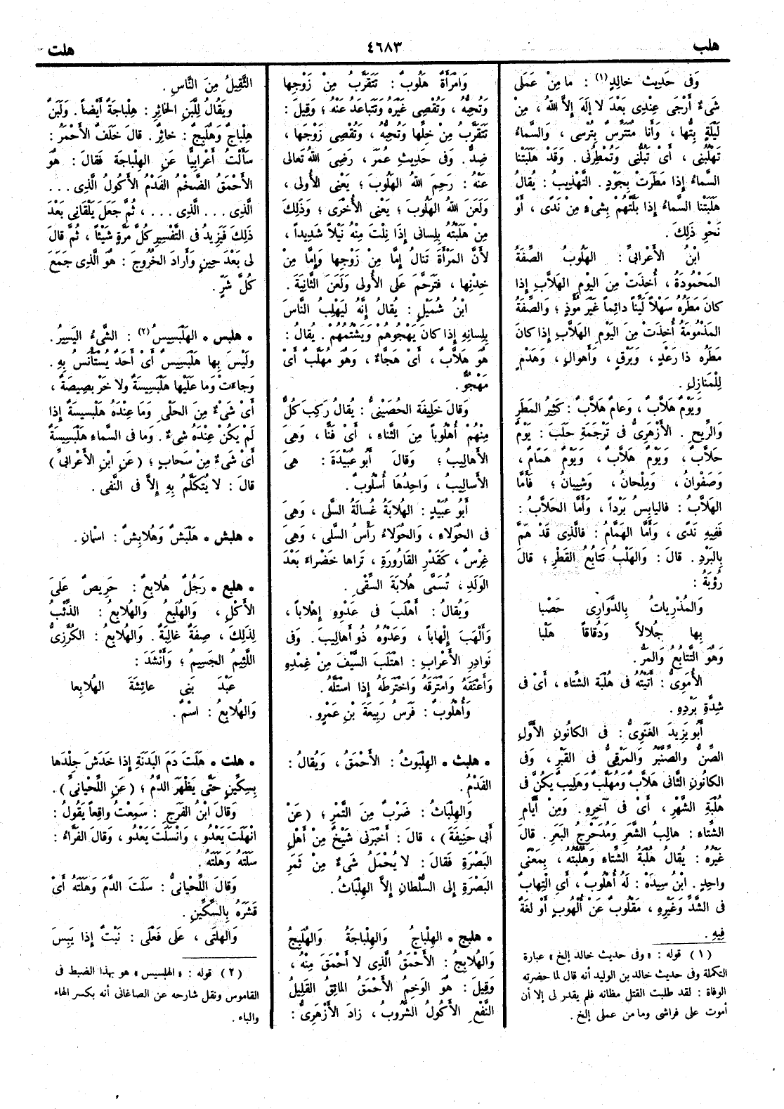 ( 2 قوله « وفي حديث خالد إلخ » عبارة التكملة وفي حديث خالد بن الوليد أنه قال لما حضرته الوفاة لقد طلبت القتل مظانه فلم يقدر لي إلا أن أموت على فراشي وما من عملي إلخ ) ما من عملي شيءٌ أَرْجى عِنْدي بعد لا إِله إِلاَّ اللّه من ليلةٍ بِتُّها وأَنا مُتَتَرِّسٌ بتُرْسِي والسماءُ تَهْلُبني أَي تَبُلُّني وتُمْطِرُني وقد هَلَبَتْنا السماءُ إِذا مَطَرَتْ بجَودٍ التهذيب يقال هَلَبَتْنا السماءُ إِذا بَلَّتْهم بشيءٍ من نَدًى أَو نحو ذلك ابن الأَعرابي الهَلُوبُ الصِّفَةُ المحمودةُ أُخِذَتْ من اليوم الهَلاَّبِ إِذا كان مَطَرُه سَهْلاً لَيِّناً دائِماً غَيرَ مُؤْذٍ والصِّفةُ المَذْمُومة أُخِذَتْ من اليوم الهَلاَّبِ إِذا كان مَطَرُه ذا رَعْدٍ وبَرْقٍ وأَهوالٍ وهَدْم للمنازل ويومٌ هَلاَّبٌ وعامٌ هَلاَّبٌ كثير المَطَر والريح الأَزهري في ترجمة حلب يوم حَلاَّبٌ ويوم هَلاَّبٌ ويوم هَمَّامٌ وصَفْوانُ ومِلْحانُ وشِيبانُ فأَمَّا الهَلاَّبُ فاليابِسُ بَرْداً وأَما الحَلاَّبُ ففيه نَدًى وأَما الهَمَّام فالذي قد هَمً بالبَرْد قال والهَلْبُ تَتابُع القَطْر قال رؤبة والمُذْرِياتُ بالدَّوَارِي حَصْبا بها جُلالاَ ودُقاقاً هَلْبا وهو التَّتابُعُ والمَرُّ الأُمَوِيُّ أَتَيْتُه في هُلْبة الشِّتاءِ أَي في شِدَّة بَرْدِه أَبو يَزيدَ الغَنَوِيُّ في الكانونِ الأَول الصِّنُّ والصِّنَّبْرُ والمَرْقِيُّ في القَبْر وفي الكانون الثاني هَلاَّبٌ ومُهَلَّبٌ وهَلِيبٌ يَكُنَّ في هُلْبةِ الشَّهْر أَي في آخره ومن أَيام الشتاءِ هالِبُ الشَّعَر ومُدَحْرِجُ البَعَرِ قال غيره يقال هُلْبةُ الشتاءِ وهُلُبَّتُه بمعنى واحد ابن سيده له أُهْلُوبٌ أَي الْتِهابٌ في [ ص 788 ] الشَّدِّ وغيره مقلوبٌ عن أُلْهُوبٍ أَو لغةٌ فيه وامرأَةٌ هَلُوبٌ تَتَقَرَّبُ من زَوجِها وتُحِبُّه وتُقْصِي غيرَه وتَتَباعَدُ عنه وقيل تَتقرَّبُ مِن خِلِّها وتُحِبُّه وتُقْصِي زَوجَها ضِدُّ وفي حديث عمر رضي اللّه تعالى عنه رَحِمَ اللّه الهَلوبَ يَعني الأُولى ولَعَنَ اللّهُ الهَلُوبَ يَعْني الأُخرى وذلك من هَلَبْتُه بلساني إِذا نِلْتَ منه نَيْلاً شديداً لأَن المرأَة تَنالُ إِما من زوجها وإِما من خِدْنِها فتَرَحَّمَ على الأُولى ولَعَنَ الثانيةَ ابن شميل يقال إِنه ليَهْلِبُ الناسَ بلِسانه إِذا كان يَهْجُوهم ويَشْتُمهم يقال هو هَلاَّبٌ أَي هَجَّاءٌ وهو مُهَلَّبٌ أَي مَهْجُوٌّ وقال خليفة الحُصَيْنِيُّ يقال رَكِبَ كلٌّ منهم أُهْلُوباً من الثَّناءِ أَي فَنّاً وهي الأَهالِيبُ وقال أَبو عبيدة هي الأَسالِيبُ واحدها أُسْلُوبٌ أَبو عبيد الهُلاَّبةُ غُسالةُ السَّلى وهي في الحُوَلاءِ والحُوَلاءُ رأْسُ السَّلى وهي غِرْسٌ كقَدْرِ القَارورةِ تَراها خَضْراء بَعْدَ الوَلدِ تُسَمَّى هُلابَةَ السِّقْيِ ويقال أَهْلَبَ في عَدْوِه إِهْلاباً وأَلْهَبَ إِلهاباً وعَدْوُه ذو أَهالِيبَ وفي نوادر الأَعراب اهْتَلَبَ السيفَ من غِمْده وأَعْتَقَه وامْتَرقَه واخْتَرَطَه إِذا اسْتَلَّه وأُهْلُوبٌ فرسُ ربيعة بن عمرو