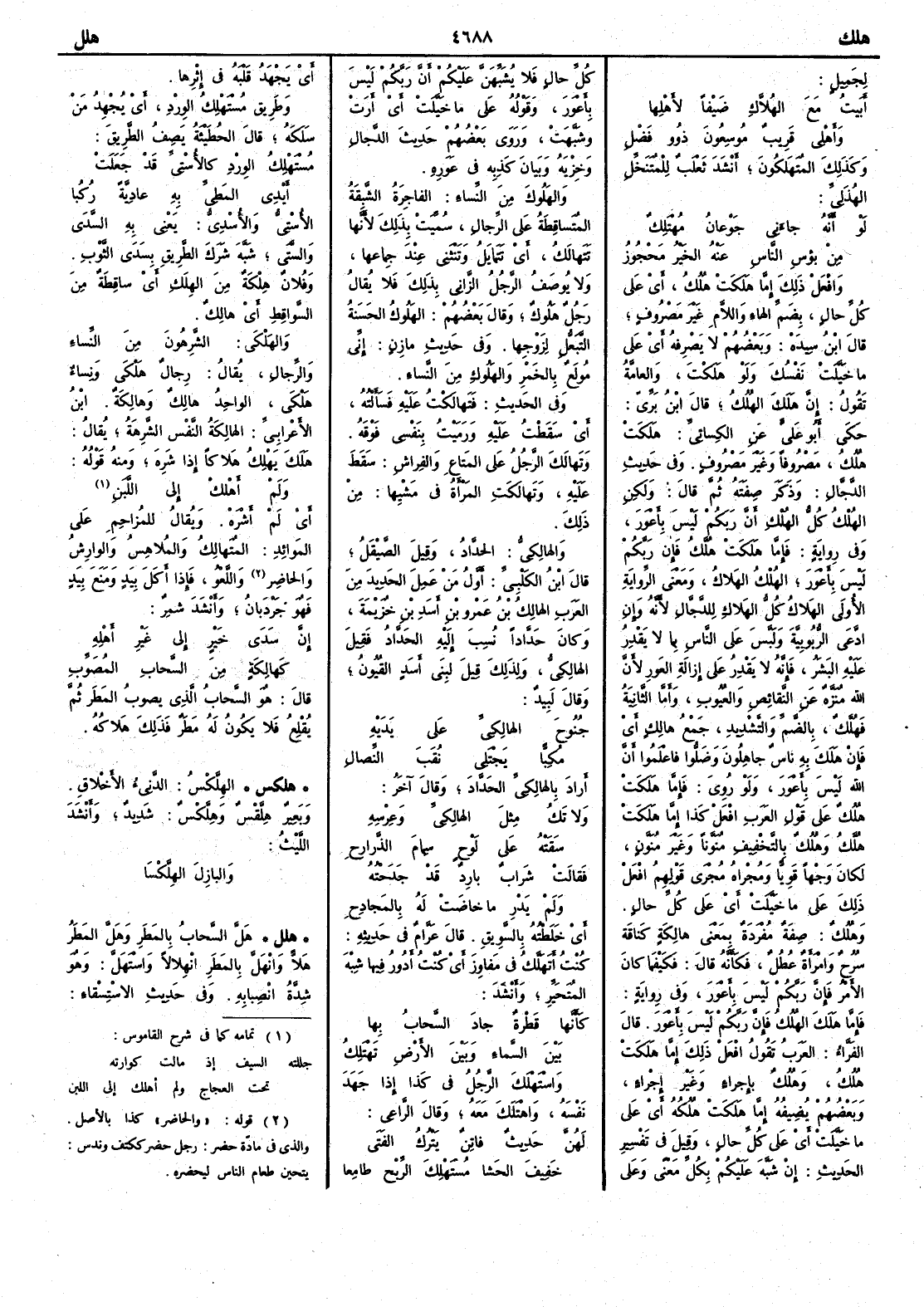 لجَمِيل أبِيتُ مع الهُلاّكِ ضَيْفاً لأهْلِها وأهْلي قريبٌ مُوسِعُون ذوو فَضْلِ وكذلك المُتَهَلِّكُون أنشد ثعلب للمُتَنَخِّل الهُذَليّ لو أنه جاءني جَوْعانُ مُهْتَلِكٌ من بُؤَّس الناس عنه الخيْرُ مَحْجُوزُ وافْعَلْ ذلك إما هَلَكَتْ هُلُكُ أي على كل حال بضم الهاء واللام غير مصروف قال ابن سيده وبعضهم لا يصرفه أي على ما خَيَّلَتْ نَفْسُك ولو هَلَكْتَ والعامَّة تقول إن هَلَكَ الهُلُكُ قال ابن بري حكى أبو علي عن الكسائي هَلَكَتْ هُلُكُ مصروفاً وغير مصروف وفي حديث الدجال وذكر صفته ثم قال ولكن الهُلْكُ كلُّ الهُلْكِ أن ربكم ليس بأعور وفي رواية فإما هَلَكَتْ هُلَّكُ فإن ربكم ليس بأعور الهُلْكُ الهَلاك ومعنى الرواية الأولى الهَلاكُ كلُّ الهَلاك للدجال لأنه وإن ادّعى الربوبية ولَبَّس على الناس بما لا يقدر عليه الشر فإنه لا يقدر على إزالة العَور لأن الله منزه عن النقائص والعيوب وأما الثانية فهُلَّكٌ بالضم والتشديد جمع هالك أي فإن هَلَكَ به ناس جاهلون وضلُّوا فاعلموا أن الله ليس بأعور ولو روي فإما هَلَكَتْ هُلُك على قول العرب افعل كذا إما هَلَكَتْ هُلَّكُ وهُلُكٌ بالتخفيف منوَّناً وغير منوّن لكان وجهاً قويّاً ومُجْراه مُجْرى قولهم افْعَلْ ذلك على ما خَيَّلَتْ أي على كل حال وهُلُكٌ صفة مفردة بمعنى هالكة كناقة سُرُحٌ وامرأة عُطُلٌ فكأنه قال فكيفما كان الأمر فإن ربكم ليس بأعور وفي رواية فإما هَلَكَ الهُلُكُ فإن ربكم ليس بأعور قال الفراء العرب تقول افعل ذلك إما هَلَكَتْ هُلُكُ وهُلُكٌ بإجراءٍ وغير إجراء وبعضهم يُضيفه إما هَلَكتْ هُلُكُه أي على ما خَيَّلَتْ أي على كل حال وقيل في تفسير الحديث إن شَبَّه عليكم بكل معنىً وعلى كل حال فلا يُشَبِّهَنَّ عليكم أنَّ ربكم ليس بأعور وقوله على ما خَيَّلَتْ أي أرَتْ وشَبَّهَتْ وروى بعضهم حديث الدجال وخزيه وبيان كذبه في عوره والهَلُوك من النساء الفاجرة الشَّبِقَةُ المتساقطة على الرجال سميت بذلك لأنها تَتهالك أي تَتَمايل وتنثني عند جماعها ولا يوصف الرجل الزاني بذلك فلا يقال رجل هَلُوكٌ وقال بعضهم الهَلُوك الحَسَنة التَّبَعُّلِ لزوجها وفي حديث مازِنٍ إني مُولَعٌ بالخمر والهَلُوكِ من النساء وفي الحديث فتهالَكْتُ عليه فسألته أي سقطت عليه ورميت بنفسي فوقه وتَهالك الرجلُ على المتاع والفِراشِ سقط عليه وتَهالَكَتِ المرأةُ في مشيها من ذلك والهالِكِيُّ الحدَّادُ وقيل الصَّيْقَل قال ابن الكلبي أوّل من عَمِلَ الحديدَ من العرب الهالكُ بن عمرو بن أسَد بن خُزيْمة وكان حدّاداً نسب إليه الحدّاد فقيل الهالِكيُّ ولذلك قيل لبني أسد القُيونُ وقال لبيد جُنوحَ الهالِكِيِّ على يدَيْهِ مُكِبّاً يَجْتَلي نُقَبَ النِّصالِ أراد بالهالِكيّ الحداد وقال آخر ولا تَكُ مِثلَ الهالِكيِّ وعِرْسِه سَقَتْه على لَوْحٍ سِمامَ الذَّرارِحِ فقالت شَرابٌ بارِدٌ قد جَدَحْتُه ولم يَدْر ما خاضَتْ له بالمَجادِحِ أي خلطته بالسويق قال عرّام في حديثه كنت أتَهَلَّكُ في مَفاوز أي كنت أدور فيها شِبْهَ المتحير وأنشد كأنها قَطرةٌ جاد السحابُ بها بين السماء وبين الأرْضِ تَهْتَلِكُ واسْتَهْلَكَ الرجلُ في كذا إذا جَهَدَ نَفْسَه واهْتَلَكَ معه وقال الراعي لهنَّ حديثٌ فاتِنٌ يَتْرُك الفَتى خفيفَ الحشا مُسْتَهْلِكَ الرِّبْح طامِعا أي يَجْهَدُ قَلْبَه في إثرها وطريق مُسْتَهْلِكُ الوِرْد أي يُجْهِدُ من سَلَكَه قال الحُطَيئة يصف الطريق مُسْتَهْلِكُ الوِرْدِ كالأُسْتيِّ قد جعَلَتْ أيدي المَطيِّ به عاديَّةً رُكُبا الأُسْتِيُّ والأُسْديُّ يعني به السَّدى والسَّتى شبَّه شَرَك الطريق بسَدَى الثوب وفلان هِلْكَةٌ من الهِلَكِ أي ساقطة من السواقط أي هالِكٌ والهَلْكى الشَّرِهُونَ من النساء والرجال يقال رجال هَلْكى ونساء هَلْكى الواحد هالِكٌ وهالكة ابن الأَعرابي الهالِكَة النفس الشَّرِهَة يقال هَلَكَ يَهْلِكُ هَلاكاً إذا شَرِهَ ومنه قوله ولم أهلِكْ إلى اللَّبَنِ