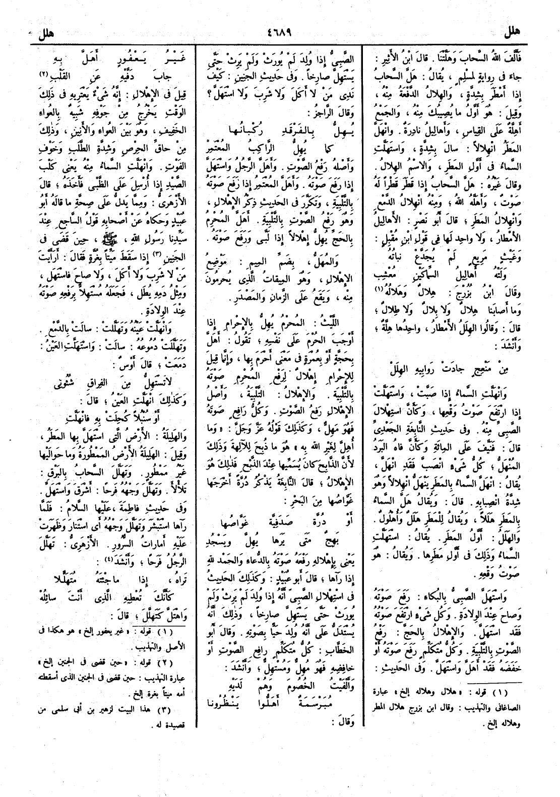 قيل في الإِهْلال إِنه شيء يعتريه في ذلك الوقت يخرج من جوفه شبيه بالعُواء الخفيف وهو بين العُواء والأَنين وذلك من حاقِّ الحِرْص وشدّة الطلب وخوف الفَوْت وانهلَّت السماء منه يعني كلب الصيد إِذا أُرسل على الظَّبْي فأَخذه قال الأَزهري ومما يدل على صحة ما قاله أَبو عبيد وحكاه عن أَصحابه قول الساجع عند سيدنا رسول الله صلى الله عليه وسلم حين قَضى في الجَنين ( قوله « حين قضى في الجنين إلخ » عبارة التهذيب حين قضى في الجنين الذي أسقطته أمه ميتاً بغرة إلخ ) إِذا سقَط ميتاً بغُرَّة فقال أَرأَيت مَن لا شرب ولا أَكَلْ ولا صاح فاسْتَهَلّْ ومثل دَمِه يُطَلُّ فجعله مُسْتَهِلاًّ برفعِه صوته عند الوِلادة وانهلَّت عينُه وتَهَلَّلتْ سالت بالدمع وتَهَلَّلتْ دموعُه سالت واستهلَّت العين دمَعت قال أَوس لا تَسْتَهِلُّ من الفِراق شُؤوني وكذلك انْهَلَّتِ العَيْن قال أَو سُنْبُلاً كُحِلَتْ به فانْهَلَّتِ والهَليلةُ الأَرض التي استهلَّ بها المطر وقيل الهَلِيلةُ الأَرض المَمْطورة وما حَوالَيْها غيرُ مَمطور وتَهَلَّل السحابُ بالبَرْق تَلأْلأَ وتهلَّل وجهه فَرَحاً أَشْرَق واستهلَّ وفي حديث فاطمة عليها السلام فلما رآها استبشَر وتهلَّل وجهُه أَي استنار وظهرت عليه أَمارات السرور الأَزهري تَهَلَّل الرجل فرحاً وأَنشد