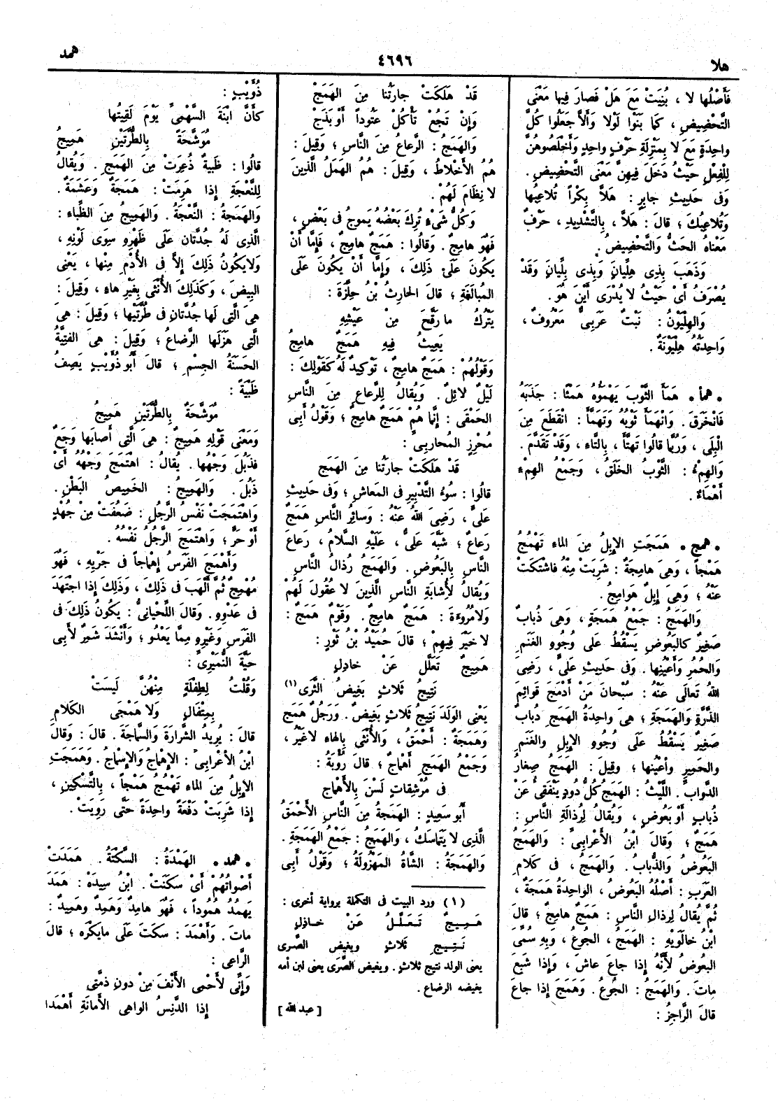 فأَصلها لا بنيت مع هَلْ فصار فيها معنى التحضيض كما بنوا لولا وأَلاَّ جعلوا كل واحدة مع لا بمنزلة حرف واحد وأَخلصوهن للفعل حيث دخل فيهن معنى التحضيض وفي حديث جابر هلاَّ بكراً تُلاعِبُها وتُلاعِبُكَ قال هلاَّ بالتشديد حرف معناه الحَثُّ والتَّحْضيض وذهب بذي هِلِّيانٍَ وبذِي بِلِّيانٍَ وقد يصرف أَي حيث لا يُدْرَى أَين هو والهِلْيَوْنُ نبت عربي معروف واحدته هِلْيَوْنةٌ ( همأ ) هَمَأَ الثَّوْبَ يَهْمَؤُه هَمْأً جَذَبَه فَانْخَرَقَ وانْهَمَأَ ثَوْبُهُ وتَهَمَّأَ انْقَطَعَ من البِلَى وربما قالوا تَهتَّأَ بالتاءِ وقد تقدم والهِمْءُ الثَّوْبُ الخَلَقُ وجمع الهِمْءِ أَهْمَاءٌ( همج ) هَمَجَتِ الإِبلُ من الماء تَهْمُجُ هَمْجاً وهي هامِجةٌ شربت منه فاشتكت عنه وهي إِبِلٌ هَوامِجٌ والهَمَجُ جمع هَمَجَةٍ وهي ذباب صغير كالبعوض يسقط على وجوه الغنم والحُمُرِ وأَعينها وفي حديث عليّ رضي الله تعالى عنه سبحان من أَدْمَجَ قوائم الذَّرَّة والهَمَجَةِ وهي واحدة الهمج ذبابٌ صغير يسقط على وجوه الإِبل والغنم والحمير وأَعينها وقيل الهَمَجُ صغار الدواب الليث الهَمَجُ كلُّ دُودٍ يَنْفَقِئُ عن ذباب أَو بَعُوض ويقال لرُذالَة الناس هَمَجٌ وقال ابن الأَعرابي والهَمَجُ البَعُوضُ والذباب والهَمَجُ في كلام العرب أَصله البعوض الواحدة هَمَجة ثم يقال لرذال الناس هَمَجٌ هامِجٌ قال ابن خالويه الهَمَجُ الجوع وبه سمِّي البعوض لأَنه إِذا جاع عاش وإِذا شبع مات والهَمَجُ الجوعُ وهَمَجَ إِذا جاع قال الراجز قد هَلَكَتْ جارَتُنا من الهَمَجْ وإِن تَجُعْ تأْكلْ عَتُوداً أَو بَذَجْ والهَمَجُ الرَّعاعُ من الناس وقيل هم الأَخلاط وقيل هم الهَمَلُ الذين لا نِظَامَ لهم وكل شيء ترك بعضه يَموجُ في بعض فهو هامجٌ وقالوا هَمَجٌ هامِجٌ فإِما أَن يكون على ذلك وإِما أَن يكون على المبالغة قال الحارثُ بن حِلِّزَةَ يَتْرُكُ ما رَقَّحَ من عَيْشِه يَعِيثُ فيه هَمَجٌ هامِجُ وقولهم هَمَجٌ هامِجٌ توكيد له كقولك لَيْلٌ لائِلٌ ويقال للرَّعاع من الناس الحَمْقَى إِنما هم هَمَجٌ هامِج وقول أَبي مُحْرِز المُحارِبي قد هلكت جارتنا من الهَمَج قالوا سُوءُ التدبير في المعاش وفي حديث عليّ رضي الله عنه وسائرُ الناسِ هَمَجٌ رَعاعٌ شَبَّه عليٌّ عليه السلام رَعاعَ الناس بالبعوض والهَمَجُ رُذالُ الناس ويقال لأُشابَة الناس الذين لا عقول لهم ولا مُرُوءَةَ هَمَجٌ هامج وقومٌ هَمَجٌ لا خير فيه قال حميد بن ثور هَمِيجٌ تَعَلَّلَ عن خادِلٍ نَتِيجُ ثلاثٍ بَغِيضُ الثَّرَى يعني الولد نتيج ثلاث بغيض ورجل هَمَجٌ وهَمَجة أَحمق والأُنثى بالهاء لا غير وجمعُ الهَمَج أَهْماجٌ قال رؤبة في مُرْشِقاتٍ لَسْنَ بالأَهْماج أَبو سعيد الهَمَجةُ من الناس الأَحمق الذي لا يتماسك والهَمَجُ جمع الهَمَجة والهَمَجة الشاة المهزولة وقول أَبي ذؤيب كأَنَّ ابْنةَ السَّهْمِيِّ يَومَ لقِيتُها مُوَشَّحَةً بالطُّرَّتَيْنِ هَمِيجُ قالوا ظبيةٌ ذُعِرَتْ من الهَمَج ويقال للنعجة إِذا هَرِمَتْ هَمَجَةٌ وعَشَمةٌ والهَمَجةُ النعجة والهَمِيجُ من الظباء الذي له جُدَّتانِ على ظهره سِوَى لونه ولا يكون ذلك إِلاَّ في الأُدْمِ منها يعني البِيضَ وكذلك الأُنثى بغير هاءِ وقيل هي التي لها جُدَّتانِ في طُرَّتَيْها وقيل هي التي هَزَلَها الرَّضاعُ وقيل هي الفَتِيَّةُ الحَسَنةُ الجسم قال أَبو ذؤيب يصف ظبية موشَّحة بالطُّرَّتَينِ هميج ومعنى قوله هميج هي التي أَصابها وجع فذَبُلَ وجهُها يقال اهْتَمَجَ وَجْهُه أَي ذَبُلَ والهَمِيجُ الخَمِيصُ البطن واهْتَمَجَتْ نفْسُ الرجل ضعفت من جُهْدٍ أَو حَرٍّ واهْتَمَجَ الرجلُ نفْسُه وأَهْمَجَ الفرسُ إِهْماجاً في جَرْيه فهو مُهْمِج ثم أَلْهَبَ في ذلك وذلك إِذا اجتهد في عَدْوِه وقال اللحياني يكون ذلك في الفرس وغيره مما يَعْدُو وأَنشد شمر لأَبي حَيَّةَ النُّمَيري وقلتُ لطِفْلة مِنهنَّ لَيسَتْ بِمِتْفال ولا هَمْجَى الكَلامِ قال