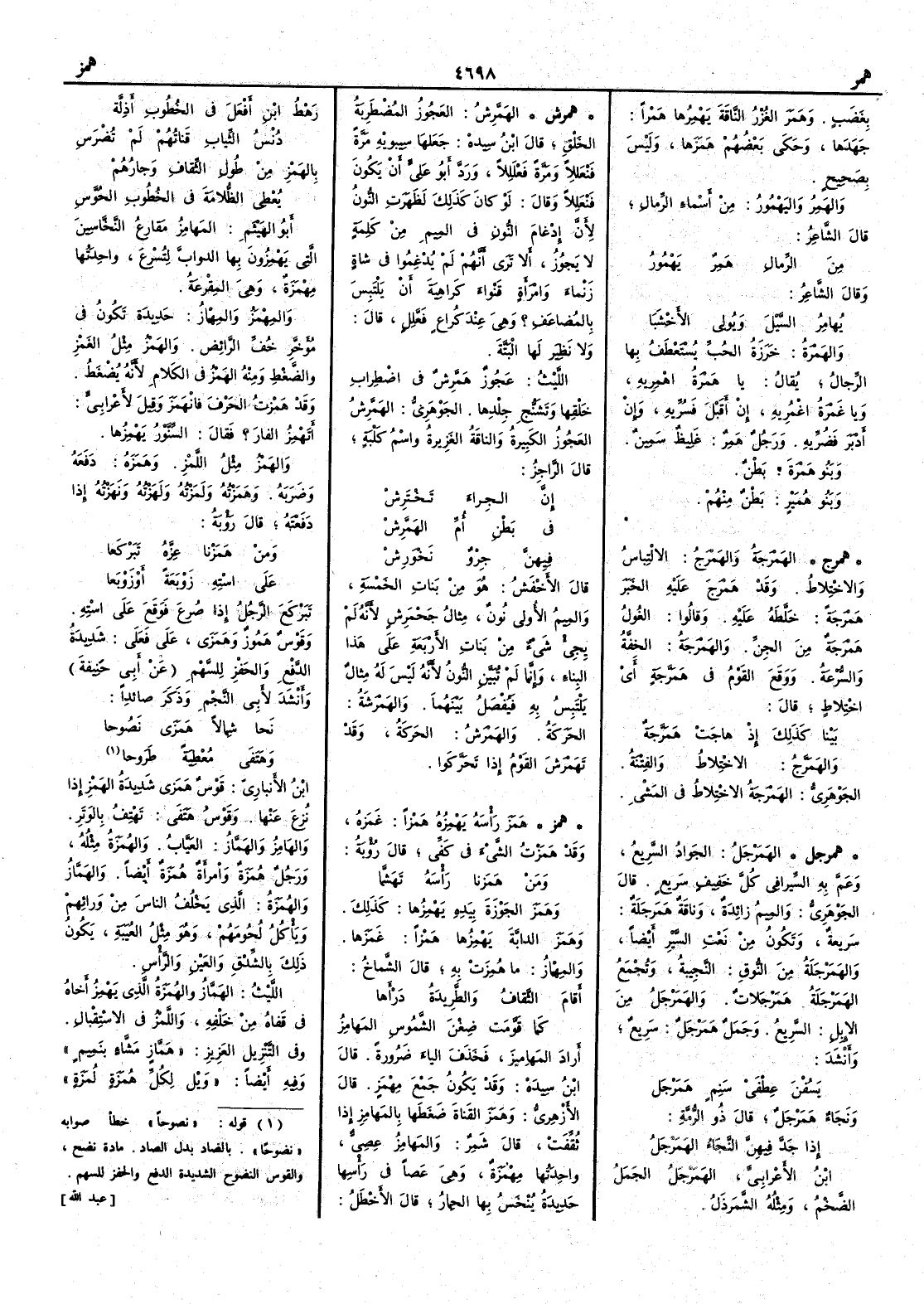 بغضب وهَمَرَ الغُزْرُ الناقةَ يَهْمِرُها هَمْراً جَهَدَها وحكى بعضهم هَمَزَها وليس بصحيح والهَمِرُ واليَهْمُورُ من أَسماء الرمال قال الشاعر من الرِّمالِ هَمِرٌ يَهْمُورُ وقال الشاعر يُهامِرُ السَّيْلَ ويُولي الأَخْشَبَا والهَمْرَةُ خَرَزَة الحُبِّ يُستعطف بها الرجالُ يقال يا هَمْرَةُ اهْمِرِيه ويا غَمْرَةُ اغْمُرِيِه إِن أَقبل فَسُرِّيه وإِن أَدبر فَضُرِّيه ورجل هَمِر غليظ سمين وبنو هَمْرة بطن وبنو هُمَيْر بطن منهم ( همرج ) الهَمْرَجَةُ والهَمْرَجُ الالتباس والاختلاط وقد هَمْرَجَ عليه الخبرَ هَمْرَجَةً خَلَّطَه عليه وقالوا الغُولُ هَمْرَجةٌ من الجنّ والهَمْرَجَة الخفة والسُّرْعة ووقع القومُ في هَمَرَّجة أَي اختلاط قال بينا كذلك إِذ هاجتْ هَمَرَّجَةٌ والهَمَرَّجُ الاختلاط والفتنة الجوهري الهَمْرَجةُ الاختلاط في المشي ( همرجل ) الهَمَرْجَلُ الجَواد السريع وعَمَّ به السيرافي كل خفيف سريع قال الجوهري والميم زائدة وناقة هَمَرْجلة سريعة وتكون من نعت السير أَيضاً والهَمَرْجَلة من النوق النَّجيبة وتجمع الهَمَرْجَلةُ هَمَرْجَلات والهَمَرْجَل من الإِبل السريع وجمل هَمَرْجَل سريع وأَنشد يَسُفْن عِطْفَيْ سَنِمٍ هَمَرْجَل ونَجَاء هَمَرْجَل قال ذو الرمة إِذا جَدَّ فيهنَّ النَّجَاءُ الهَمَرْجَلُ ابن الأَعرابي الهَمَرْجَل الجمل الضخم ومثله الشَّمرْذل ( همرش ) الهَمَّرِشُ العجوزُ المُضْطرِبةُ الخَلْق قال ابن سيده جعلها سيبويه مرة فَنُعَلِلاَ ومرة فَعْلَلِلاً وردَّ أَبو علي أَن يكون فَنْعَلِلاً وقال لو كان كذلك لظهرت النون لأَن إِدغام النون في الميم من كلمة لا يجوز أَلا ترى أَنهم لم يُدْغموا في شاة زَنْماء وامرأَة قَنْواء كراهية أَن يَلْتبس بالمُضاعَف ؟ وهي عند كراع فَعَّلِل قال ولا نظير لها البتة الليث عجوز هَمَّرِش في اضطراب خَلْقها وتشَنُّجِ جِلدِها الجوهري الهَمَّرِشُ العجوزُ الكبيرة والناقةُ الغزيرة واسم كلْبةٍ قال الراجز إِن الجِراءَ تَخْترش في بطْنِ أُمّ الهَمَّرِشْ فيهن جِرْوٌ نَخْوَرِشْ قال الأَخفش هو من بنات الخمسة والميمُ الأُولى نونٌ مثال جَحْمَرِش لأَنه لم يجئ شيء من بنات الأَربعة على هذا البناء وإِنما لم تُبَيَّن النونُ لأَنه ليس له مثال يلتبس به فيُفْصل بينهما والهَمْرَشةُ الحركةُ والهَمْرَشُ الحركةُ وقد تَهَمْرَشَ القومُ إِذا تحرّكوا