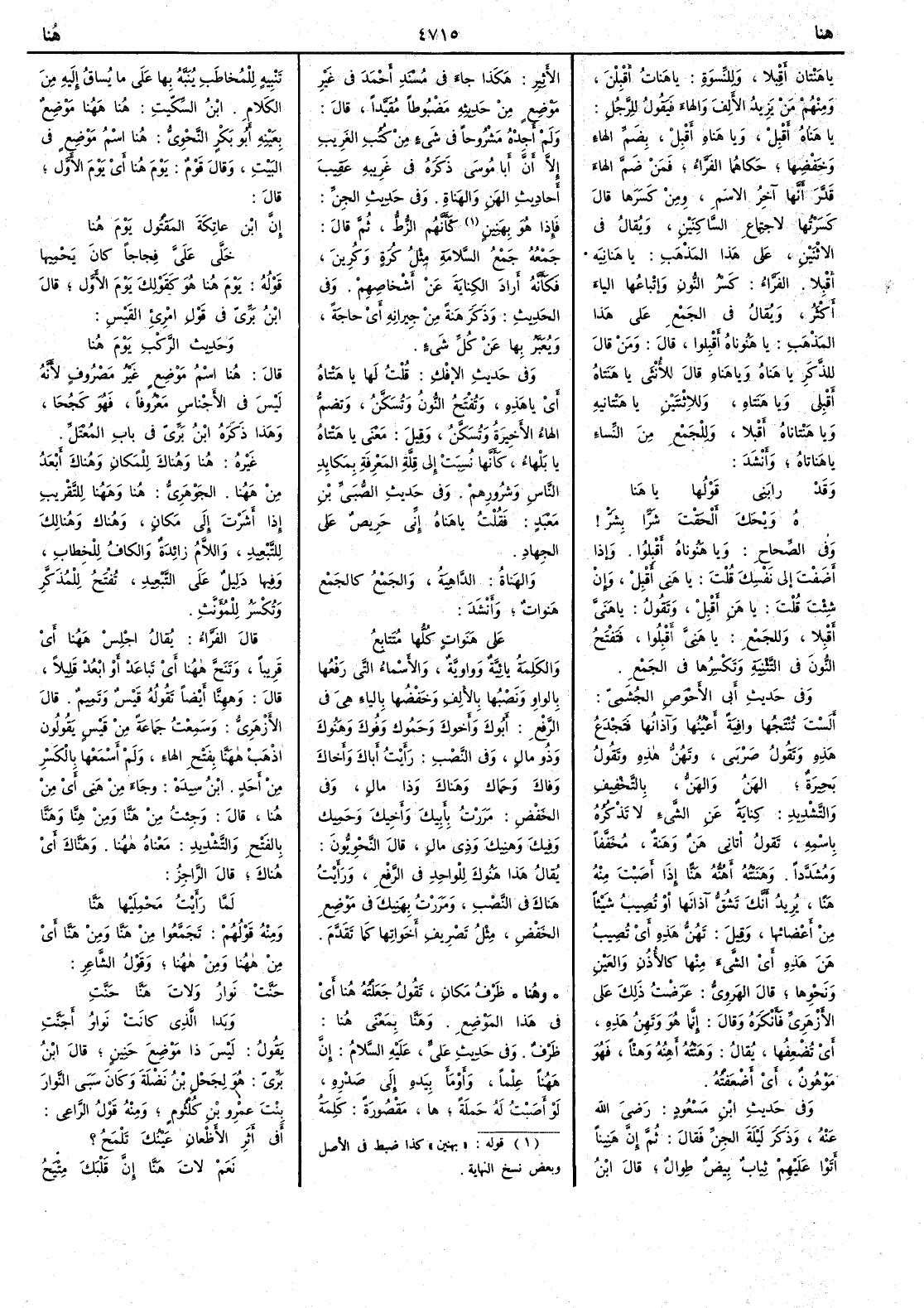 ( * قوله « بهنين » كذا ضبط في الأصل وبعض نسخ النهاية ) كأَنهم الزُّطُّ ثم قال جَمْعُه جَمْعُ السلامة مثل كُرة وكُرِينَ فكأَنه أَراد الكناية عن أَشخاصهم وفي الحديث وذكر هَنةً من جيرانه أَي حاجةً ويعبَّر بها عن كل شيء وفي حديث الإِفْك قلتُ لها يا هَنْتاه أَي يا هذه وتُفتح النونُ وتسكن وتضم الهاء الأَخيرة وتسكن وقيل معنى يا هَنْتاه يا بَلْهاء كأَنها نُسِبت إِلى قلة المعرفة بمكايد الناس وشُرُورهم وفي حديث الصُّبَيِّ بن مَعْبَد فقلت يا هَناهُ إِني حَرِيصٌ على الجِهاد والهَناةُ الداهِيةُ والجمع كالجمع هَنوات وأَنشد على هَنَواتٍ كلُّها مُتَتابِعُ والكلمة يائية وواوية والأَسماء التي رفعها بالواو ونصبها بالأَلف وخفضها بالياء هي في الرفع أَبُوكَ وأَخُوكَ وحَمُوكِ وفُوكَ وهَنُوكَ وذو مال وفي النصب رأَيتُ أَباكَ وأَخاكَ وفاكَ وحماكِ وهَناكَ وذا مال وفي الخفض مررتُ بأَبيكَ وأَخيكَ وحميكِ وفيكَ وهَنِيكَ وذي مالٍ قال النحويون يقال هذا هَنُوكَ للواحد في الرفع ورأَيت هناك في النصب وممرت بهَنِيك في موضع الخفض مثل تَصْريف أَخواتها كما تقدم