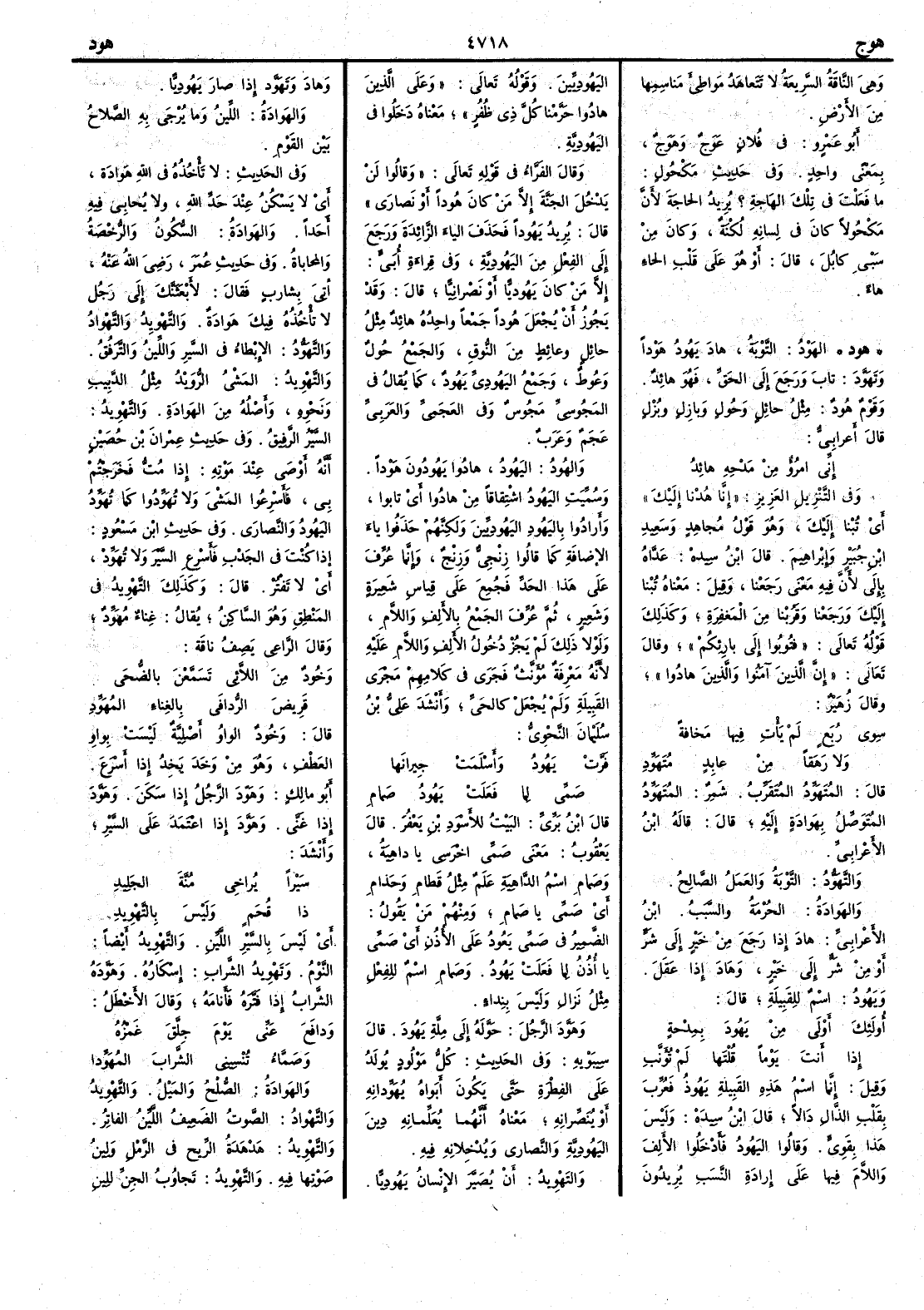 ( هود ) الهَوْدُ التَّوْبَةُ هادَ يَهُودُ هوْداً وتَهَوَّد تابَ ورجع إِلى الحق فهو هائدٌ وقومٌ هُودٌ مِثْلُ حائِكٍ وحُوكٍ وبازِلٍ وبُزْلٍ قال أَعرابي إِنِّي امرُؤٌ مِنْ مَدْحِهِ هائِد وفي التنزيل العزيز إِنَّا هُدْنا إِليك أَي تُبْنا إِليك وهو قول مجاهد وسعيد بن جبير وإِبراهيم قال ابن سيده عدّاه بإِلى لأَن فيه معنى رجعنا وقيل معناه تبنا إِليك ورجعنا وقَرُبْنا من المغفرة وكذلك قوله تعالى فتُوبوا إِلى بارِئِكم وقال تعالى إِن الذين آمنوا والذين هادوا وقال زهير سِوَى رُبَعٍ لم يَأْتِ فيها مَخافةً ولا رَهَقاً مِنْ عابِدٍ مُتَهَوِّد قال المُتَهَوِّد المُتَقَرِّبُ شمر المُتَهَوِّدُ المُتَوَصِّلُ بِهَوادةٍ إِليه قال قاله ابن الأَعرابي والتَّهَوُّدُ التوبةُ والعمل الصالح والهَوادَةُ الحُرْمَةُ والسبب ابن الأَعرابي هادَ إِذا رجَع من خير إِلى شرّ أَو من شرّ إِلى خير وهادَ إِذا عقل ويَهُودُ اسم للقبيلة قال أُولئِكَ أَوْلى مِنْ يَهُودَ بِمِدْحةٍ إِذا أَنتَ يَوْماً قُلْتَها لم تُؤنَّب وقيل إِنما اسم هذه القبيلة يَهُوذ فعرب بقلب الذال دالاً قال ابن سيده وليس هذا بقويّ وقالوا اليهود فأَدخلوا الأَلف واللام فيها على إِرادة النسب يريدون اليهوديين وقوله تعالى وعلى الذين هادُوا حَرَّمْنا كلَّ ذي ظُفُر معناه دخلوا في اليهودية وقال الفراء في قوله تعالى وقالوا لَنْ يَدْخُلَ الجنةَ إِلا من كان هُوداً أَو نصارى قال يريد يَهُوداً فحذف الياء الزائدة ورجع إِلى الفعل من اليهودية وفي قراءة أُبيّ إِلا من كان يهوديّاً أَو نصرانيّاً قال وقد يجوز أَن يجعل هُوداً جمعاً واحده هائِدٌ مثل حائل وعائط من النُّوق والجمع حُول وعُوط وجمع اليهوديّ يَهُود كما يقال في المجوسيّ مَجُوس وفي العجمي والعربيّ عجم وعرب والهُودُ اليَهُود هادُوا يَهُودُون هَوْداً وسميت اليهود اشتقاقاً من هادُوا أَي تابوا وأَرادوا باليَهُودِ اليَهُودِيِّينَ ولكنهم حذفوا ياء الإِضافة كما قالوا زِنْجِيٌّ وزنْج وإِنما عُرِّف على هذا الحد فجُمِع على قياس شعيرة وشعير ثم عُرّف الجمع بالأَلِف واللام ولولا ذلك لم يجز دخول الأَلِف واللام عليه لأَنه معرفة مؤنث فجرى في كلامهم مجرى القبيلة ولم يجعل كالحيّ وأَنشد علي بن سليمان النحوي فَرَّتْ يَهُودُ وأَسْلَمَتْ جِيرانَها صَمِّي لِما فَعَلَتْ يَهُودُ صَمامِ قال ابن برِّيّ البيت للأَسود بن يعفر قال يعقوب معنى صَمِّي اخْرسي يا داهيةُ وصَمامِ اسم الداهيةِ علم مثل قَطامِ وحَذامِ أَي صَمِّي يا صَمامِ ومنهم من يقول الضمير في صمي يعود على الأُذن أَي صَمِّي يا أُذُن لما فعلتْ يَهُود وصَمامِ اسم للفعل مثل نَزالِ وليس بنداء وهَوَّدَ الرجلَ حَوّلَه إِلى ملة يَهُودَ قال سيبويه وفي الحديث كلُّ مَوْلُود يُولَدُ على الفِطْرَةِ حتى يكون أَبواه يُهَوِّدانِه أَو يُنَصِّرانِه معناه أَنهما يعلمانه دين اليهودية والنصارى ويُدْخِلانه فيه والتَّهْوِيدُ أَن يُصَيَّرَ الإِنسانُ يَهُوديًّا وهادَ وتَهَوَّد إِذا صار يهوديّاً والهَوادةُ اللِّينُ وما يُرْجَى به الصلاحُ بين القوم وفي الحديث لا تأْخُذُه في الله هَوادةٌ أَي لا يَسْكُنُ عند حد الله ولا يُحابي فيه أَحداً والهَوادةُ السُّكونُ والرُّخْصة والمحاباة وفي حديث عمر رضي الله عنه أُتِيَ بِشاربٍ فقال لأَبْعَثَنَّكَ إِلى رجل لا تأْخُذُه فيك هَوادةٌ والتَّهْوِيدُ والتَّهْوادُ والتَّهَوُّدُ الإِبْطاءُ في السَّيْر واللِّينُ والتَّرَفُّقُ والتَّهْوِيدُ المشيُ الرُّوَيْدُ مثل الدَّبيب ونحوه وأَصله من الهَوادةِ والتَّهْوِيدُ السَّيْرُ الرَّفِيقُ وفي حديث عِمْران بن حُصين أَنه أَوْصَى عند موتِه إِذا مُتُّ فَخَرَجْتُمْ بي فأَسْرِعُوا المَشْيَ ولا تُهَوِّدُوا كما تُهَوِّدُ اليهودُ والنصارى وفي حديث ابن مسعود إِذا كنتَ في الجَدْبِ فأَسْرِعِ السَّيْرَ ولا تُهَوِّد أَي لا تَفْتُرْ قال وكذلك التَّهْوِيدُ في المَنْطِقِ وهو ال