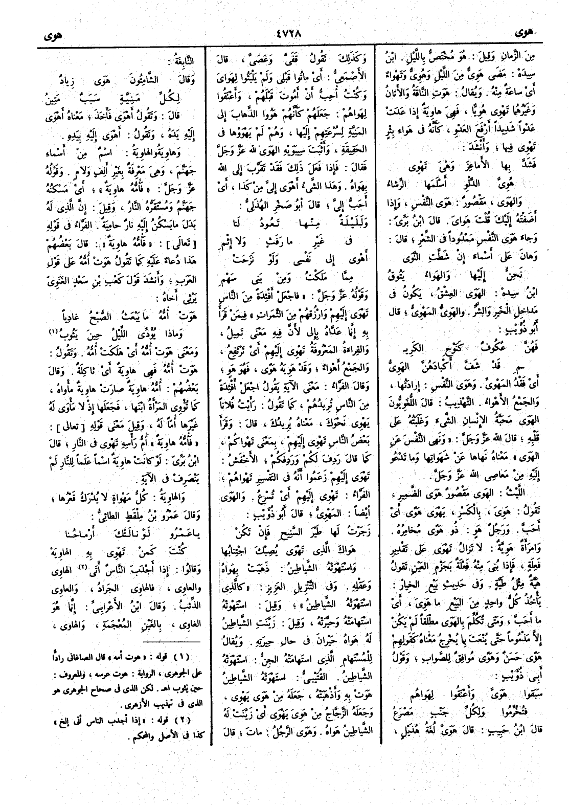 من الزمان وقيل هو مختص بالليل ابن سيده مضى هَوِيٌّ من الليل وهُوِيٌّ وتَهْواء أَي ساعة منه ويقال هَوَتِ الناقةُ والأَتانُ وغيرهما تَهْوي هُوِيّاً فهي هاوِيةٌ إِذا عَدَتْ عَدْواً شديداً أَرْفَعَ العَدْو كأَنه في هَواء بئر تَهْوي فيها وأَنشد فشَدَّ بها الأَماعِزَ وهْيَ تَهْوي هُويَّ الدَّلْوِ أَسْلمها الرِّشاءُ والهَوى مقصور هَوَى النَّفْس وإِذا أَضفته إِليك قلت هَوايَ قال ابن بري وجاء هَوَى النفْس ممدوداً في الشعر قال وهانَ على أَسْماءَ إِنْ شَطَّتِ النَّوى نَحِنُّ إِليها والهَواء يَتُوقُ ابن سيده الهَوى العِشْق يكون في مداخل الخير والشر والهَوِيُّ المَهْوِيُّ قال أَبو ذؤيب فَهُنَّ عُكُوفٌ كنَوْحِ الكَرِي مِ قدْ شَفَّ أَكْبادَهُنَّ الهَويُّ أَي فَقْدُ المَهْويِّ وهَوى النفسِ إِرادتها والجمع الأَهْواء التهذيب قال اللغويون الهَوَى محبةُ الإِنسان الشيء وغَلَبَتُه على قلبه قال الله عز وجل ونَهى النفْسَ عن الهَوى معناه نَهاها عن شَهَواتِها وما تدعو إِليه من معاصي الله عز وجل الليث الهَو مقصور هَوى الضَّمير تقول هَوِيَ بالكسر يَهْوى هَوًى أَي أَحبَّ ورجل هَوٍ ذو هَوًى مُخامِرُه وامرأَة هَوِيةٌ لا تزال تَهْوى على تقدير فَعِلة فإِذا بُنيَ منه فَعْلة بجزم العين تقول هَيَّة مثل طَيَّة وفي حديث بَيْعِ الخِيار يأْخُذُ كلُ واحد من البيع ما هَوِيَ أَي ما أَحب ومتى تُكُلِّمَ بالهَوى مطلقاً لم يكن إِلا مذموماً حتى يُنْعَتَ بما يُخرجُ معناه كقولهم هَوًى حَسَنٌ وهَوًى موافق للصواب وقول أَبي ذؤيب سَبَقوا هَوَيَّ وأَعْنَقُوا لِهَواهُم فتُخُرِّمُوا ولكُلِّ جَنْبٍ مَصْرَعُ قال ابن حبيب قال هَوَيَّ لغة هذيل وكذلك تقول قَفَيَّ وعَصَيَّ قال الأَصمعي أَي ماتوا قبلي ولم يَلْبثُوا لِهَواي وكنت أُحِبُّ أَن أَموت قبلهم وأَعْنَقُوا لِهَواهم جعلهم كأَنهم هَوُوا الذَّهابَ إِلى المَنِيَّةِ لسُرْعتهم إِليها وهم لم يَهْوَوْها في الحقيقة وأَثبت سيبويه الهَوَى لله عز وجل فقال فإِذا فعَلَ ذلك فقد تَقَرَّب إِلى الله بهَواه وهذا الشيءُ أَهْوى إليَّ من كذا أَي أَحَبُّ إِليَّ قال أَبو صخر الهذلي ولَلَيْلةٌ مِنها تَعُودُ لَنا في غَيْرِ ما رَفْثٍ ولا إِثْمِ أَهْوى إِلى نَفْسِي ولَوْ نَزَحَتْ مِمَّا مَلَكْتُ ومِنْ بَني سَهْمِ وقوله عز وجل فاجْعَلْ أَفْئِدةً من الناس تَهْوَى إِليهم وارْزُقْهم من التَّمرات فيمن قرأَ به إِنما عدَّاه بإِلى لأَن فيه معنى تميل والقراءَة المعروفة تَهْوي إِليهم أَي تَرْتَفِع والجمع أَهْواء وقد هَوِيَه هَوًى فهو هَوٍ وقال الفراء معنى الآية يقول اجعل أَفئدة من الناس تُريدُهم كما تقول رأَيت فلاناً يَهْوي نَحْوَك معناه يُريدك قال وقرأَ بعض الناس تَهْوى إِليهم بمعنى تَهْواهم كما قال رَدِفَ لكم ورَدِفَكم الأَخفش تَهْوى إِليهم زعموا أَنه في التفسير تَهْواهم الفراء تَهْوي إِليهم أَي تُسْرعُ والهَوى أَيضاً المَهْويُّ قال أَبو ذُؤيب زَجَرْتُ لها طَيْرَ السَّنِيحِ فإِنْ تَكُنْ هَواكَ الذي تَهْوى يُصِبْكَ اجْتِنابُها واسْتَهْوَتْه الشياطينُ ذهبت بهَواه وعَقْله وفي التنزيل العزيز كالذي اسْتَهْوَتْه الشياطينُ وقيل اسْتَهْوَتْه استَهامَتْه وحَيَّرَتْه وقيل زيَّنت الشياطينُ له هَواه حَيْرانَ في حال حيرته ويقال للمُسْتَهام الذي استَهامَتْه الجنُّ اسْتَهْوَته الشياطين القتيبي استَهْوته الشَّياطينُ هَوَتْ به وأَذْهَبتْه جعله من هَوَى يَهْوي وجعله الزجاج من هَوِيَ يَهْوَى أَي زيَّنت له الشياطينُ هَواه وهَوى الرَّجل ماتَ قال النابغة وقال الشَّامِتُونَ هَوى زِيادٌ لِكُلِّ مَنِيَّةٍ سَببٌ مَتِينُ قال وتقول أَهْوى فأَخذ معناه أَهْوى إِليه يَدَه وتقول أَهْوى إِليه بيَدِه وهاوِيةُ والهاوِيةُ اسم من أَسماء جهنم وهي معرفة بغير أَلف ولام وقوله عز وجل فأُمُّه هاوِيةٌ أَي مَسْكنه جهنمُ ومُسْتَقَرُّه النار وقيل إِنَّ الذي له بدل ما يسكن إِليه نا