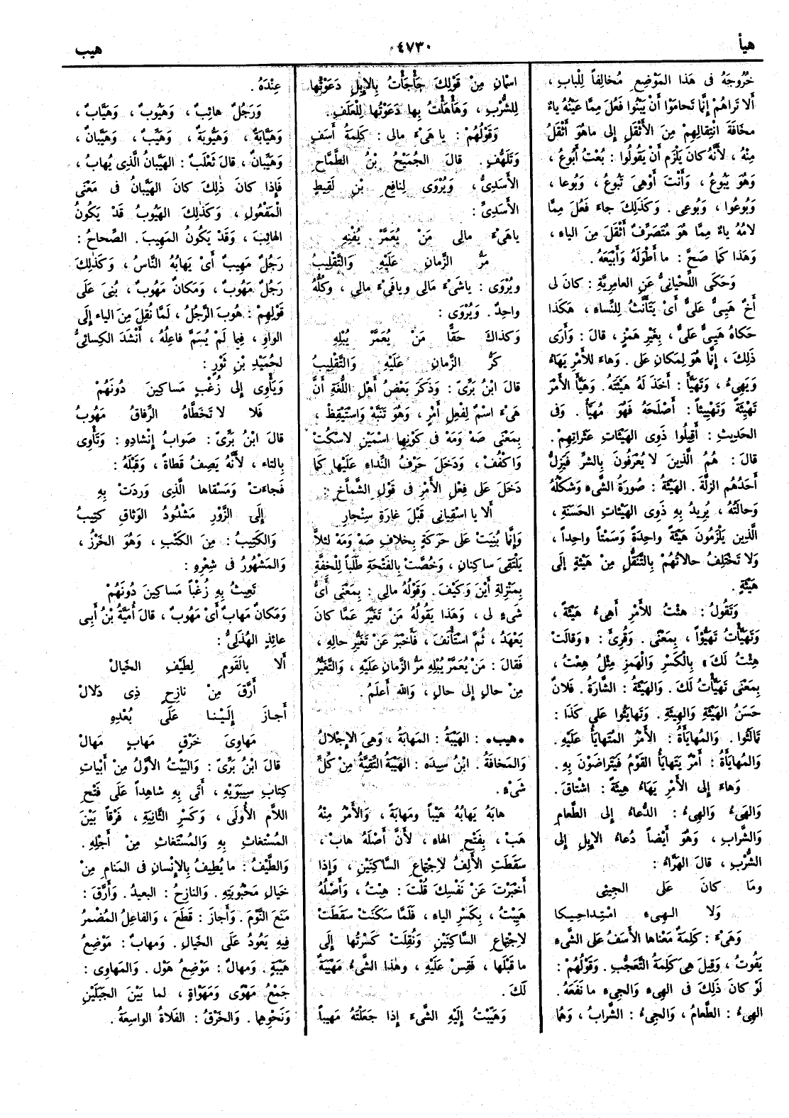 خُروجَه في هذا الموضع مخالفاً للباب أَلا تراهم إِنما تَحامَوْا أَن يَبْنُوا فَعُلَ مما عينه ياءٌ مخافة انْتِقالهم من الأَثقل إِلى ما هو أَثقلُ منه لأَنه كان يلزم أَن يقولوا بُعْت أَبُوعُ وهو يَبُوعُ وأَنت أَو هي تَبُوعُ وبُوعا وبُوعُوا وبُوعِي وكذلك جاءَ فَعُلَ مما لامه ياءٌ ممَّا هو مُتَصَرِّفٌ أَثقلَ من الياءِ وهذا كما صح ما أَطْوَلَه وأَبْيَعَه وحكى اللحياني عن العامِرِيَّةِ كان لِي أَخٌ هَيِيٌّ عَليٌّ أَي يتأَنث للنساءِ هكذا حكاه هَيِيٌّ عَليٌّ بغير همز قال وأُرَى ذلك إِنما هو لمكان عَليٍّ وهاءَ للأَمر يَهَاءُ ويَهِيءُ وتَهَيَّأَ أَخَذَ له هَيْأَتَه وهَيَّأَ الأَمرَ تَهْيِئةً وتَهْييئاً أَصْلَحه فهو مُهَيَّأٌ وفي الحديث أَقِيلُوا ذَوِي الهَيْئَاتِ عَثَراتِهم قال هم الذين لا يُعْرَفُون بالشرِّ فَيَزِلُّ أَحدُهم [ ص 189 ] الزلَّةَ الهَيْئَةُ صورةُ الشيءِ وشَكْلُه وحالَتُه يريد به ذَوِي الهَيْئَاتِ الحَسَنةِ الذين يَلْزَمون هَيْئةً واحدة وسَمْتاً واحداً ولا تَخْتَلِفُ حالاتُهم بالتنقل من هَيْئةٍ إِلى هَيْئةٍ وتقول هِئْتُ للأَمر أَهِيءُ هَيْئةً وتَهَيَّأْتُ تَهَيُّؤاً بمعنى وقُرئَ وقالت هِئْتُ لك بالكسر والهمز مثل هِعْتُ بمعنى تَهَيَّأْتُ لكَ والهَيْئَةُ الشارةُ فلان حَسَنُ الهَيْئةِ والهِيئةِ وتَهايَؤُوا على كذا تَمالَؤُوا والمُهايَأَةُ الأَمْرُ المُتَهايَأُ عليه والمُهايَأَةُ أَمرٌ يَتَهايَأُ القوم فيَتَراضَوْنَ به وهاءَ إِلى الأَمْر يَهَاءُ هِيئةً اشتاقَ والهَيْءُ والهِيءُ الدُّعاءُ إِلى الطَّعامِ والشراب وهو أَيضاً دُعاءُ الإِبِل إِلى الشُّرب قال الهَرَّاءُ