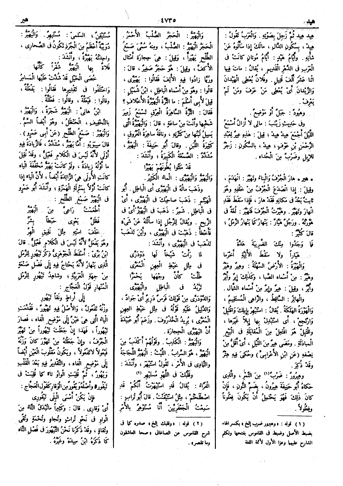الفراء يقال قد اسْتَيْهَرْتُ أَنكم قد اصطلحتم مثل استيقنت قال أَبو تراب سمعت الجعفريين أَنا مُسْتَوْهِرٌ بالأَمر مستيقن السلميّ مُسْتَيهِرٌ واليَهْيَرُّ دُوَيْبَّة أَعظم من الجُرَذِ تكون في الصحاري واحدته يَهْيَرَّة وأَنشد فَلاةٌ بها اليَهْيَرُّ شُقْراً كأَنها خُصَى الخَيْلِ قد شُدَّتْ عليها المَسامِرُ واختلفوا في تقديرها فقالوا يَفْعَلّةٌ وقالوا فَيْعَلَّةٌ وقالوا فَعْلَلَّةٌ ابن هانئ اليَهْيَرُّ شجرة واليَهْيَرُ بالتخفيف الحنظل وهو أَيضاً السَّمُّ واليَهْيَرُ صَمْغُ الطَّلْحِ عن أَبي عمرو قال سيبويه أَما يَهْيَرُّ مشدد فالزيادة فيه أَولى لأَنه ليس في الكلام فَعْيَلُّ وقد نقل ما أَوَّله زيادة ولو كانت يَهْيَرُّ مخففة الياء كانت الأُولى هي الزائدة أَيضاً لأَن الياء إِذا كانت أَوَّلاً بمنزلة الهمزة وأَنشد أَبو عمرو في اليَهْيَرِّ صَمْغِ الطَّلْحِ أَطْعَمْتُ رَاعِيَّ من اليَهْيَرِّ فَظَلَّ يَعْوِي حَبَطاً بِشَرِّ خَلْفَ اسْتِهِ مثلَ نَقِيق الهِرِّ وهو يَفْعَلُّ لأَنه ليس في الكلام فَعْيَلُّ قال ابن بري أَسقط الجوهري ذكر تَيْهُور للرمل الذي يَنْهار لأَنه يحتاج فيه إِلى فضل صنعة من جهة العربية وساهدُ تَيْهورٍ للرمل المُنْهارِ قول العجاج إِلى أَراطٍ ونَقاً تَيْهُورِ وزنه تَفْعُول والأَصل فيه تَهْيُور فقدِّمت الياء التي هي عين إِلى موضع الفاء فصار تَيْهُوراً فهذا إِن جعلت تَيهُوراً من تَيَهَّرَ الجُرُفُ وإِن جعلته من تَهَوَّر كان وزنه فَيْعُولاً لا تَفْعُولاً ويكون مقلوب العين أَيضاً إِلى موضع الفاء والتقدير فيه بعد القلب وَيْهُور ثم قلبت الواو تاء كما قلبت في تَيْقُور وأَصله وَيْقُور من الوَقار كقول العجاج فإِن يكن أَمْسى البِلَى تَيْقورِي أَي وَقاري قال وكثيراً ما تبدل التاء من الواو في نحو تُراثٍ وتُجاهٍ وتُخَمَة وتُقًى وتُقاةٍ وقد ذكرنا نحن التَّيْهُورَ في فصل التاء كما ذكره ابن سيده وغيره