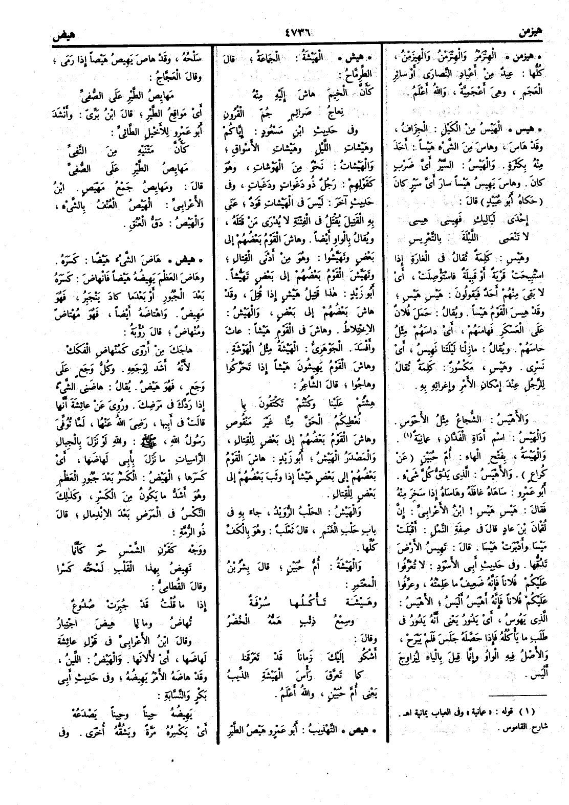 ( هيش ) الهَيْشةُ الجماعةُ قال الطرِمّاح كأَن الخِيمَ هاشَ إِليه منه نِعاجُ صَرائمٍ جُمّ القُرُونِ وفي حديث ابن مسعود إِياكم وهَيْشاتِ الليلِ وهَيْشاتِ الأَسواقِ والهَيْشاتُ نحوٌ من الهَوْشات وهو كقولهم رجل ذو دَغَواتٍ ودَغَياتٍ وفي حديث آخر ليس في الهَيْشاتِ قَوَدٌ عَنى به القَتِيلَ يُقْتَل في الفِتْنة لا يُدْرى مَنْ قتَله ويقال بالواو أَيضاً وهاشَ القومُ بعضهم إِلى بعض وتَهَيَّشُوا وهو من أَدْنى القِتالِ وتَهَيَّشَ القومُ بعضُهم إِلى بعض تَهَيُّشاً أَبو زيد هذا قتِيلُ هَيْشٍ إِذا قُتِل وقد هاشَ بعضُهم إِلى بعض والهَيْشُ الاختلاطُ وهاشَ في القوم هَيْشاً عاثَ وأَفْسَدَ الجوهري الهَيْشةُ مثل الهَوْشةٍ وهاشَ القومُ يَهِيشُون هَيْشاً إِذا تحرّكوا وهاجُوا قال الشاعر هِشْتُم علينا وكنتم تَكْتَفُون بما نُعْطِيكمُ الحَقَّ منا غيرَ مَنْقُوصِ وهاشَ القومُ بعضُهم إِلى بعض للقتال والمَصْدَرُ الهَيْشُ أَبو زيد هاشَ القومُ بعضُهم إِلى بعض هَيْشاً إِذا وَثَبَ بعضُهم إِلى بعض للقتال والهَيْشُ الحَلْبُ الرُّوَيْدُ جاء به في باب حَلْب الغَنَم قال ثعلب وهو بالكفّ كلّها والهَيْشَةُ أُمُّ حُبَيْنٍ قال بِشْر بن المعتمر وهَيْشَة تأْكلها سُرْفةٌ وسِمْعُ ذِئبٍ هَمُّه الحُضْرُ وقال أَشْكُو إِليك زَماناً قد تَعَرّقَنا كما تَعرَّقَ رأْسَ الهَيْشةِ الذِّيبُ يعني أُمَّ حُبَين واللَّه أَعلم