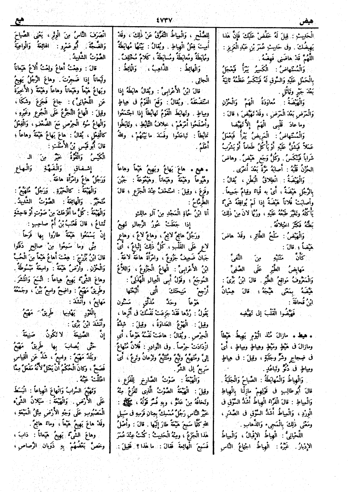 ( هيع ) هاعَ يَهاعُ ويَهيع هَيْعاً وهاعاً وهُيُوعاً وهَيْعةً وهَيَعاناً وهَيْعوعة جَبُنَ وفَزِع وقيل استخف عند الجَزَع قال الطرماح أَنا ابن حُماةِ المَجْدِ من آلِ مالكٍ إِذا جَعَلَتْ خُورُ الرجالِ تَهِيع ورجل هائِعٌ لائِعٌ وهاعٌ لاعٌ وهاعٍ لاعٍ على القَلْب كلُّ ذلك إِتباع أَي جبان ضعيف جَزُوع وامرأَة هاعَةٌ لاعة ابن الأَعرابي الهاعُ الجَزوعُ واللاعُ المُوجَع وقول أَبي العيال الهذلي أَرجِعْ مَنِيحَتَكَ التي أَتْبَعْتَها هَوْعاً وحَدَّ مُذَلَّقٍ مَسْنُون يقول رُدَّها فقد جَزِعَتْ نفسُك في أَثَرِها وقيل الهَوْع العَداوةُ وقيل شِدَّة الحِرْصِ ويقال هاعَتْ نفسُه هَوْعاً أَي ازْدَادَتْ حِرْصاً وفي النوادر فلان مُنْهاع إِليَّ ومُتَهيِّع وتَيِّع ومُتَتَيِّع وتَرْعانُ وتَرِعٌ أَي سَرِيعٌ إِلى الشرّ والهَيْعةُ صوتُ الصَّارِخ للفَزَع وقيل الهَيعة الصوت الذي تَفْزَعُ منه وتخافُه من عدوّ وبه فسر قوله صلى الله عليه وسلم خير الناس رجُلٌ مُمْسِكٌ بِعِنان فرَسِه في سبيل الله كلَّما سَمِعَ هَيْعة طارَ إِليها قال وأَصل هذا الجَزَعُ ومنه الحديث كنتُ عند عمر فسَمِع الهائعة فقال ما هذا ؟ فقيل انْصَرَف الناسُ من الوتر يعني الصياحَ والضجَّةَ أَبو عمرو الهائِعة والواعِية الصوت الشديد قال وهِعْت أَهاعُ ولِعْتُ أَلاعُ هَيَعاناً ولَيَعاناً إِذا ضَجِرْت وهاعَ الرجُل يَهِيعُ ويَهاعُ هَيْعاً وهَيَعاناً وهاعاً وهَيْعة الأَخيرة عن اللحياني جاعَ فَجَزِعَ وشَكَا وقيل الهاع التجَرُّع على الجُوعِ وغيره والهاعُ سوءُ الحِرْصِ مع الضعف والفعلُ كالفِعْل يقال هاعَ يَهاعُ هَيْعةً وهاعاً قال أَبو قيس بن الأَسلت الكَيْسُ والقُوَّةُ خَيْرٌ من ال إِشفاقِ والفَهَّةِ والهاعِ ورجل هاعٌ وامْرأَة هاعةٌ والهَيْعة كالحَيْرة ورجل مُتَهَيِّعٌ مُتَحَيِّرٌ والهائعةُ الصوتُ الشَّديد والهَيْعةُ كلُّ ما أَفْزَعك من صَوْت أَو فاحِشة تُشاعُ قال قَعْنَب بن أُم صاحب إِنْ يَسْمَعوا هَيْعةً طارُوا بها فَرَحاً مِني وما سَمِعُوا من صالِحٍ دَفَنُوا قال ابن بزرج هِعْت أَهاعُ هَيْعاً من الحُبِّ والحُزْنِ وأَرض هَيْعةٌ واسعةٌ مَبْسوطة وهاع الشيءُ يَهِيع هِياعاً اتَّسَعَ وانْتَشَر وطريق مَهْيَعٌ واضِحٌ واسِعٌ بَيِّنٌ وجَمْعُه مَهايِعُ وأَنشد بالغَوْر يهْدِيها طرِيقٌ مَهْيَعُ وأَنشد ابن بري إِنَ الصَّنيعةَ لا تكونُ صَنِيعةً حتى يُصابَ بها طرِيقٌ مَهْيَع وبلَد مَهْيَعٌ واسعٌ شذَّ عن القياس فصَحَّ وكان الحكم أَن يعْتل لأَنه مَفْعَل مما اعْتَلَّت عينُه وتَهَيَّعَ السرابُ وانْهاعَ انْهِياعاً انبَسَطَ على الأَرض والهَيْعةُ سيَلانُ الشيء المصْبوبِ على وجه الأَرض مثل المَيْعة وقد هاع يَهِيعُ هَيْعاً وماءٌ هائِعٌ وهاعَ الشيءُ يهيعُ هَيْعاناً ذابَ وخَصَّ بعضُهم به ذَوَبان الرَّصاصِ