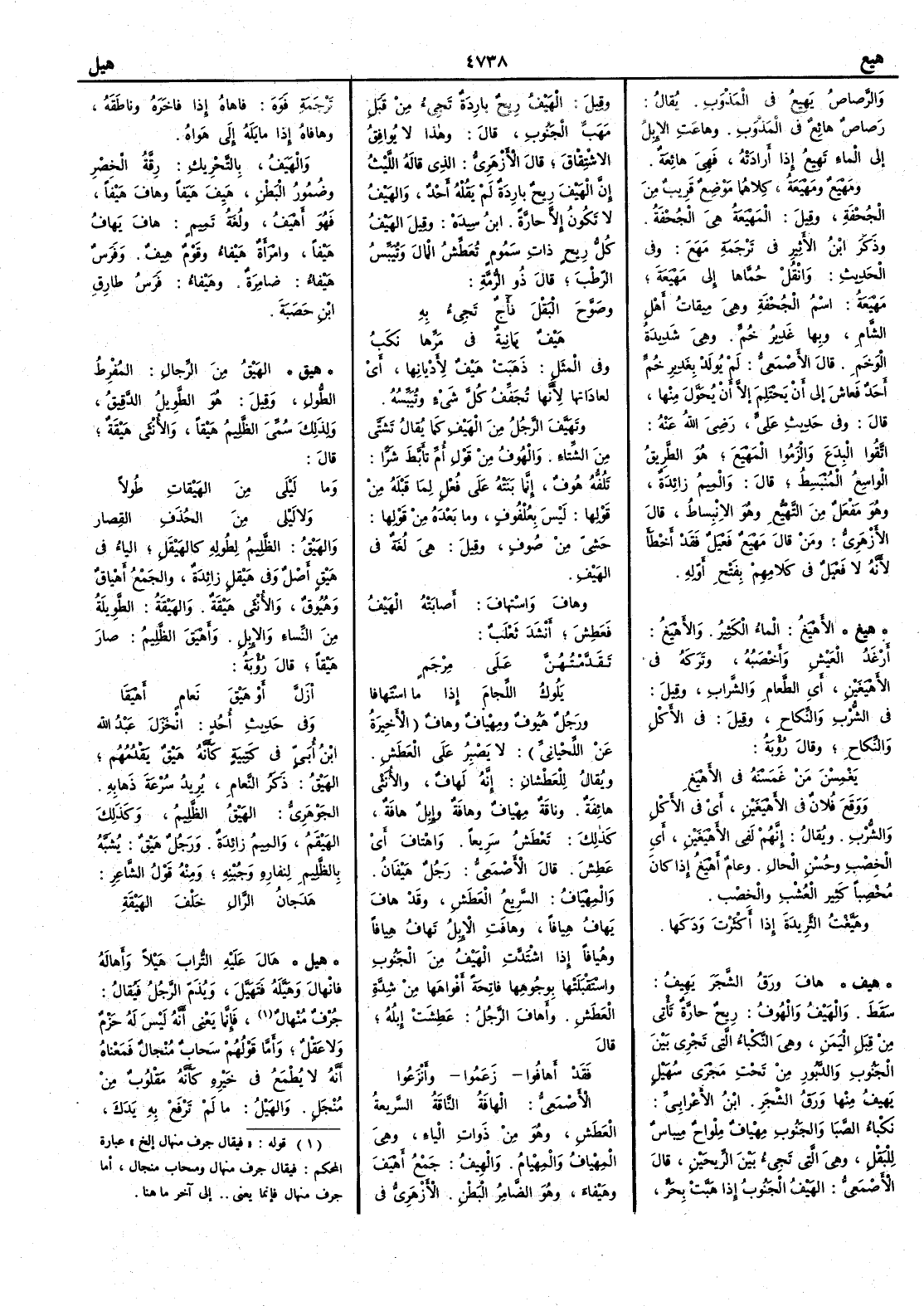 ( هيغ ) الأَهْيَغُ الماء الكثير والأَهْيَغُ أَرْغَدُ العَيْشِ وأَخْصَبُه وتَرَكَه في الأَهْيَغَينِ أَي الطعام والشراب وقيل في الشرْبِ والنكاح وقيل في الأَكل والنكاح وقال رؤبة يَغْمِسْنَ مَنْ غَمَسْنَه في الأَهْيَغِ ووقع فلان في الأَهْيَغَينِ أَي في الأَكل والشرب ويقال إنهم لفي الأَهْيَغينِ أَي الخِصْب وحُسْنِ الحال وعامٌ أهْيَغُ إذا كان مُخْصِباً كثير العشب والخِصب وهَيَّغْتُ الثَّريدةَ إذا أَكثرت وَدَكَها ( هيف ) هافَ ورَقُ الشجر يَهِيف سقط والهَيْفُ والهُوف ريح حارَّة تأْتي من قِبَل اليمن وهي النَّكْباء التي تجري بين الجَنُوب والدَّبُور من تحت مَجْرَى سُهَيْل يَهيف منها ورق الشجر ابن الأَعرابي نَكْباء الصَّبا والجَنوب مِهْيافٌ مِلْواحٌ مِيباسٌ للبقل وهي التي تجيء بين الرِّيحين وقال الأَصمعي الهَيْف الجنوب إِذا هَبَّت بحرّ وقيل الهيف ريح باردة تجيء من قبل مَهَبِّ الجنوب قال وهذا لا يوافق الاشتقاق قال الأَزهري الذي قاله الليث إن الهيْف ريح باردة لم يقله أَحد والهيف لا تكون إلا حارّة ابن سيده وقيل الهيف كل ريح ذاتِ سَمُوم تُعَطِّش المال وتُيَبِّس الرّطْب قال ذو الرمة وصَوَّحَ البَقْلَ نأْآجُ تَجِيء به هَيْفٌ يَمانِيةٌ في مَرِّها نَكَبُ وفي المثل ذَهَبَتْ هَيف لأَديانها أَي لعاداتها لأَنها تُجَفِّف كل شيء وتُيَبِّسه وتَهَيَّفَ الرجل من الهَيْف كما يقال تَشتَّى من الشِّتاء والهُوف من قول أُم تأَبَّط شرّاً تَلُفُّه هُوف إنما بنته على فُعْل لِما قبله من قولها ليس بعُلْفُوف وما بعده من قولها حَشِيّ من صوف وقيل هي لغة في الهَيْف وهافَ واسْتهافَ أَصابته الهَيْفُ فَعَطِش أَنشد ثعلب تَقَدَّمْتهنّ على مِرْجَمٍ يلُوكُ اللِّجامَ إذا ما اسْتَهافا ورجل هَيُوف ومِهْيافٌ وهافٌ الأَخيرة عن اللحياني لا يصبر على العطش ويقال للعطشان إنه لهافٌ والأُنثى هائفة وناقة مِهْيافٌ وهافةٌ وإبل هافة كذلك تعطَش سريعاً واهْتافَ أَي عَطِش قال الأَصمعي رجل هَيْفان والمِهْياف السريع العطَشِ وقد هافَ يَهاف هِيافاً وهافت الإبل تَهافُ هِيافاً وهُيافاً إذا اشتدَّت الهيْفُ من الجَنوب واستقبلَتْها بوجوهها فاتحةً أَفواهَها من شدة العطش وأَهافَ الرجلُ عَطِشت إبله قال فقد أَهافُوا زعموا وأَنْزَعُوا الأَصمعي الهافة الناقة السريعة العطش وهو من ذوات الياء وهي الهِيْاف والمِهْيامُ والهِيفُ جمع أَهْيَف وهَيْفاء وهو الضامر البطن الأَزهري في ترجمة فوه فاهاهُ إذا فاخَره وناطَقَه وهافاه إذا مايَله إلى هَواه والهَيَفُ بالتحريك رقَّة الخصر وضُمور البطن هَيِفَ هَيَفاً وهافَ هَيْفاً فهو أَهيف ولغة تميم هاف يَهافُ هَيْفاً وامرأَة هَيْفاء وقوم هِيف وفرس هَيْفاء ضامرة وهَيْفاء فرس طارق بن حَصَبةَ