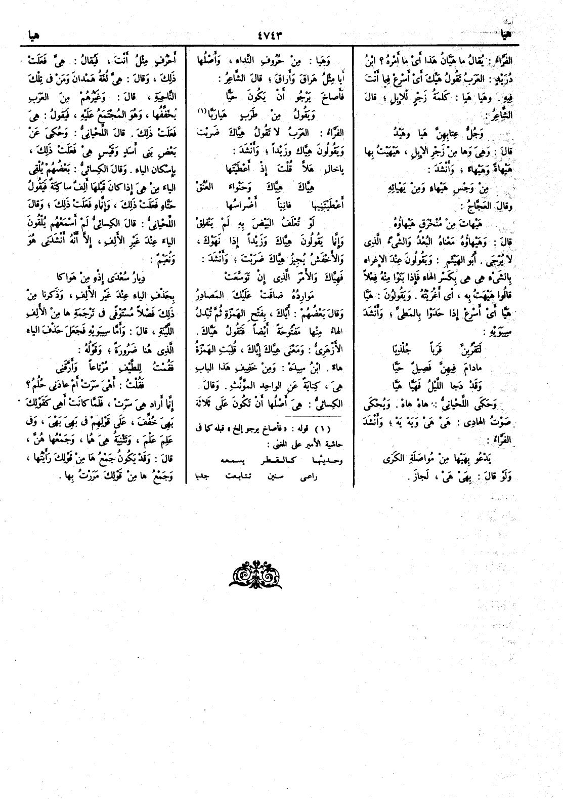 الفراء يقال ما هَيَّانُ هذا أَي ما أَمْرُه ؟ ابن دريد العرب تقول هَيِّكَ أَي أَسْرِعْ فيما أَنت فيه وهَيا هَيا كلمة زَجْر للإِبل قال الشاعر وجُلُّ عِتابِهِنَّ هَيا وهَيْدُ قال وهِي وها من زجر الإِبل هَيْهَيْت بها هَيْهاة وهَيْهاء وأَنشد مِنْ وَجْسِ هَيْهاءٍ ومِنْ يَهْيائِه وقال العجاج هَيْهاتَ مِنْ مُنْخَرِقٍ هَيْهاؤه قال وهَيْهاؤه معناه البُعْدُ والشيء الذي لا يُرْجَى أَبو الهيثم ويقولون عند الإِغراء بالشيء هِي هِي بكسر الهاء فإِذا بَنوا منه فعلاً قالوا هَيْهَيْتُ به أَي أَغْرَيْتُه ويقولون هَيَّا هَيَّا أَي أَسْرِعْ إِذا حدوا بالمَطِيّ وأَنشد سيبويه لَتَقْرُبِنَّ قَرَباً جُلْذِيّا ما دامَ فِيهِنَّ فَصِيلٌ حَيَّا وقد دَجا الليلُ فَهَيَّا هَيَّا وحكى اللحياني هاه هاه ويحكى صوت الهادِي هَيْ هَيْ ويَهْ يَهْ وأَنشد الفراء يَدْعُو بِهَيْها مِن مُواصلةِ الكَرَى ولو قال بِهَيْ هَيْ لجاز وهَيا من حروف النداء وأَصلها أَيا مثل هَراق وأَراق قال الشاعر فأَصاخَ يَرْجُو أَنْ يكُونَ حَيّاً ويقُولُ مِنْ طَرَبٍ هَيا رَبَّا