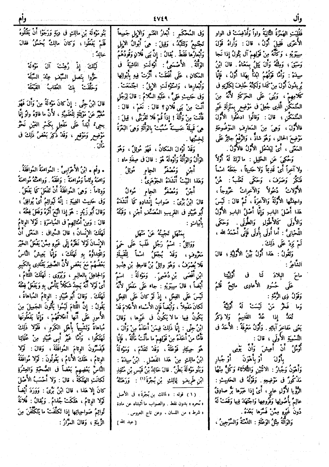 فقلبت الهمزة الثانية واواً وأُدغمت في الواو الأُخرى فقيل أَوَّل قال وأُراه قول سيبويه وكأَنه من قولهم آل يَؤُولُ إِذا نجا وسبق ومثله وأَلَ يَئِل بمعناه قال ابن سيده وأَما قولهم ابْدَأْ بهذا أَوَّلُ فإِنما يريدون أَوَّلَ من كذا ولكنه حذف لكثرته في كلامهم وبُنِيَ على الحركة لأَنه من المتمكِّن الذي جعل في موضع بمنزلة غير المتمكِّن قال وقالوا ادخُلُوا الأَوَّلَ فالأَوَّلَ وهي من المَعارف الموضوعة موضع الحال وهو شاذ والرفع جائز على المعنى أَي ليَدْخُل الأَوَّلُ فالأَوَّلُ وحكي عن الخليل ما ترَك أَوَّلاً ولا آخِراً أَي قديماً ولا حديثاً جعله اسماً فنكَّر وصرَف وحكى ثعلب هنَّ الأَوَّلاتُ دُخولاً والآخِراتُ خروجاً واحدتها الأَوَّلة والآخرة ثم قال ليس هذا أَصل الباب وإِنما أَصل الباب الأَوَّل والأُولى كالأَطْوَل والطُّولى وحكى اللحياني أَما أُولَى بأُولى فإِنِّي أَحمَد الله لم يزدْ على ذلك وتقول هذا أَوَّلُ بَيّنُ الأَوَّلِيَّة قال الشاعر ماحَ البِلادَ لنا في أَوْلِيَّتِنا على حَسُود الأَعادي مائحٌ قُثَمُ وقول ذي الرمة وما فَخْرُ مَن لَيْسَتْ له أَوَّلِيَّةٌ تُعَدُّ إِذا عُدَّ القَديمُ ولا ذِكْرُ يعني مَفاخِر آبائه وأَوَّلُ معرفةً الأَحَدُ في التَّسمية الأُولى قال أُؤَمِّلُ أَنْ أَعِيشَ وأَنَّ يَوْمي بأَوَّلَ أَو بأَهْوَنَ أَو جُبَارِ وأَهْوَن وجُبَار الاثنين والثلاثاء وكل منهما مذكور في موضعه وقوله في الحديث الرُّؤْيا لأَوَّلِ عابِرٍ أَي إِذا عَبَرها بَرٌّ صادقٌ عالم بأُصولها وفُروعها واجتهدَ فيها وقعتْ له دون غيره ممن فَسَّره بعدَه والوَأْلَةُ مثل الوَعْلة الدِّمْنةُ والسِّرْجِينُ وفي المحكم أَبْعارُ الغنم والإِبلِ جميعاً تجتمع وتَتَلَبَّد وقيل هي أَبوالُ الإِبل وأَبْعارُها فقط يقال إِن بَني فلان وَقُودُهم الوَأْلة الأَصمعي أَوْأَلَتِ الماشيةُ في المكان على أَفْعَلَتْ أَثَّرت فيه بأَبْوالها وأَبْعارها واسْتَوْأَلَتِ الإِبلُ اجتمعت وفي حديث عليّ عليه السلام قال لرجل أَنت من بَني فلان ؟ قال نَعَم قال فأَنت من وَأْلةَ إِذاً قُمْ فلا تقرَبَنِّي قيل هي قبيلة خسيسةٌ سميت بالوَأْلةِ وهي البعرة لخسَّتها وقد أَوْأَل المكانُ فهو مُوئِل وهو الوَأْلُ والوَأْلةُ وأَوْأَلَهُ هو قال في صفة ماء أَجْنٍ ومُصْفَرِّ الجِمامِ مُوئِل وهذا البيت أَنشده الجوهري أَجْنٌ ومُصْفَرُّ الجِمامِ مُوأَلُ قال ابن بري صواب إِنشاده كما أَنشده أَبو عبيد في الغريب المصنَّف أَجْنٍ وقبله بأَبيات بمَنْهَلٍ تَجْبِينه عن مَنْهَلِ ووَائل اسم رجل غلَب على حيٍّ معروف وقد يُجْعَل اسماً للقبيلة فلا يُصرف وهو وائل بنُ قاسِط بن هِنْب بنِ أَفْصَى بنِ دُعْمِيٍّ ومَوْأَلةُ اسم أَيضاً قال سيبويه جاء على مَفْعَل لأَنه ليس على الفعل إِذ لو كان على الفعل لكان مَفْعِلاً وأَيضاً فإِن الأَسماءَ الأَعْلامَ قد يكون فيها ما لا يكون في غيرها وقال ابن جني إِنما ذلك فيمن أَخذه من وَأَلَ فأَما من أَخذه من قولهم ما مأَلْت مَأْلَةً فإِنما هو حينئذ فَوْعَلة وقد تقدم ومَوْأَلةُ بن مالك من هذا الفصل ابن سيده وبنُو مَوْأَلةَ بطْن قال خالد ابنُ قَيْس بنِ مُنْقِذ بن طريف لمالك بن بُحَبره